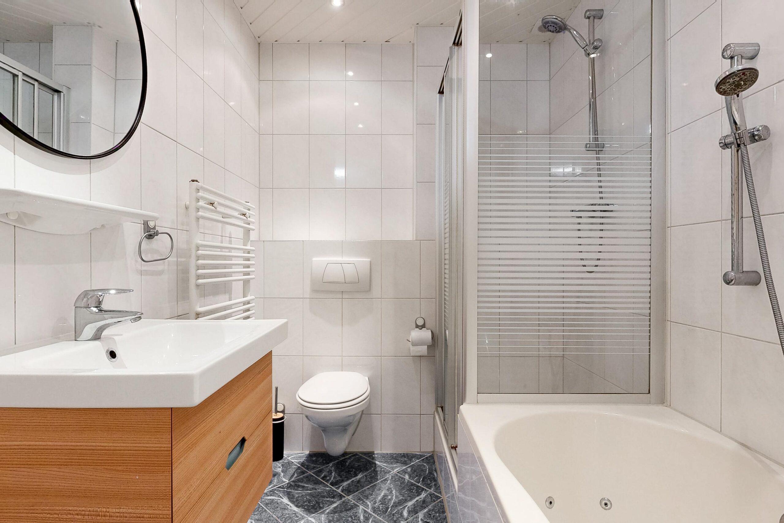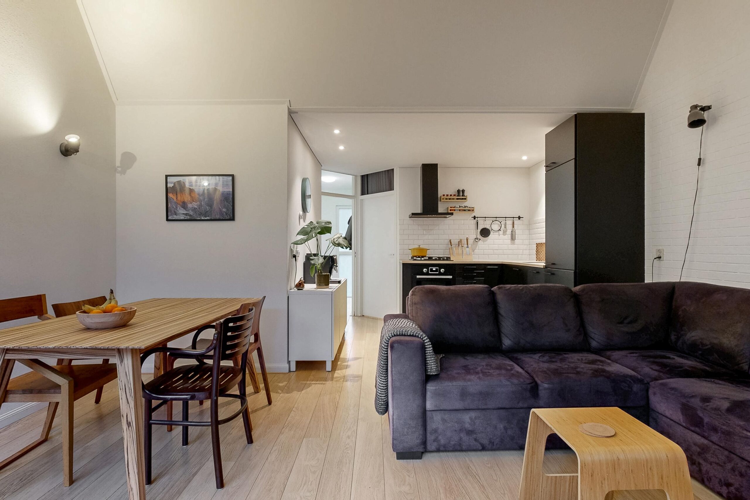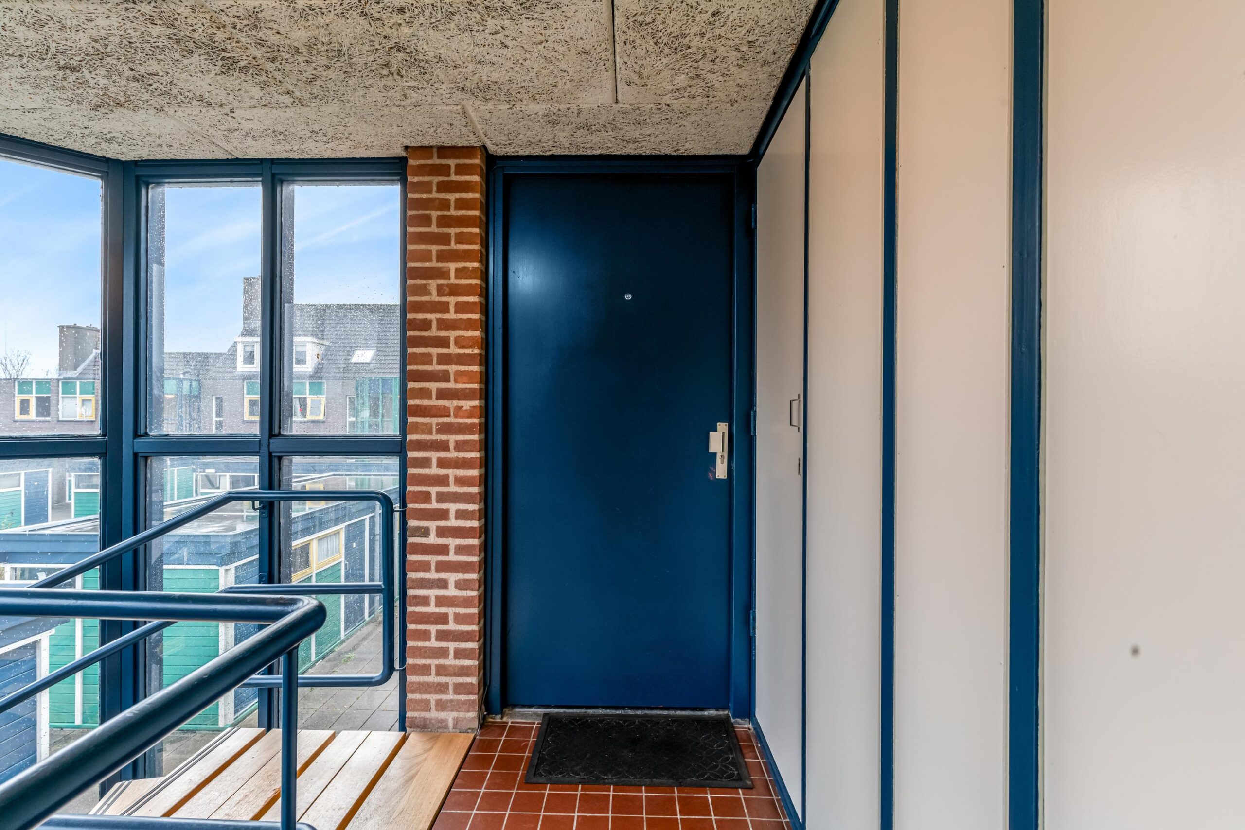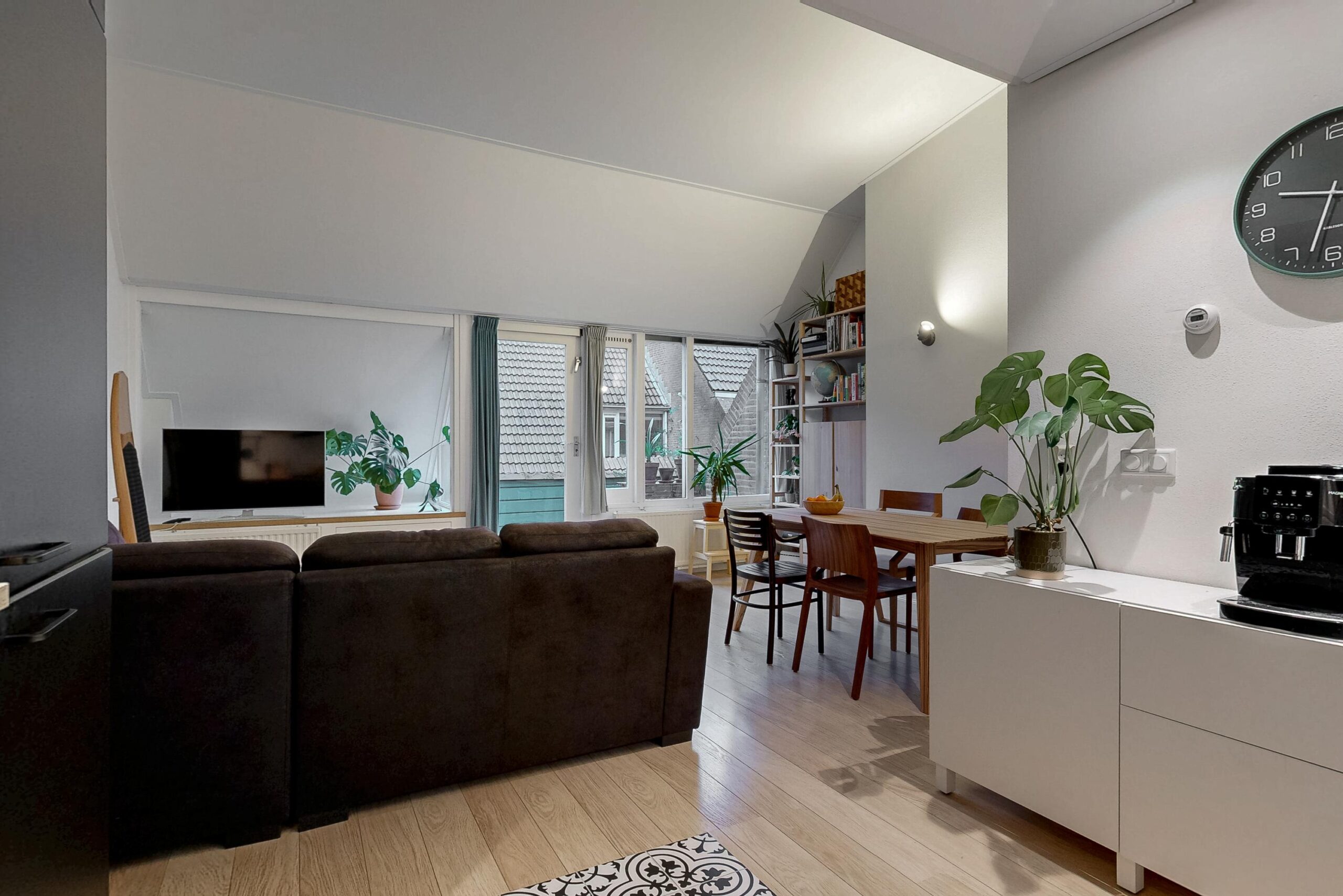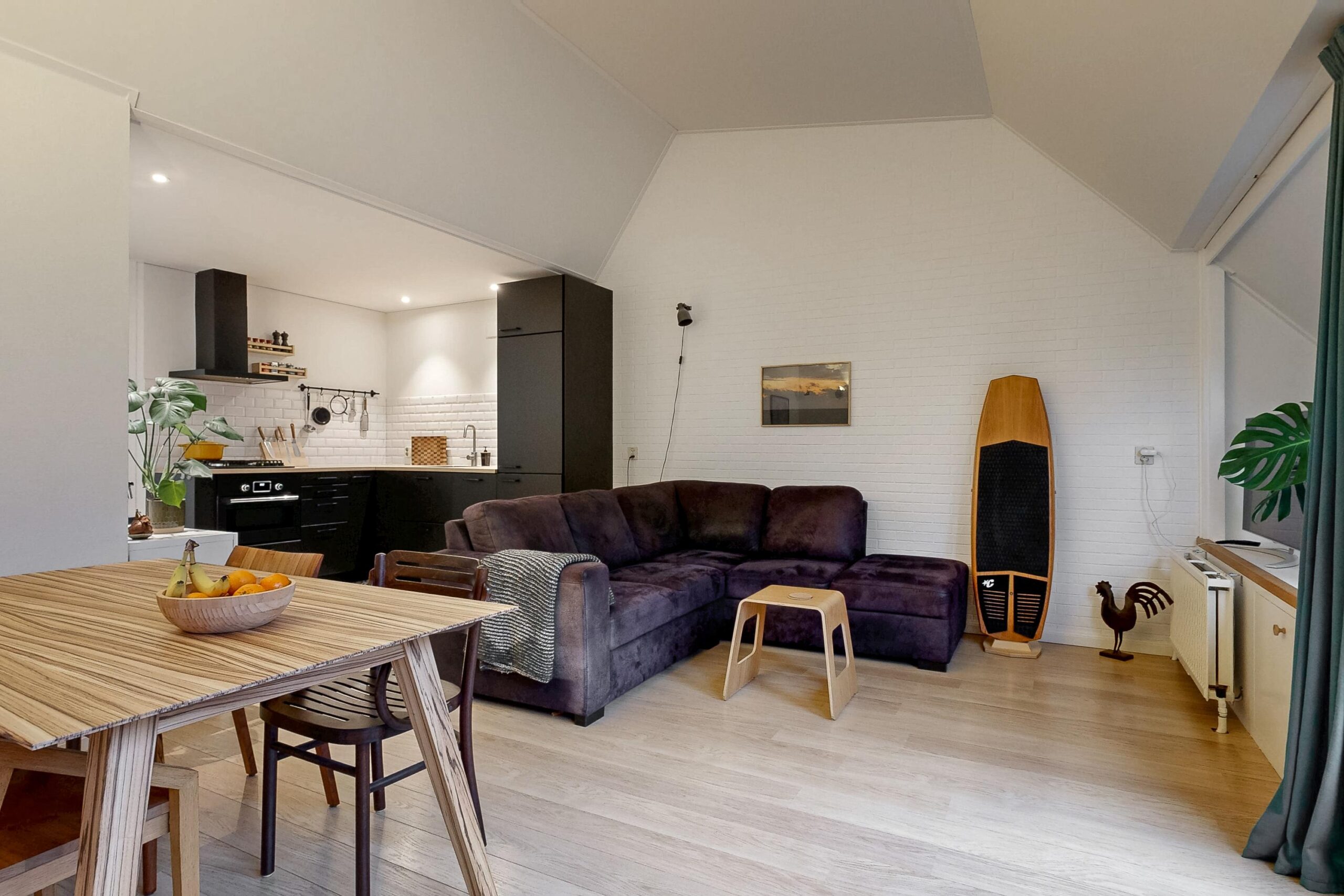 Indeling: hal met toegang tot de cv-/wasmachineruimte, complete badkamer voorzien van whirlpool, douchecabine, toilet, designradiator en wastafelmeubel. Ruime slaapkamer met vaste kastenwand. De open keuken is uitgevoerd met een fraaie plavuizen vloer en een zwarte L-vormige keukenunit voorzien van koelkast/vriezer, combimagnetron, vaatwasser, gascomfort en afzuigkap. De woonkamer beschikt over een laminaatvloer, hoog plafond, diverse mobiele bergruimtes en biedt toegang tot de ruime, zonnige loggia op het zuidwesten.