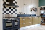 groot 6 pits gasfornuis met dubbele oven, vaatwasser, koelkast, 3 laden vriezer en stoomoven. Handige bijkeuken