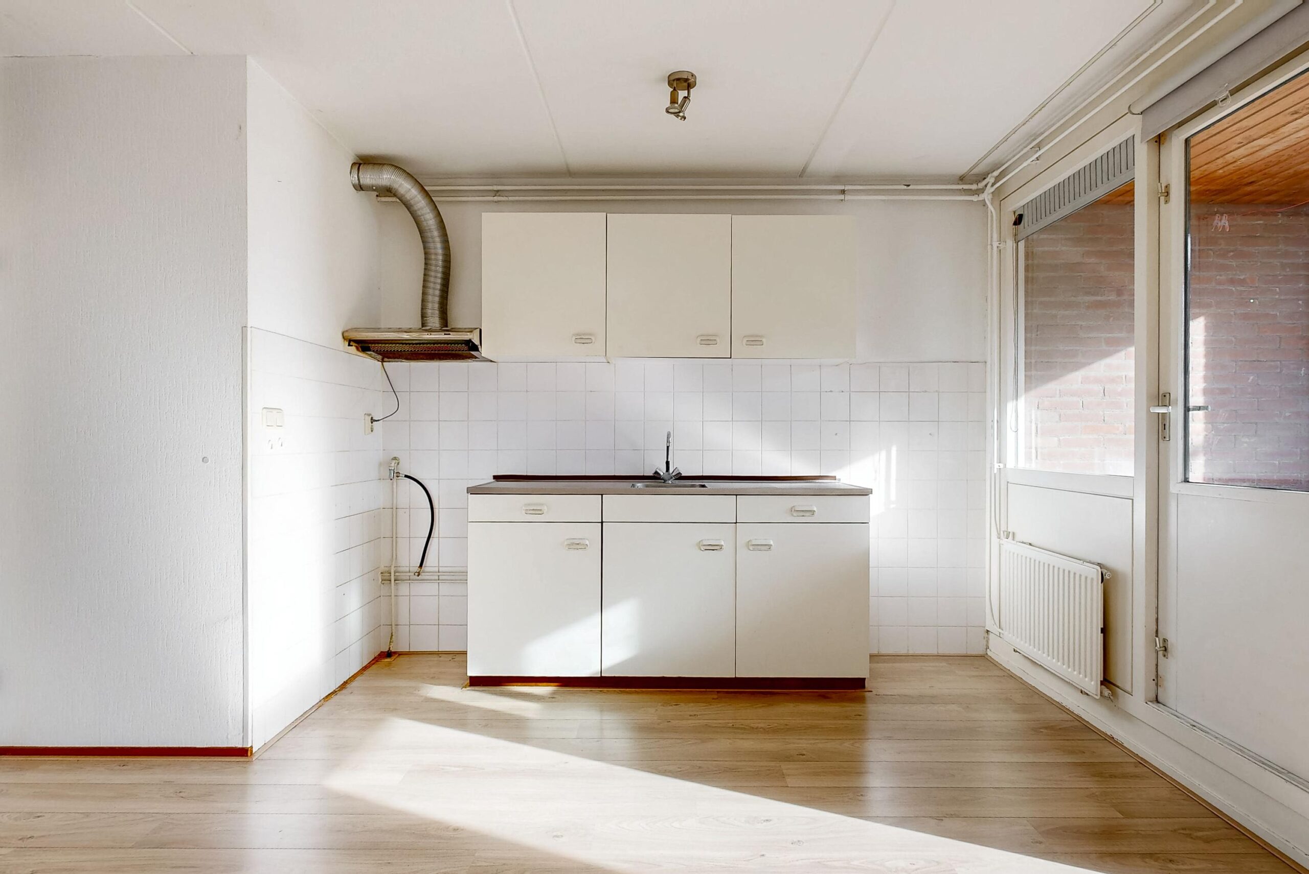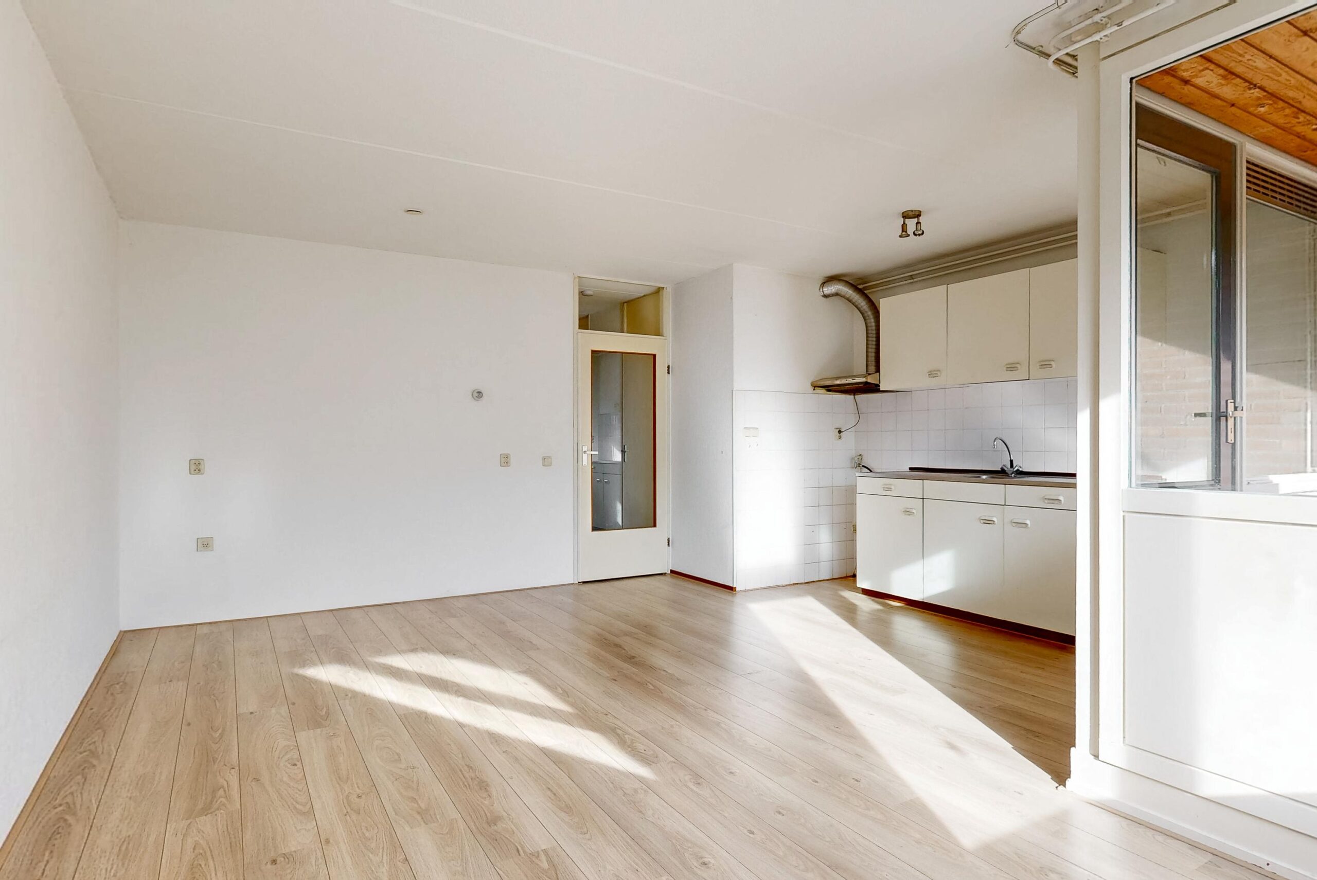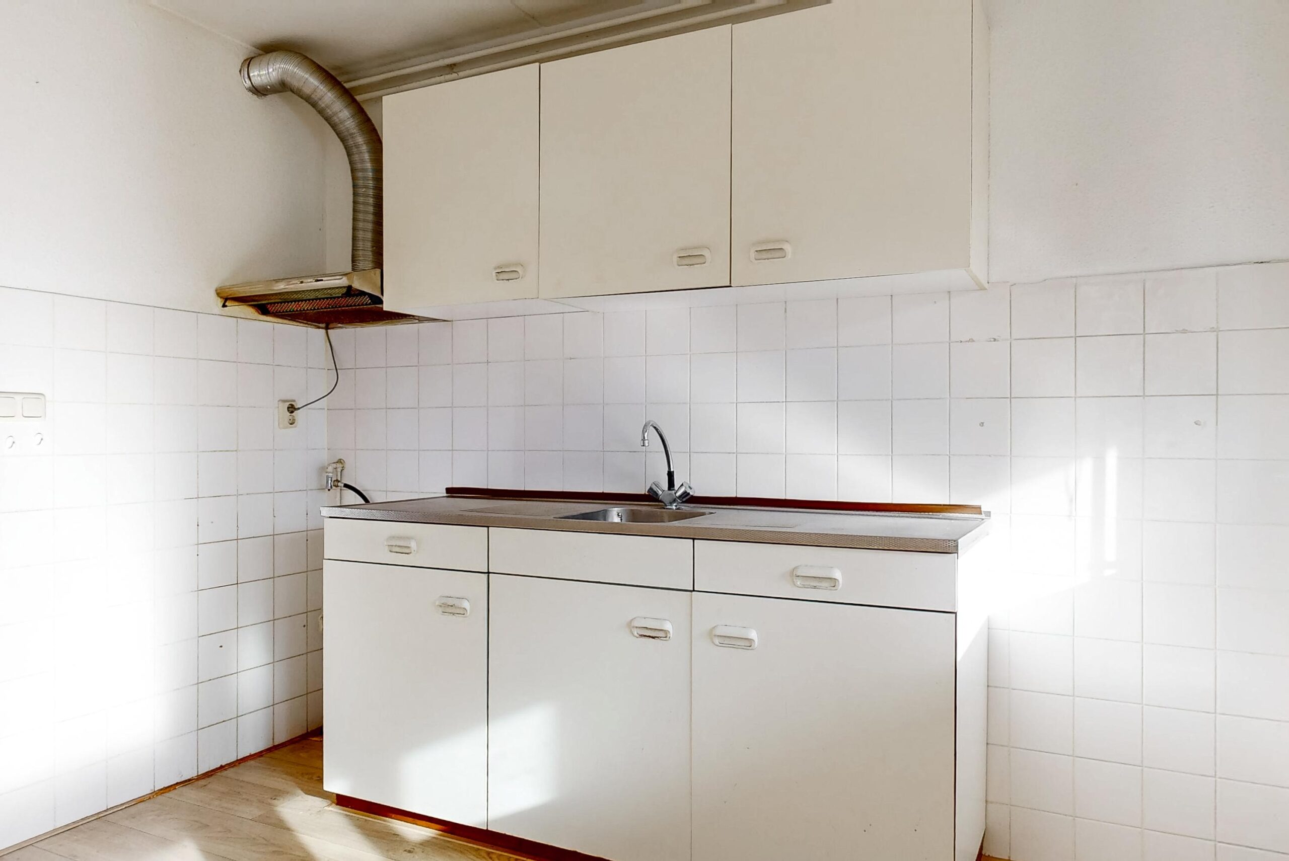 Indeling: ruime hal, cv ruimte, toilet, slaapkamer, badkamer met douche, wastafel en wasmachine-aansluiting, woonkamer met open keuken voorzien van wit recht unit en toegang tot het zonnige balkon.