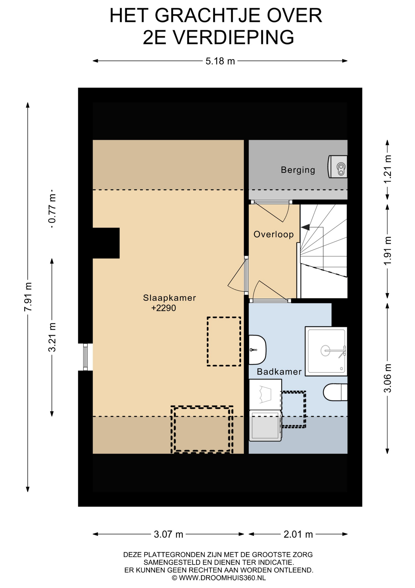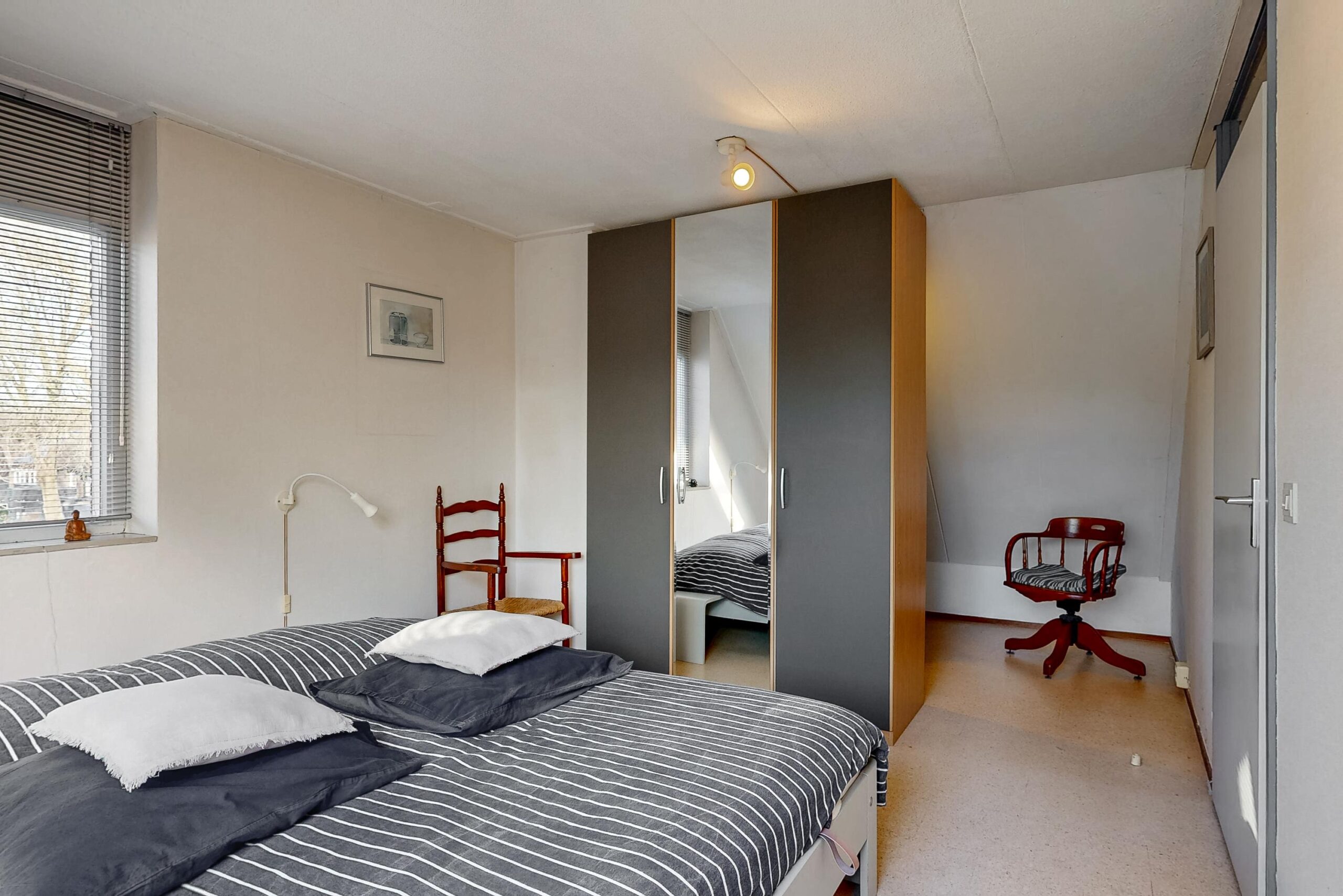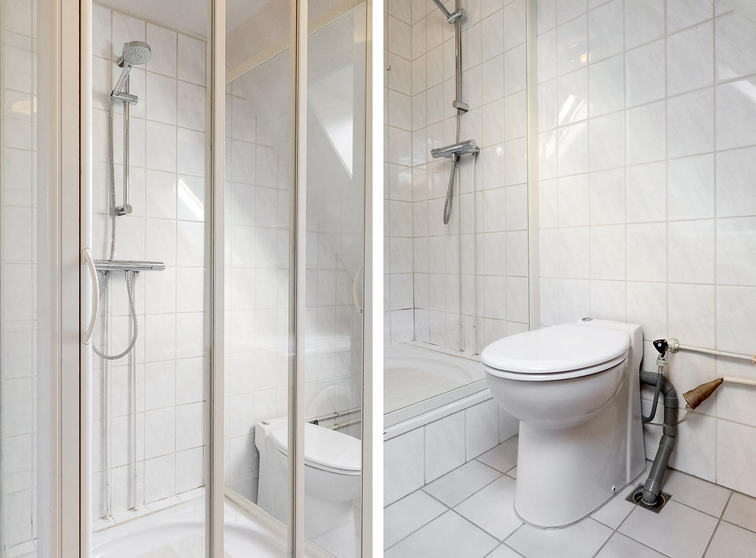 Eerste verdieping: ruime slaapkamer over de gehele lengte van het appartement, badkamer voorzien van douchecabine, sanibroyeur en wastafel.