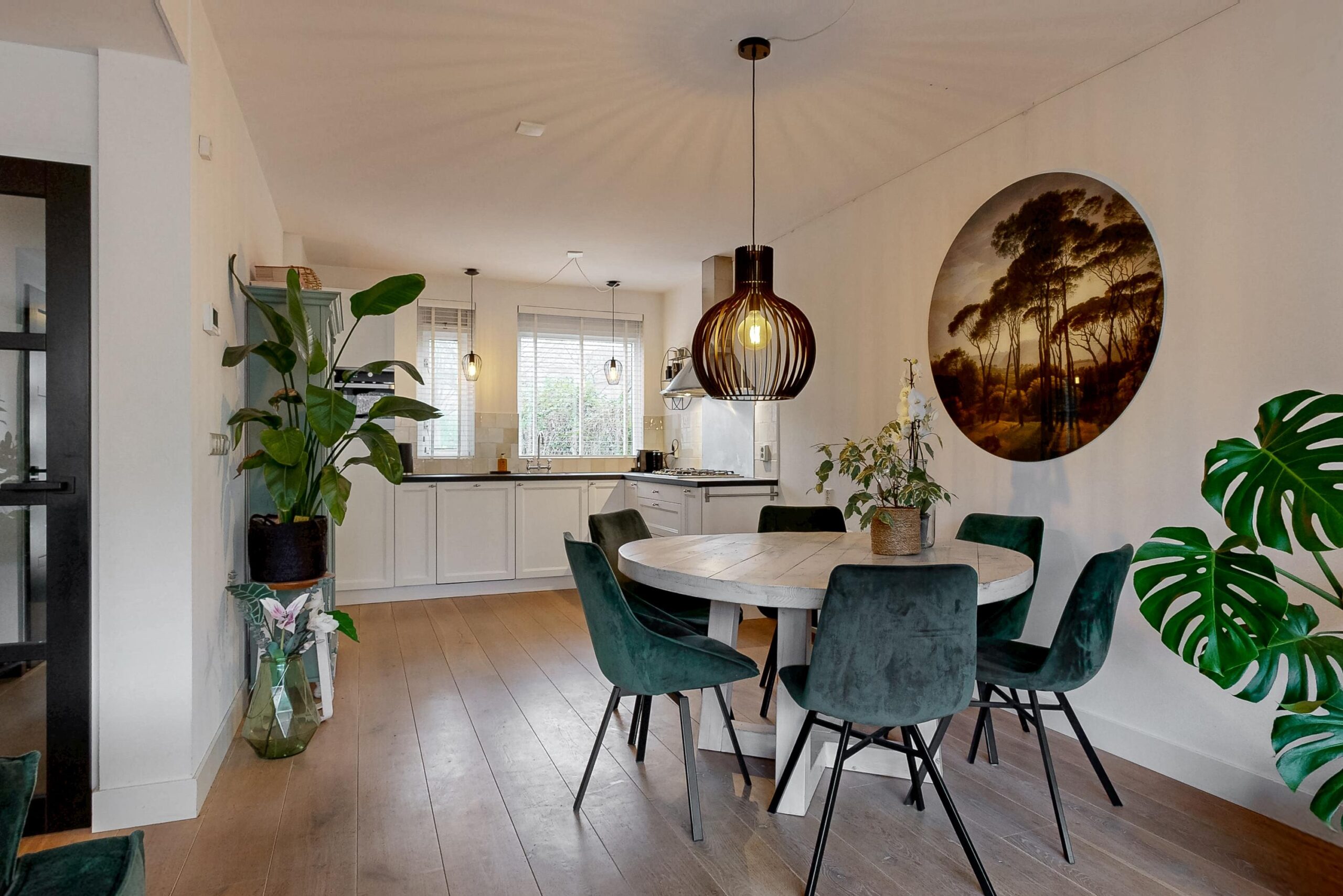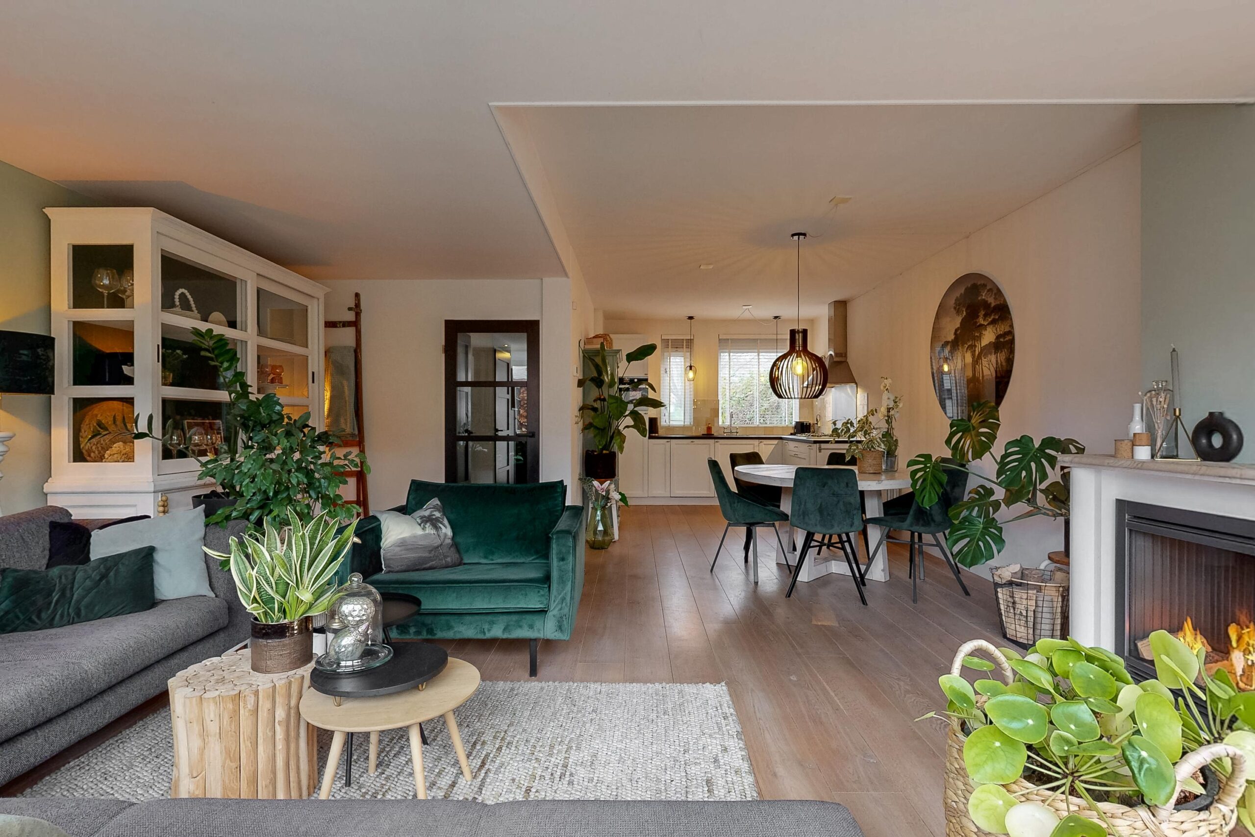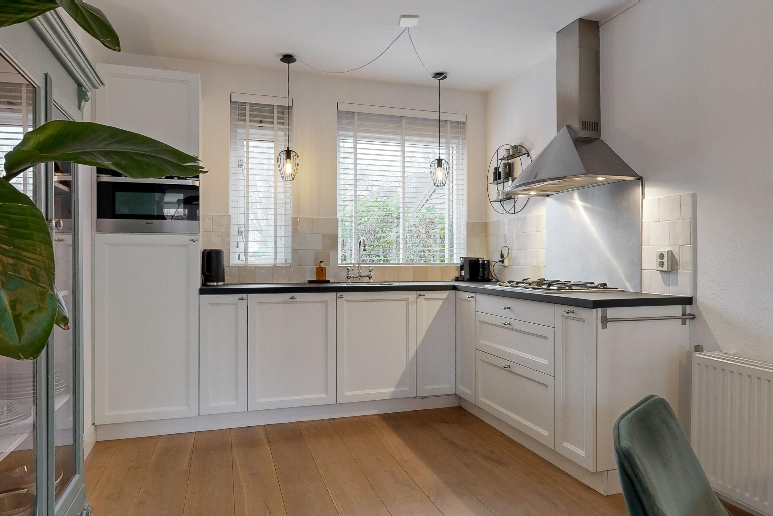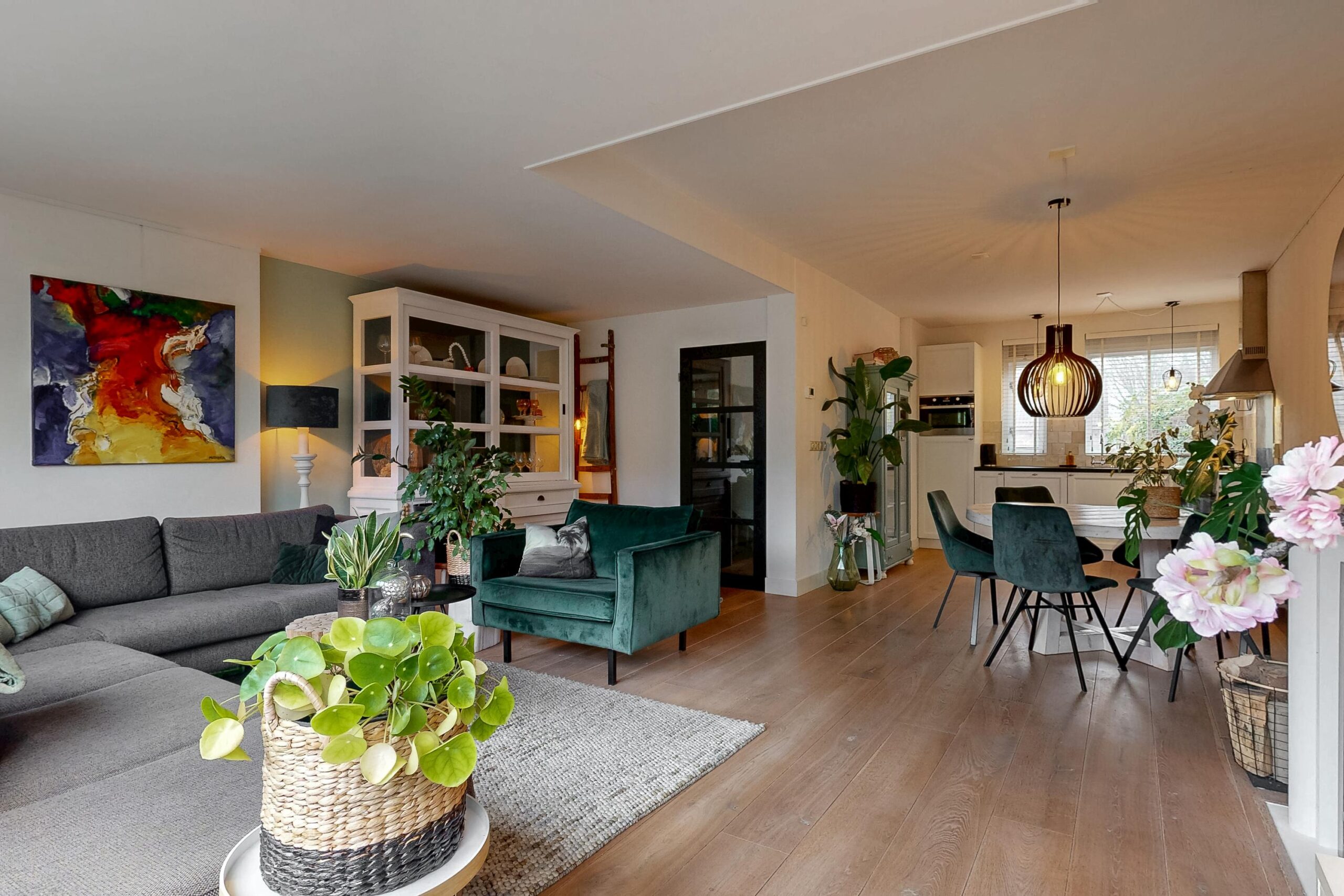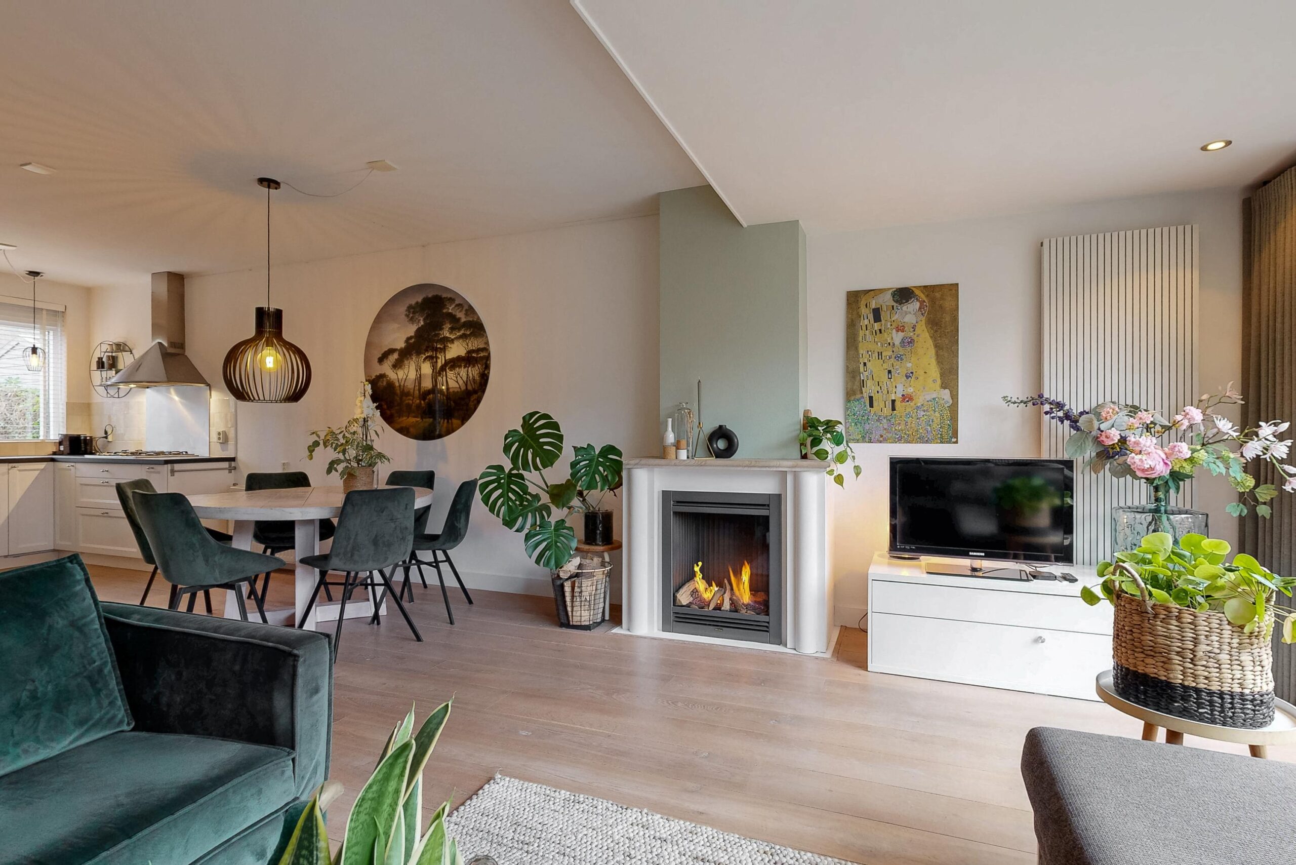 Indeling: hal met toiletruimte voorzien van wandcloset, trapopgang, binnendoor naar frontberging met wegzetvliering, uitgebouwde woonkamer met eiken toplaag plankenvloer, pleisterwerk plafond, dubbele schuifpui en gashaard, open keuken met L-vormige unit voorzien van inbouw koelkast, combimagnetron (2023), vaatwasser (2023), 5 pits gaskookplaat en RVS afzuigkap.