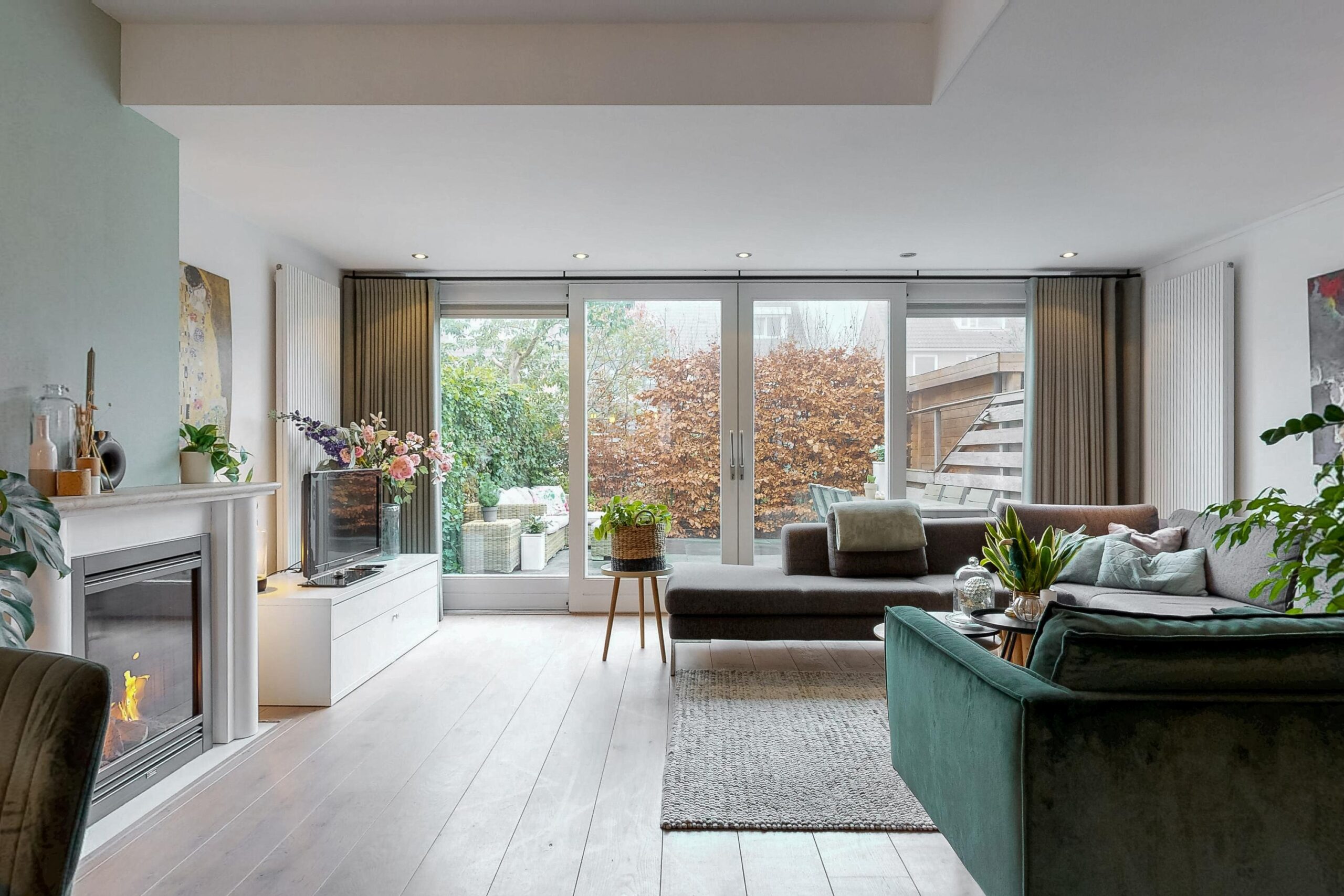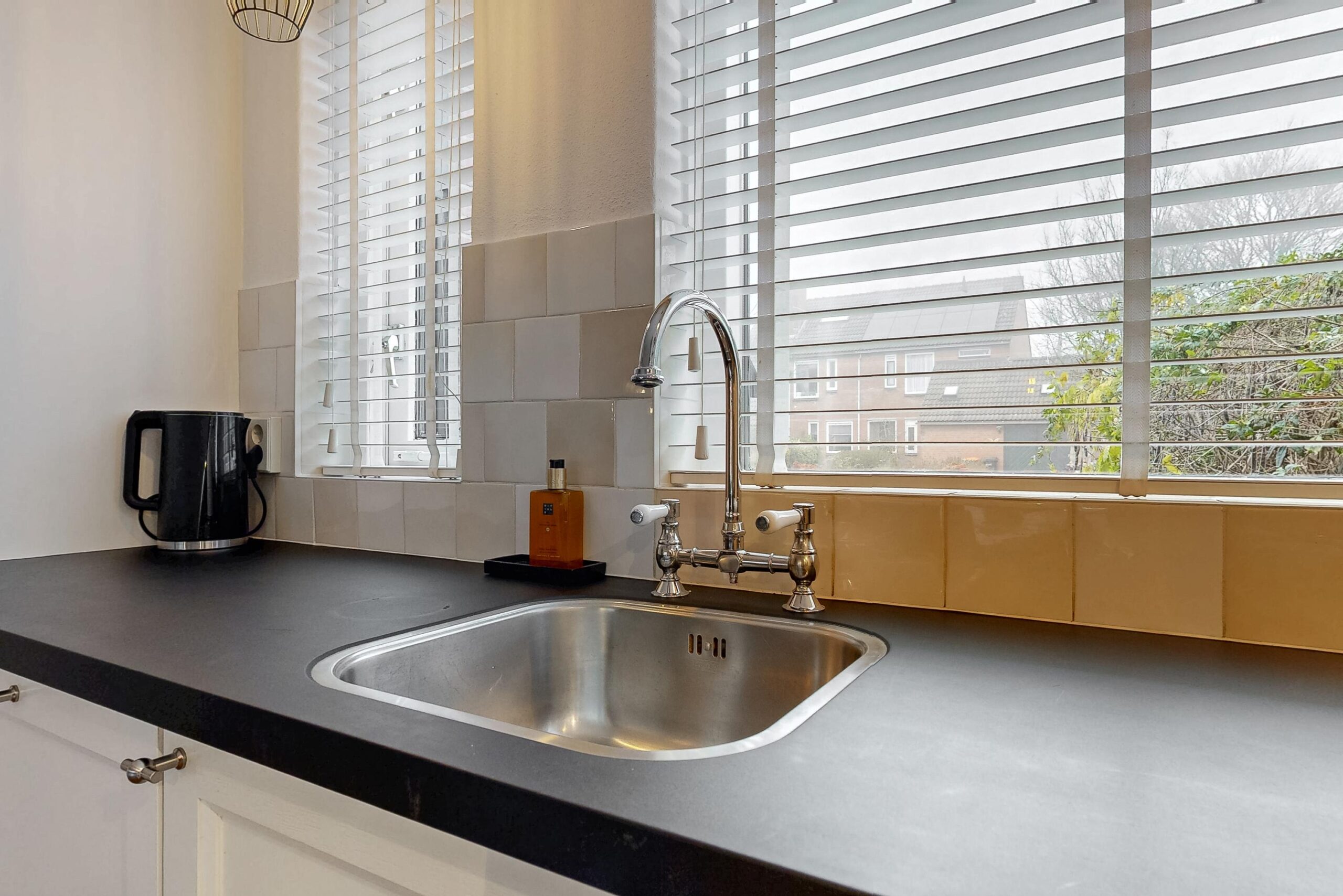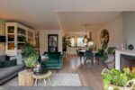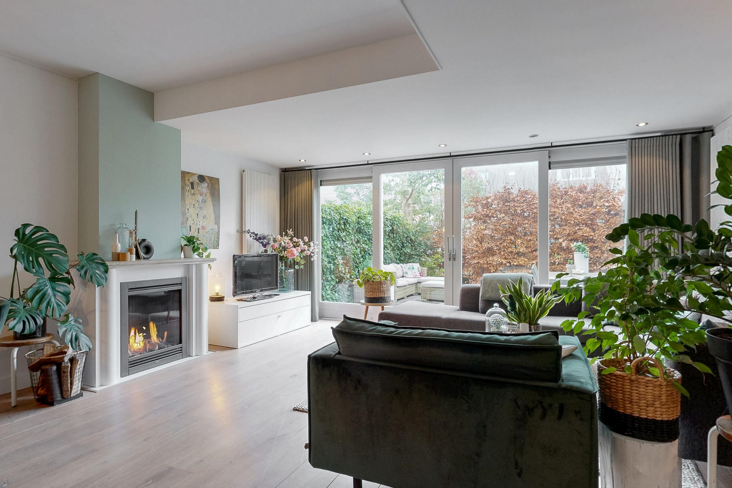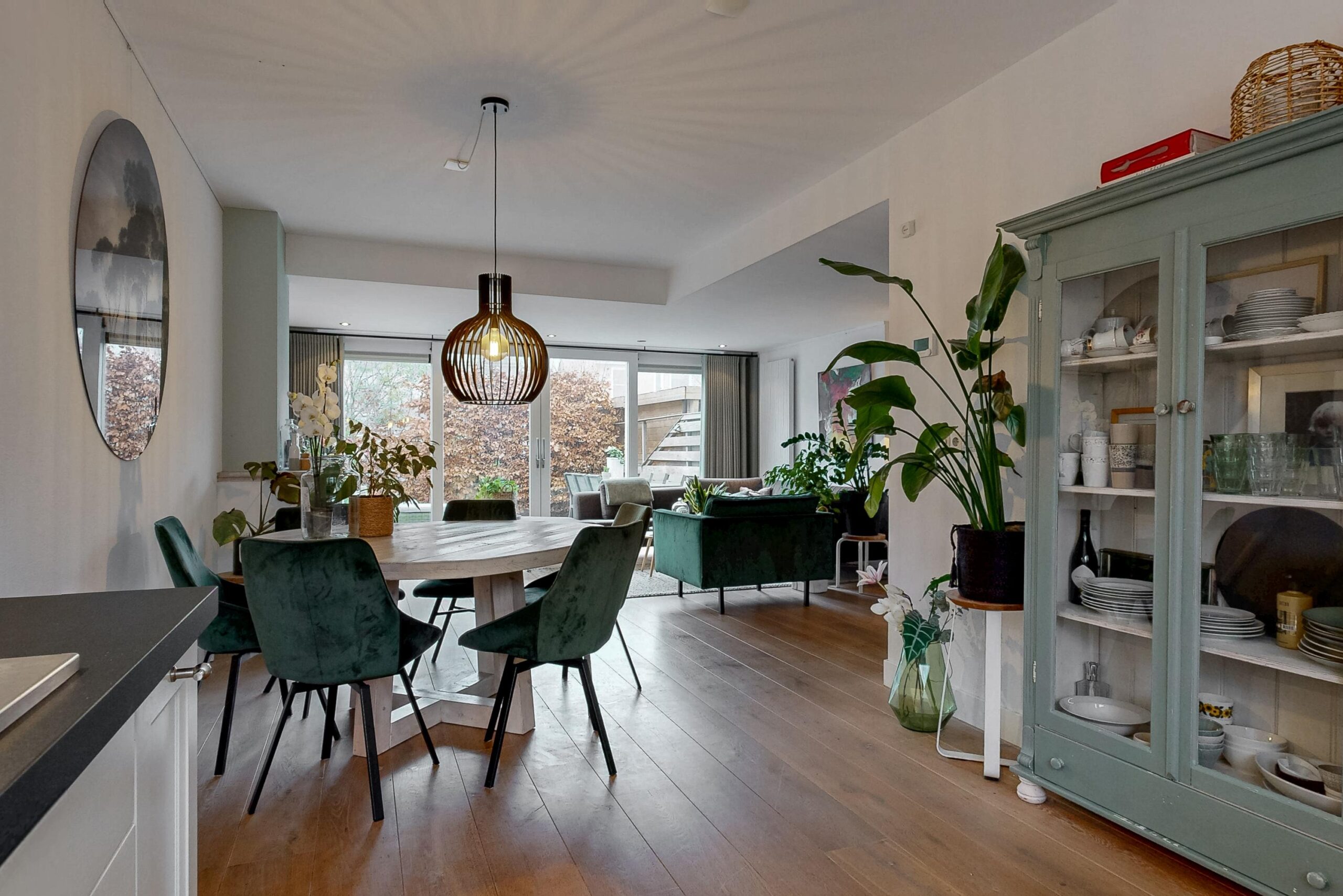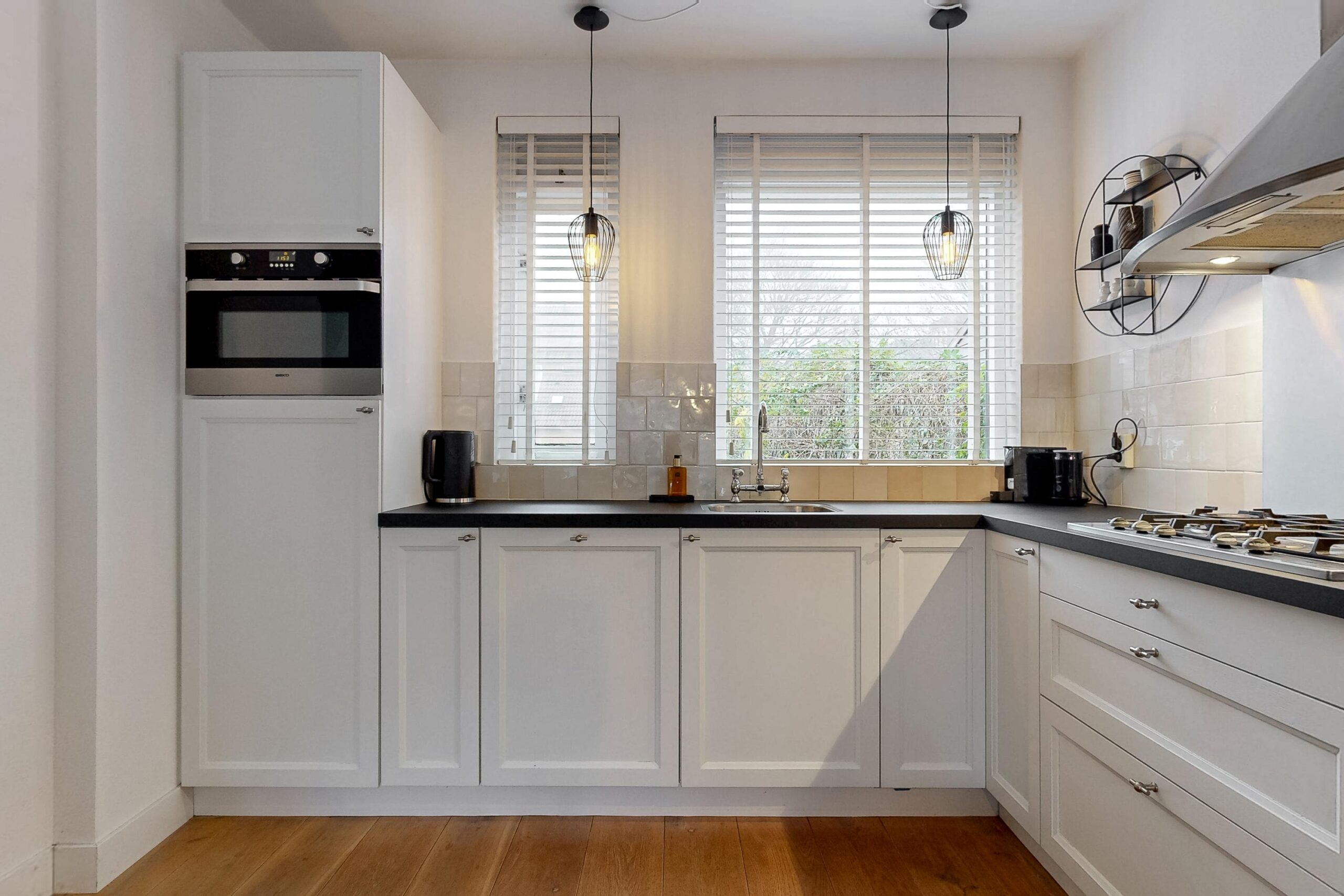 Indeling: hal met toiletruimte voorzien van wandcloset, trapopgang, binnendoor naar frontberging met wegzetvliering, uitgebouwde woonkamer met eiken toplaag plankenvloer, pleisterwerk plafond, dubbele schuifpui en gashaard, open keuken met L-vormige unit voorzien van inbouw koelkast, combimagnetron (2023), vaatwasser (2023), 5 pits gaskookplaat en RVS afzuigkap.
