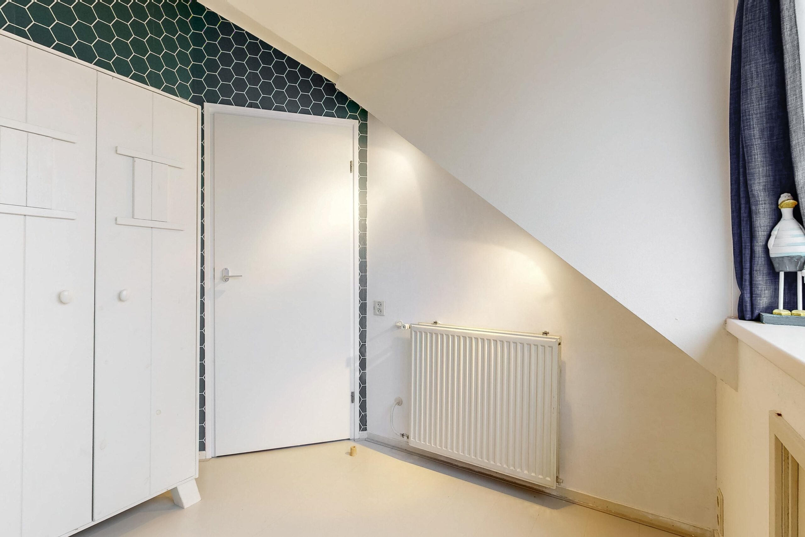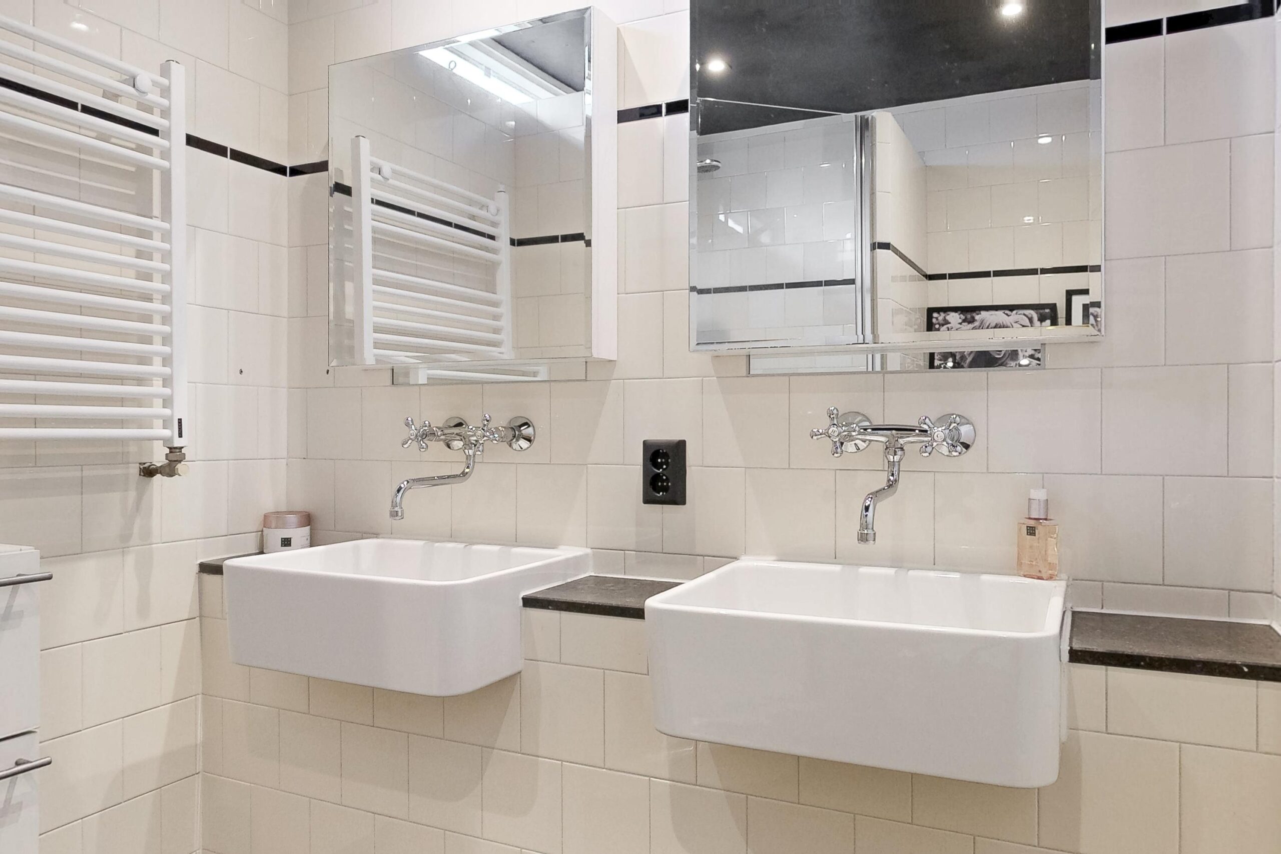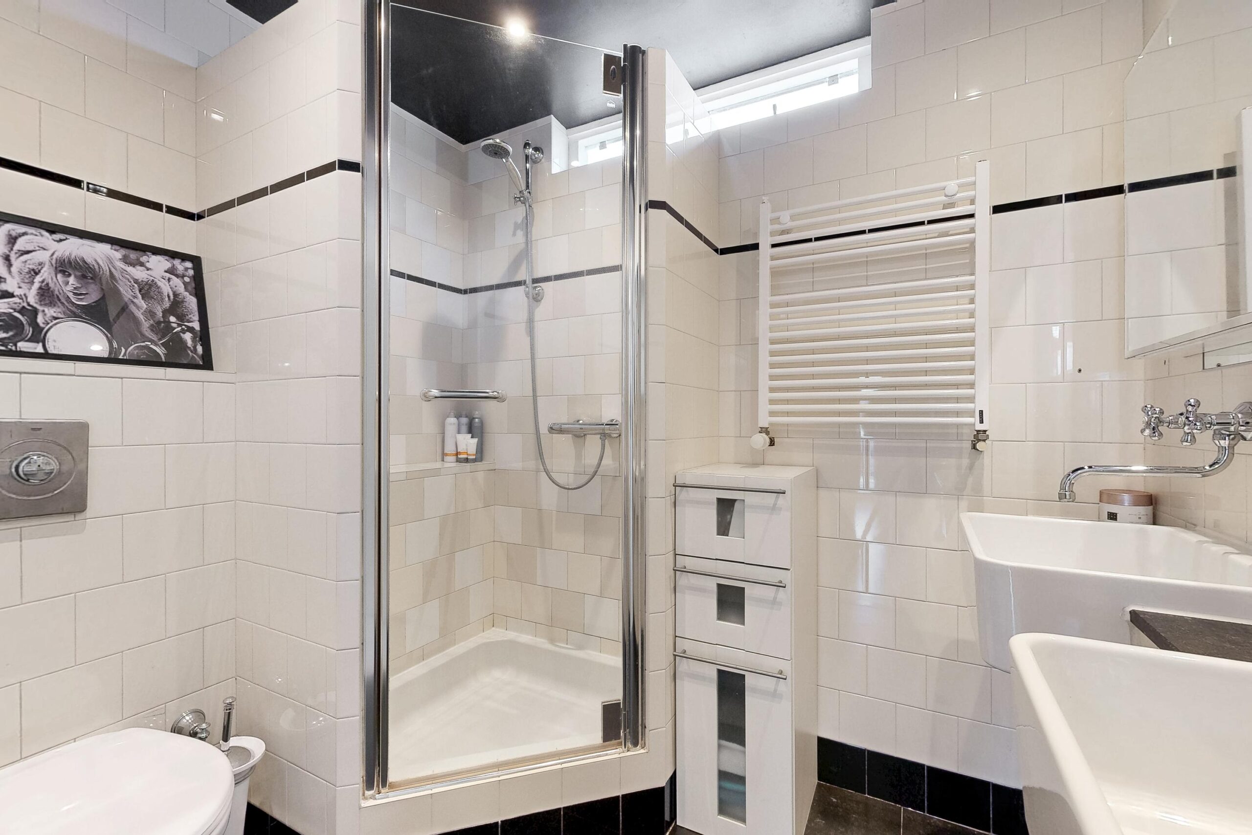 Eerste verdieping: overloop, grote slaapkamer aan de achterzijde (oorspronkelijk 2 kamers en weer eenvoudig 2 van te maken) met toegang tot dakterras, voorslaapkamer en complete badkamer in roomwitte kleurstelling met douchecabine, 2e wandcloset, dubbele wastafel en designradiator.