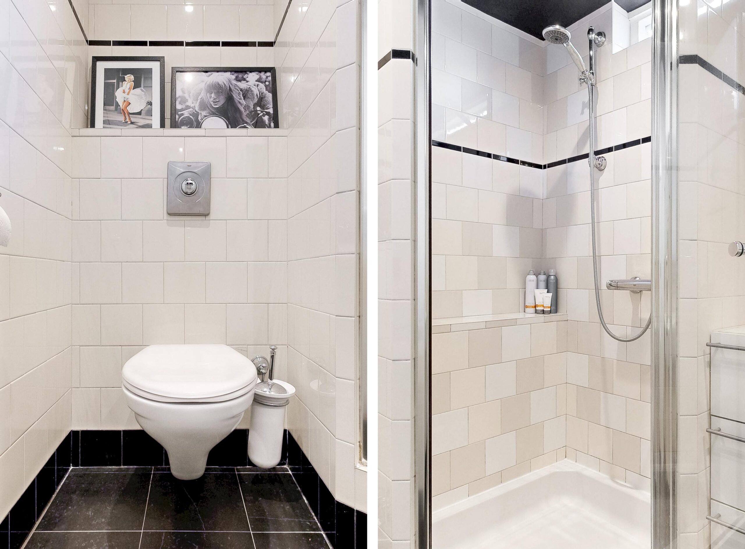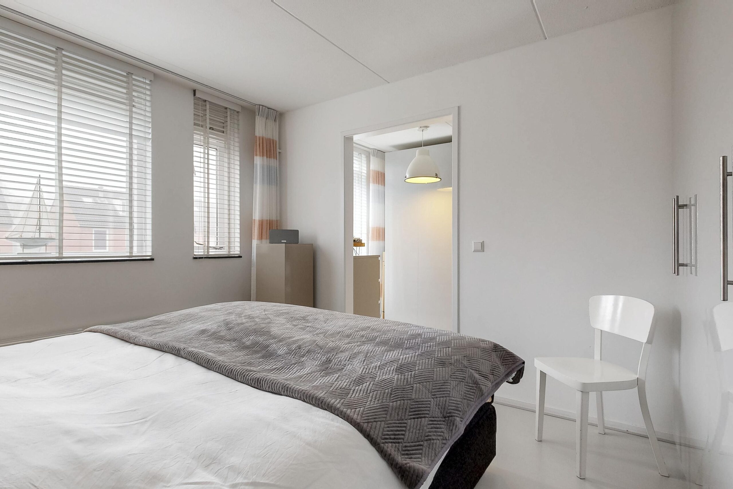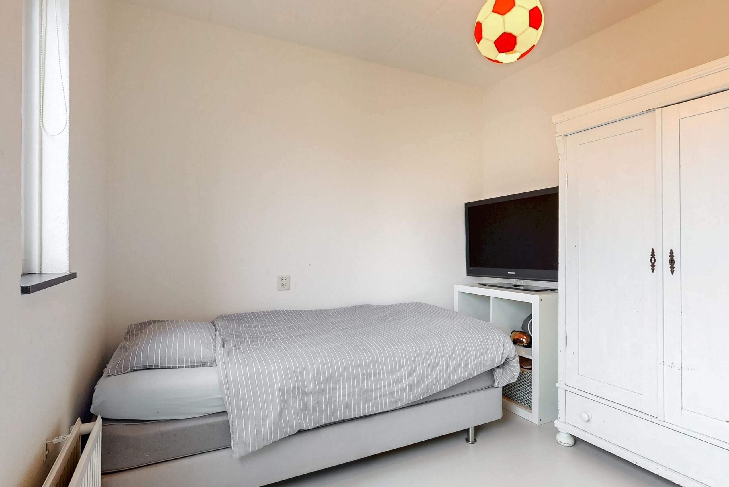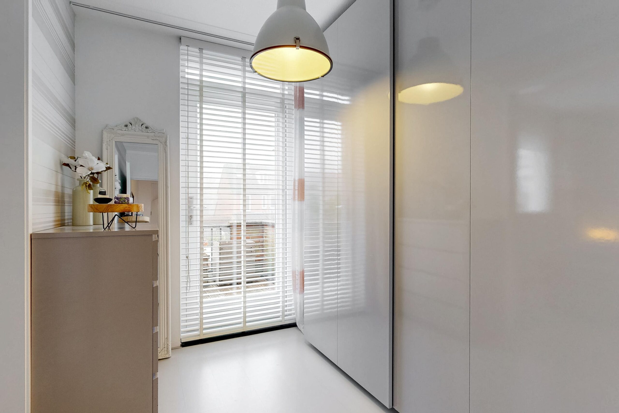 Eerste verdieping: overloop, grote slaapkamer aan de achterzijde (oorspronkelijk 2 kamers en weer eenvoudig 2 van te maken) met toegang tot dakterras, voorslaapkamer en complete badkamer in roomwitte kleurstelling met douchecabine, 2e wandcloset, dubbele wastafel en designradiator.