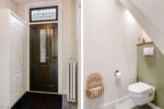 Eerste verdieping: overloop, 3 slaapkamers met hoge plafonds waarvan 2 slaapkamers aan de voorzijde en 1 ruime slaapkamer aan de achterzijde, wit/grijze badkamer met inloopdouche, 2e wandcloset, wastafel op meubel en designradiator.