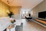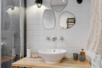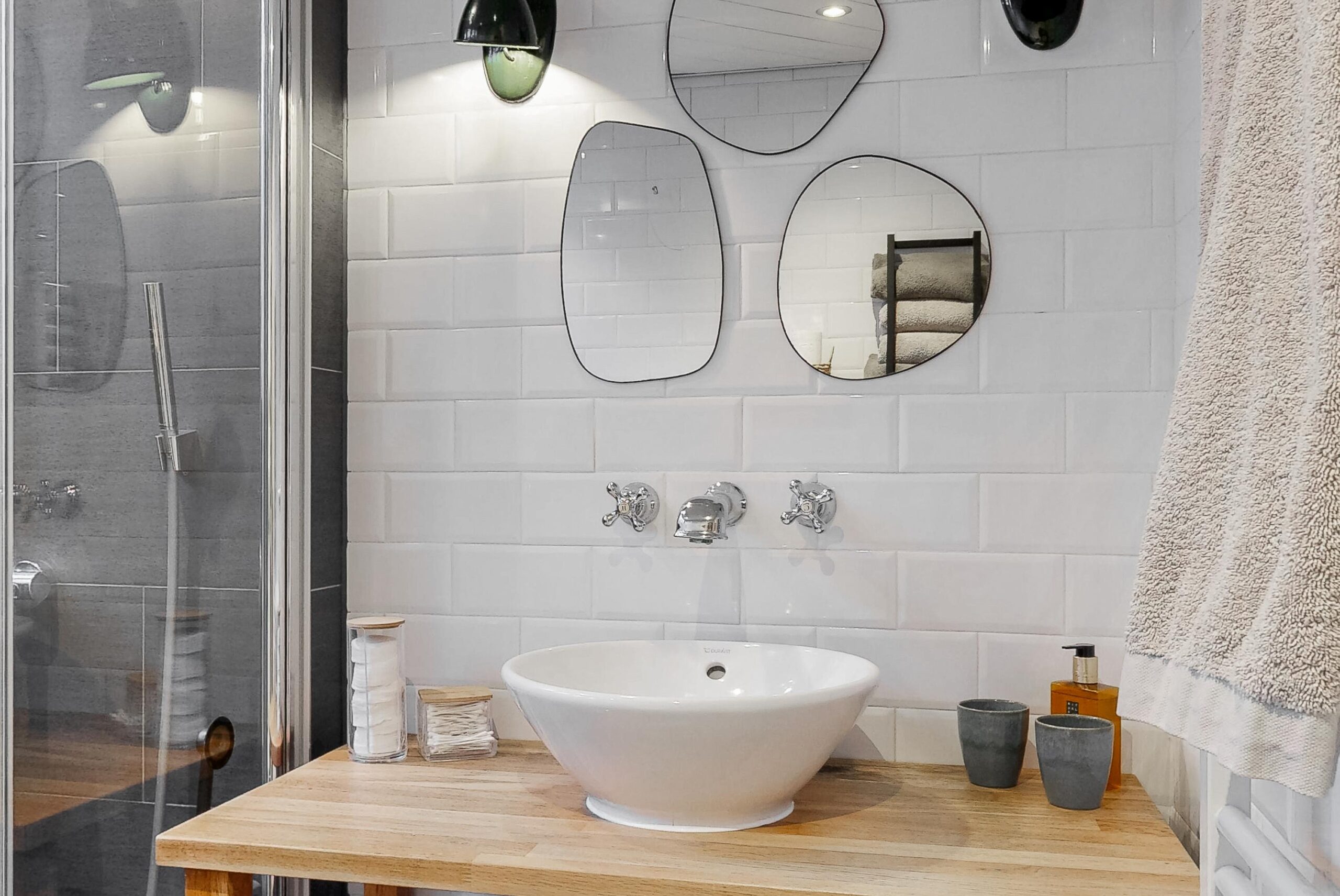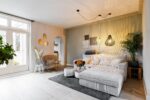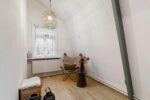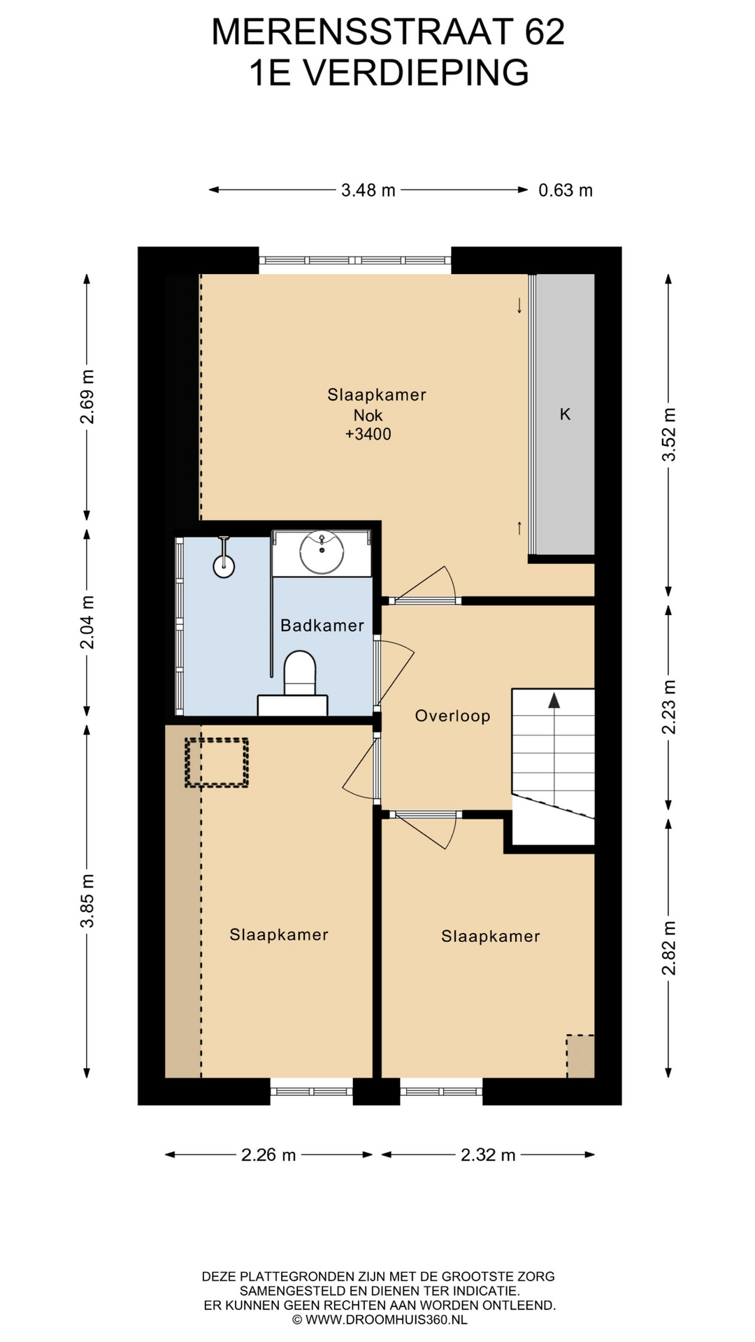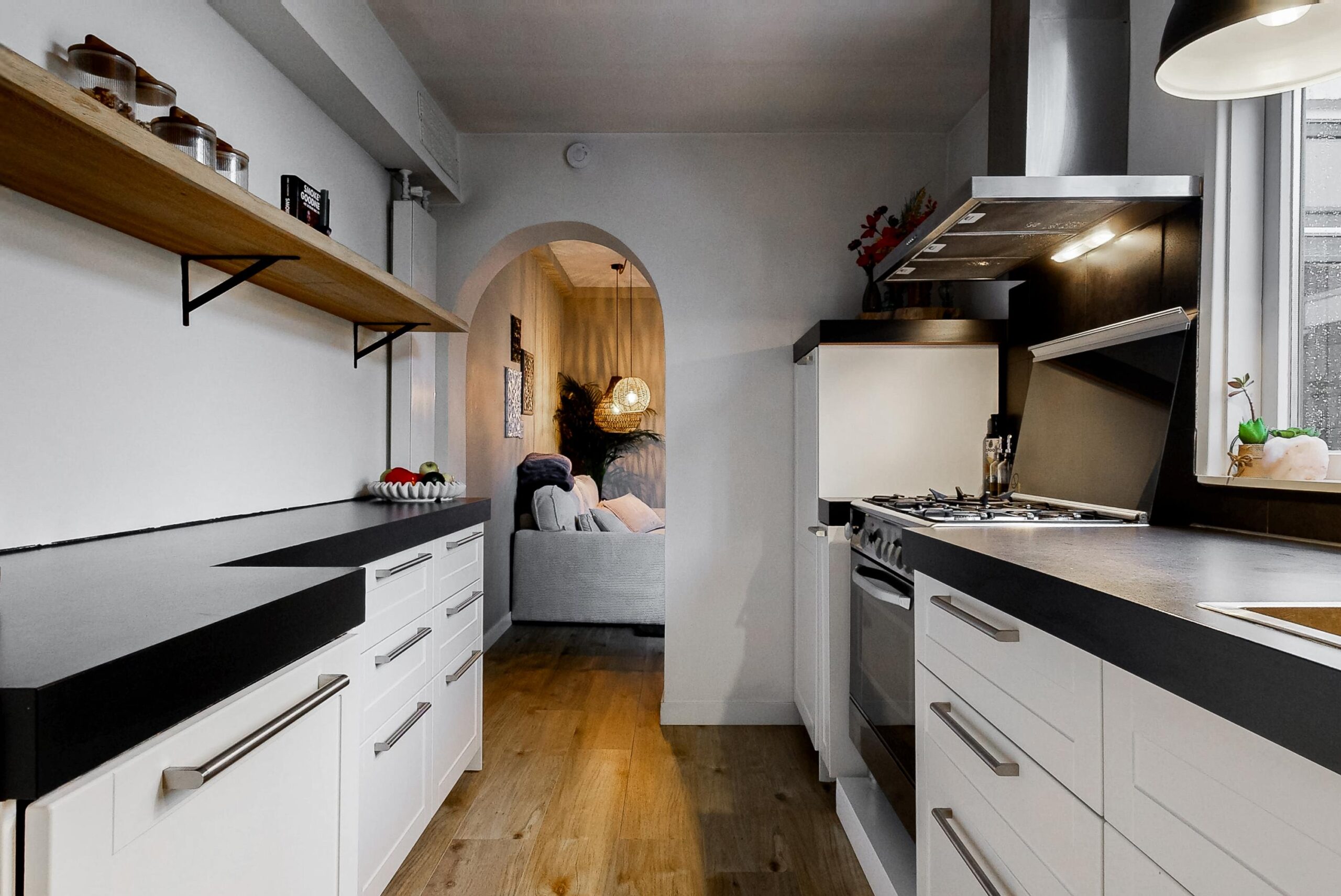 Eerste verdieping: overloop, 3 slaapkamers met hoge plafonds waarvan 2 slaapkamers aan de voorzijde en 1 ruime slaapkamer aan de achterzijde, wit/grijze badkamer met inloopdouche, 2e wandcloset, wastafel op meubel en designradiator.