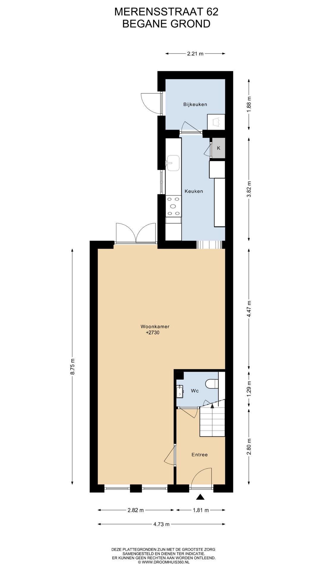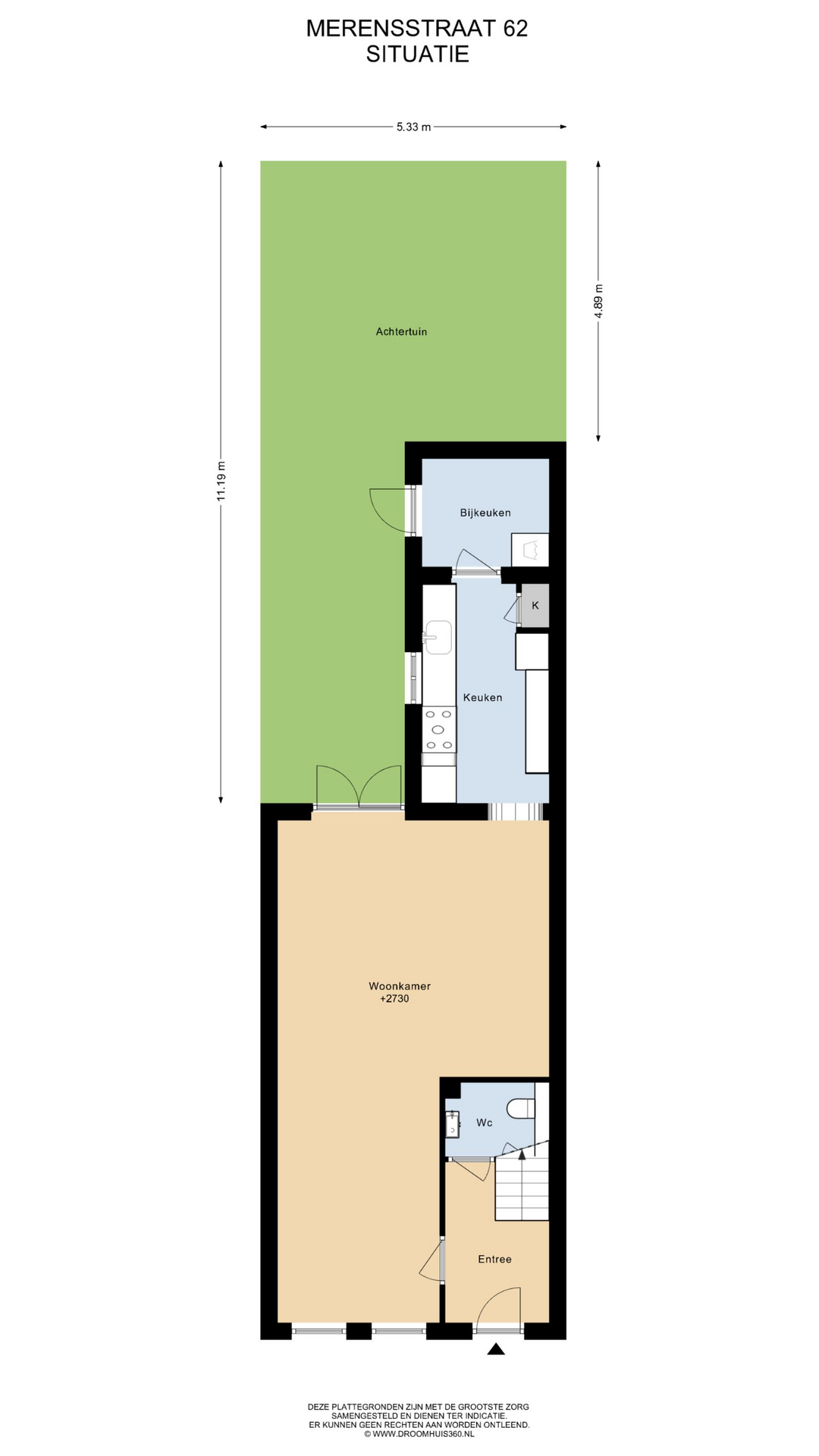 Indeling: hal met toilet en trapopgang, ruime woonkamer met hoog plafond, dubbele openslaande tuindeuren en pleisterwerk wanden en plafond, uitgebouwde keuken met dubbele rechte unit voorzien van vaatwasser, koelkast, 5-pits fornuis met elektrische oven en rvs afzuigkap, bijkeuken met wasmachineaansluiting en toegang tot de tuin.