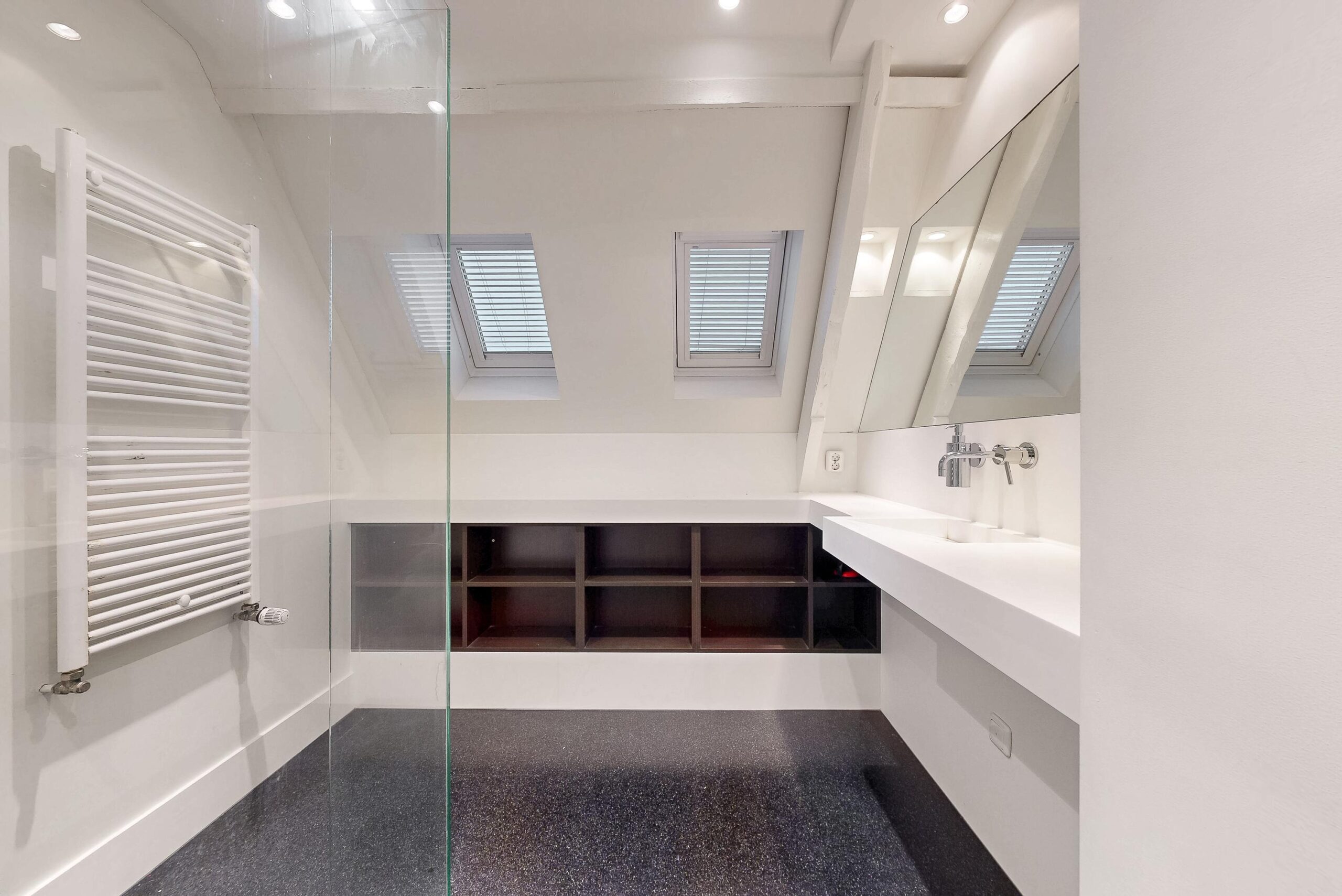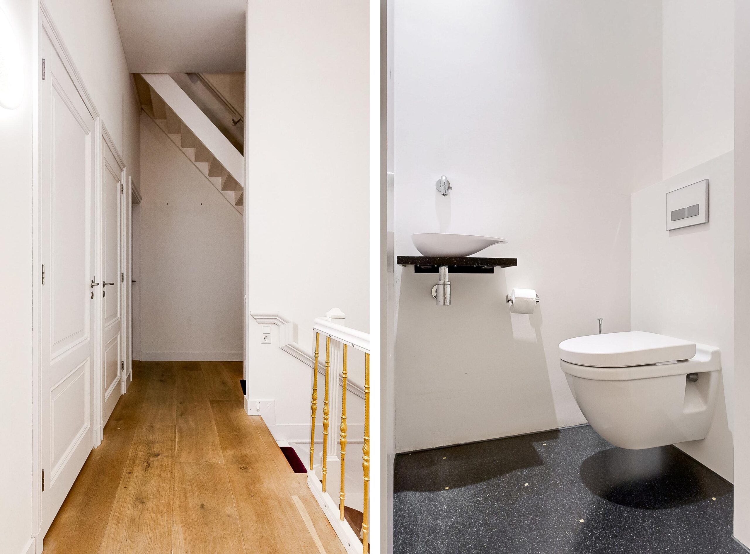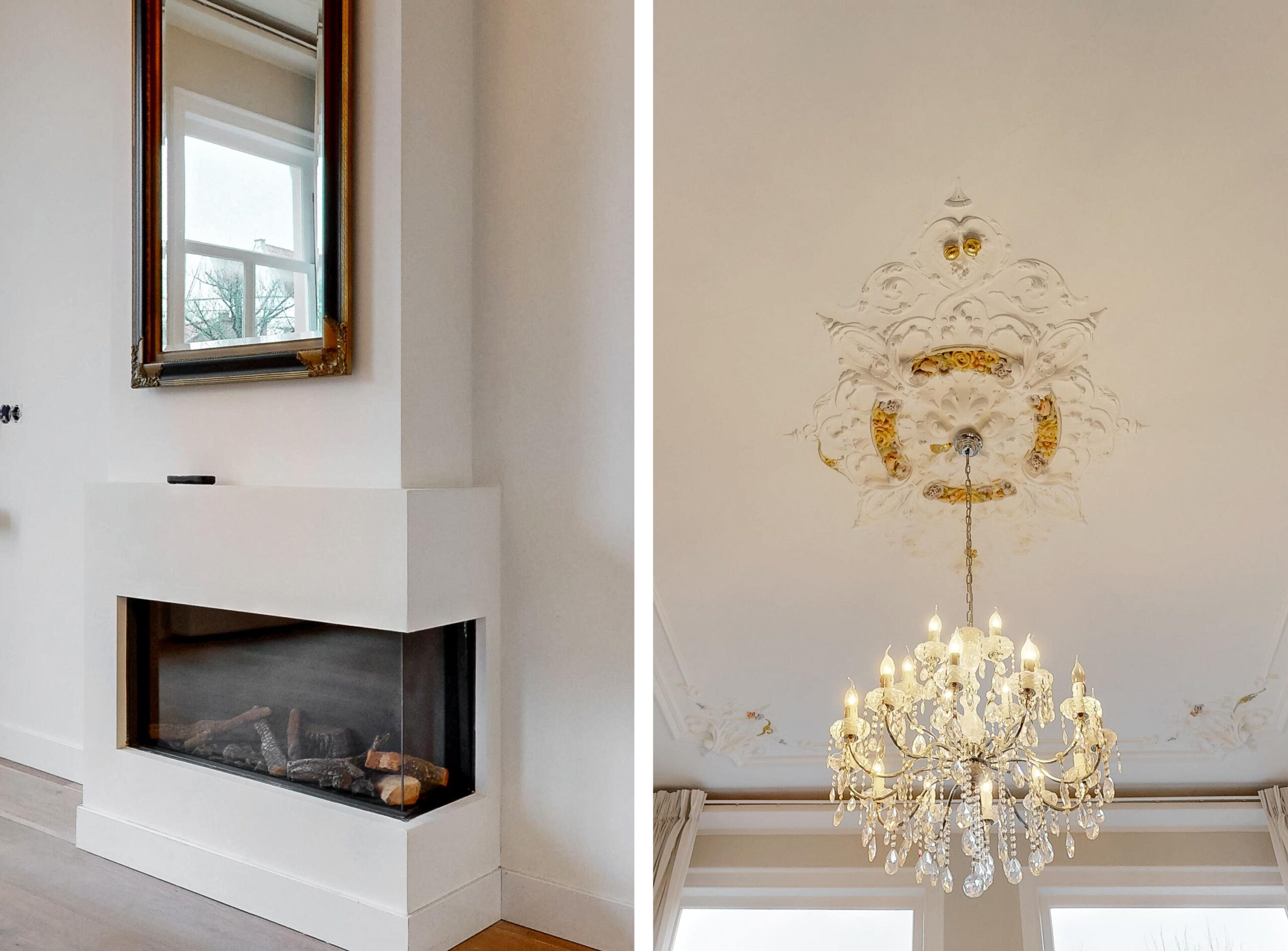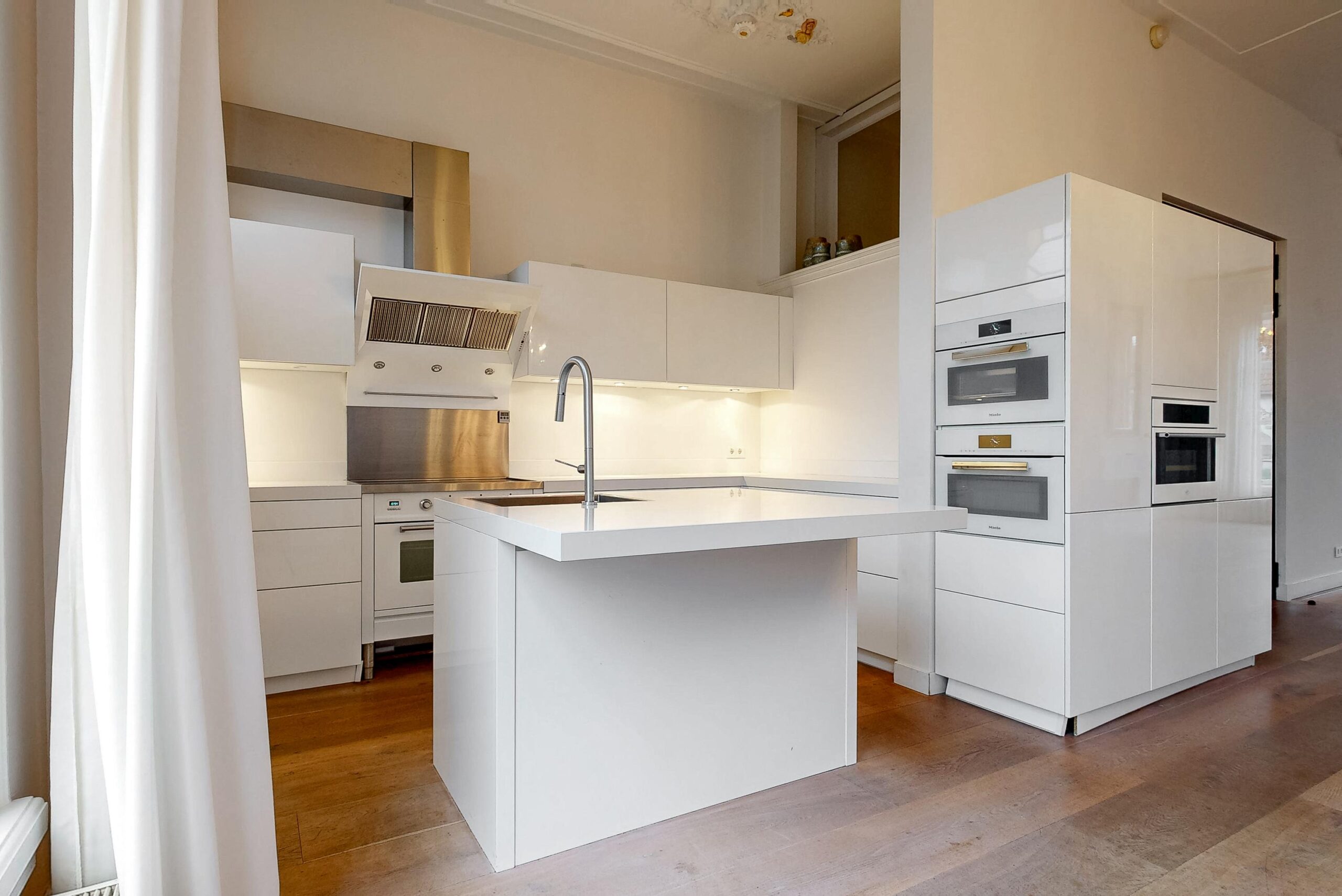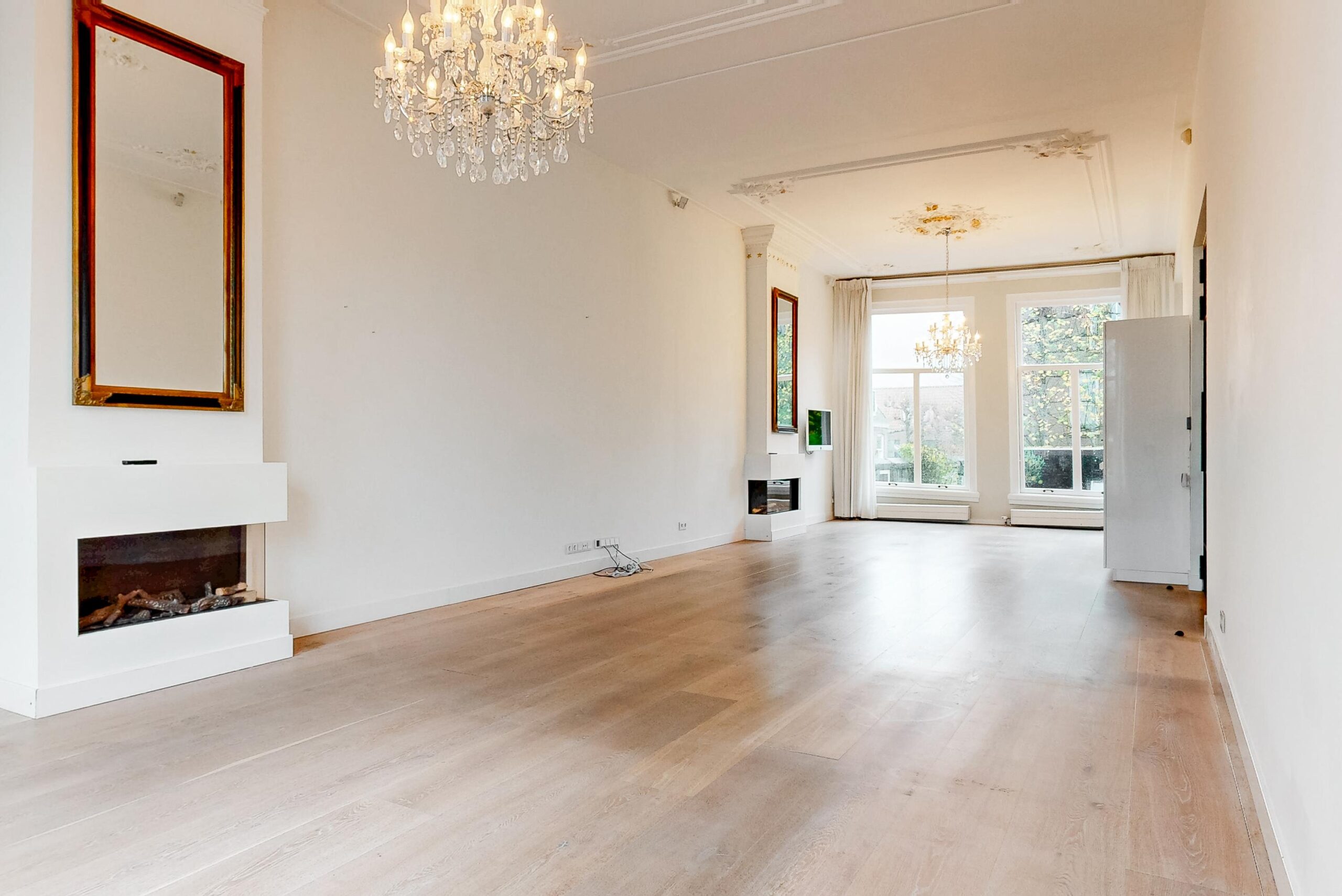 Indeling: beletage met circa 3,70 meter hoge plafonds met ornamenten. Ruime hal met trapopgang, fraai toilet met wandcloset, woonkamer met veel daglichttoetreding en tweemaal gashaard. Pleisterwerkwanden, open keuken met luxe witte hoogglans L-vormige unit en spoeleiland met inbouw wijnklimaatkast, elektrische oven, stoomoven, vaatwasser, 5 pits inductie Boretti fornuis, 90cm brede oven en Boretti koelkast/vriezer.