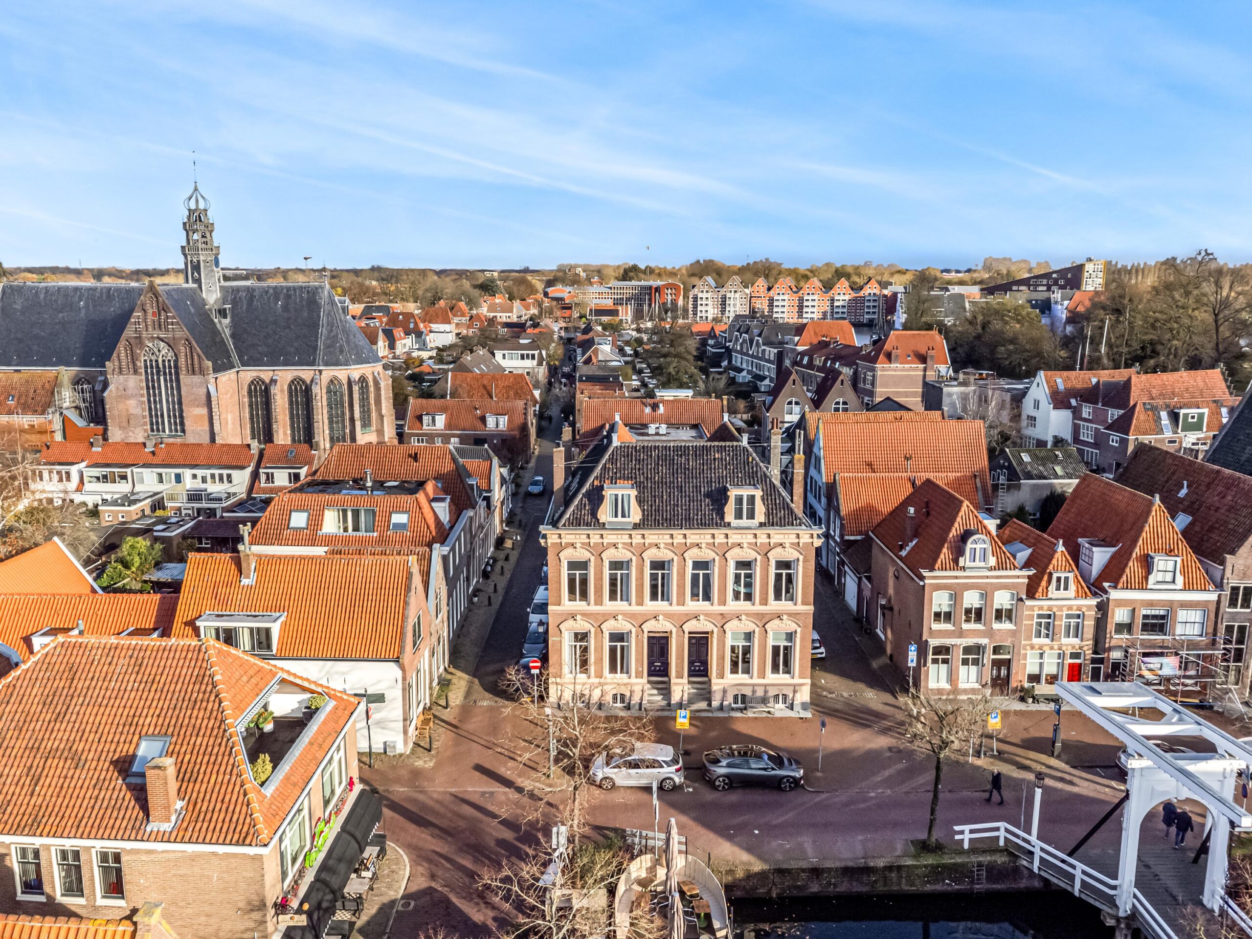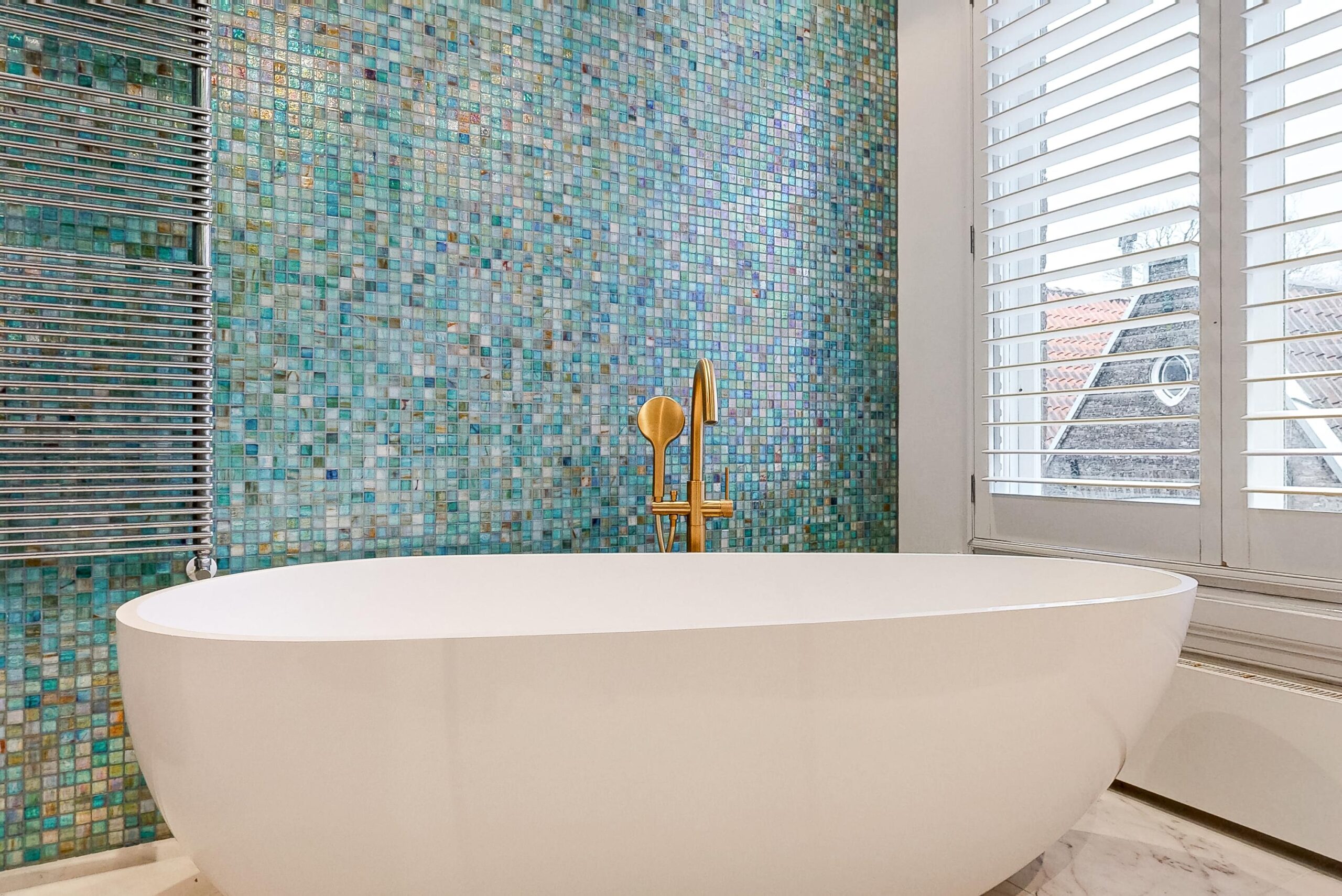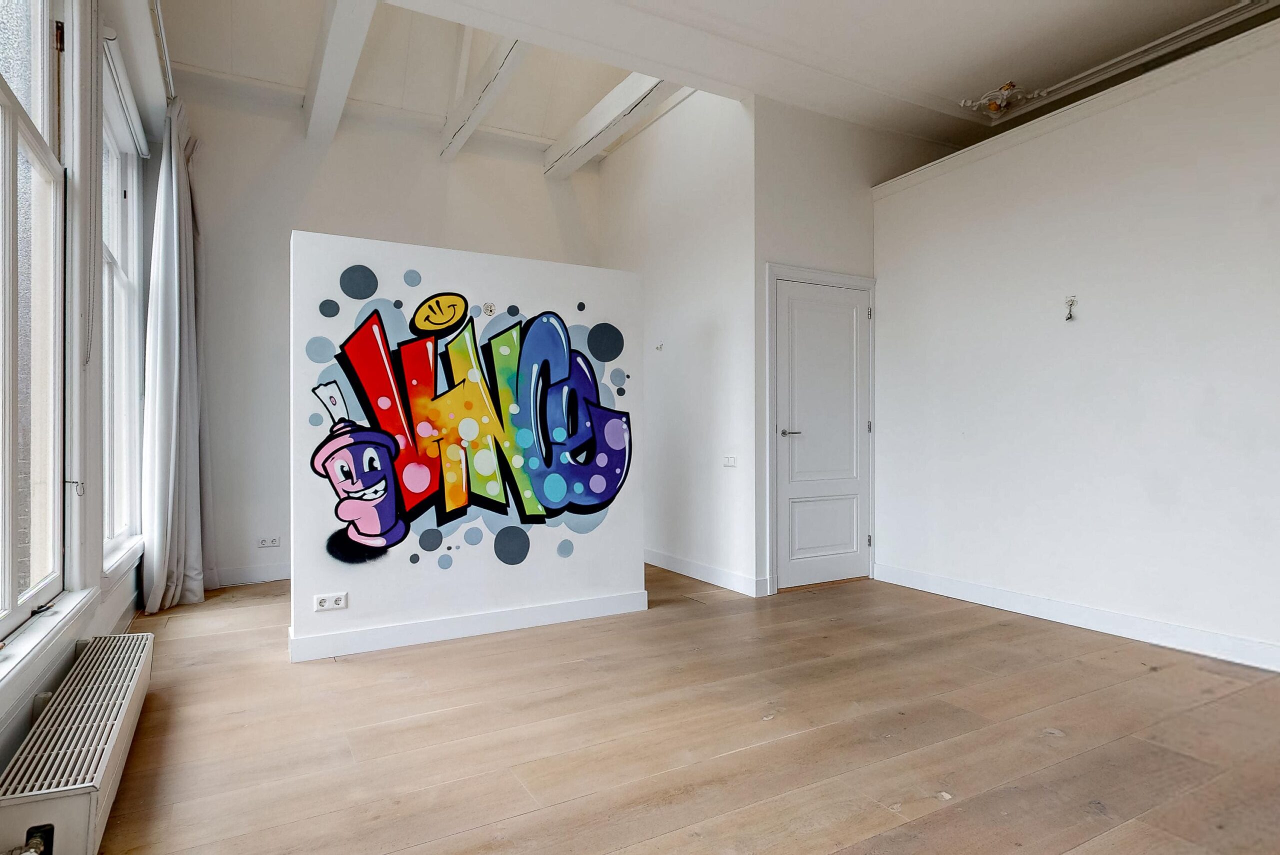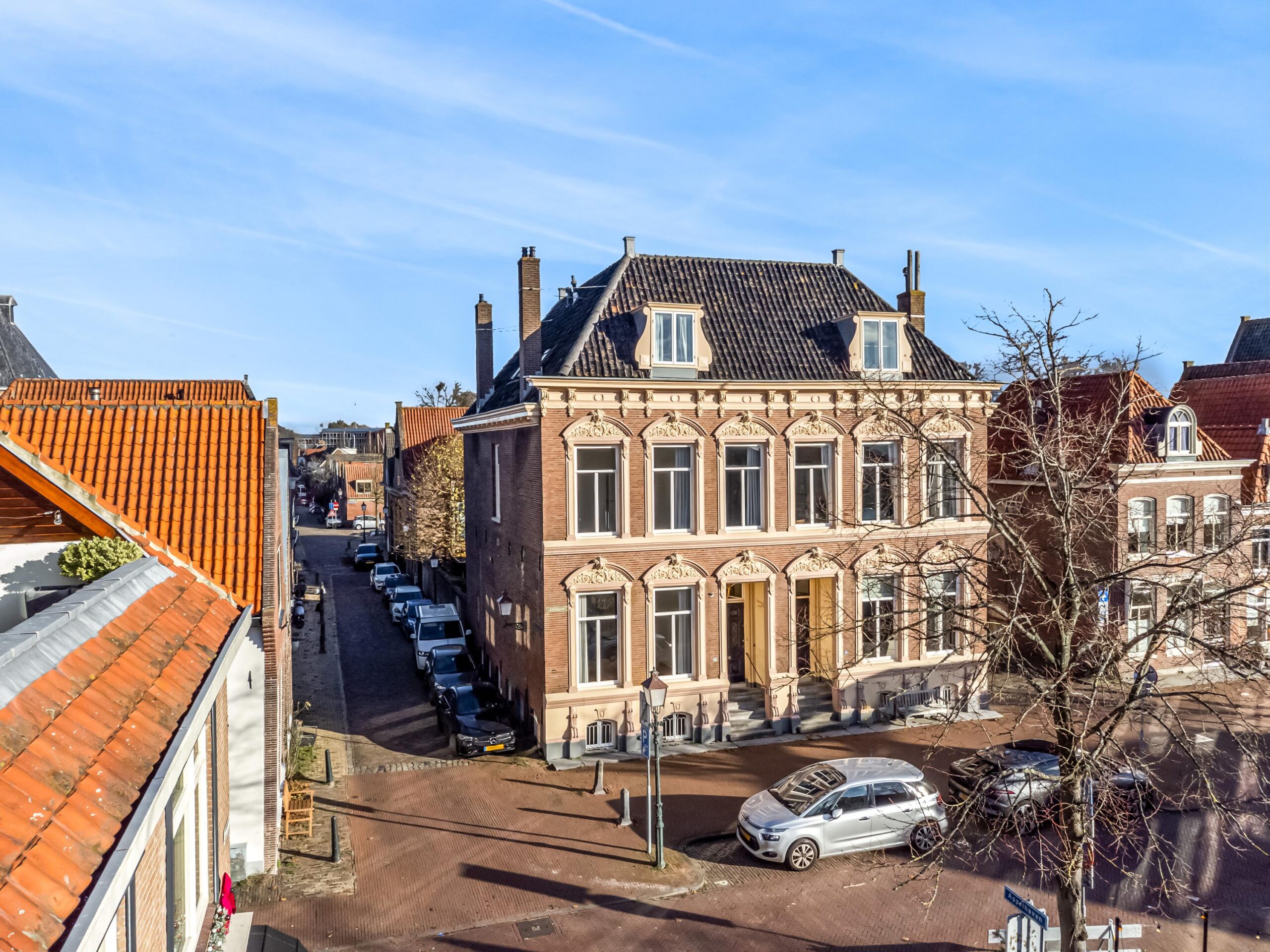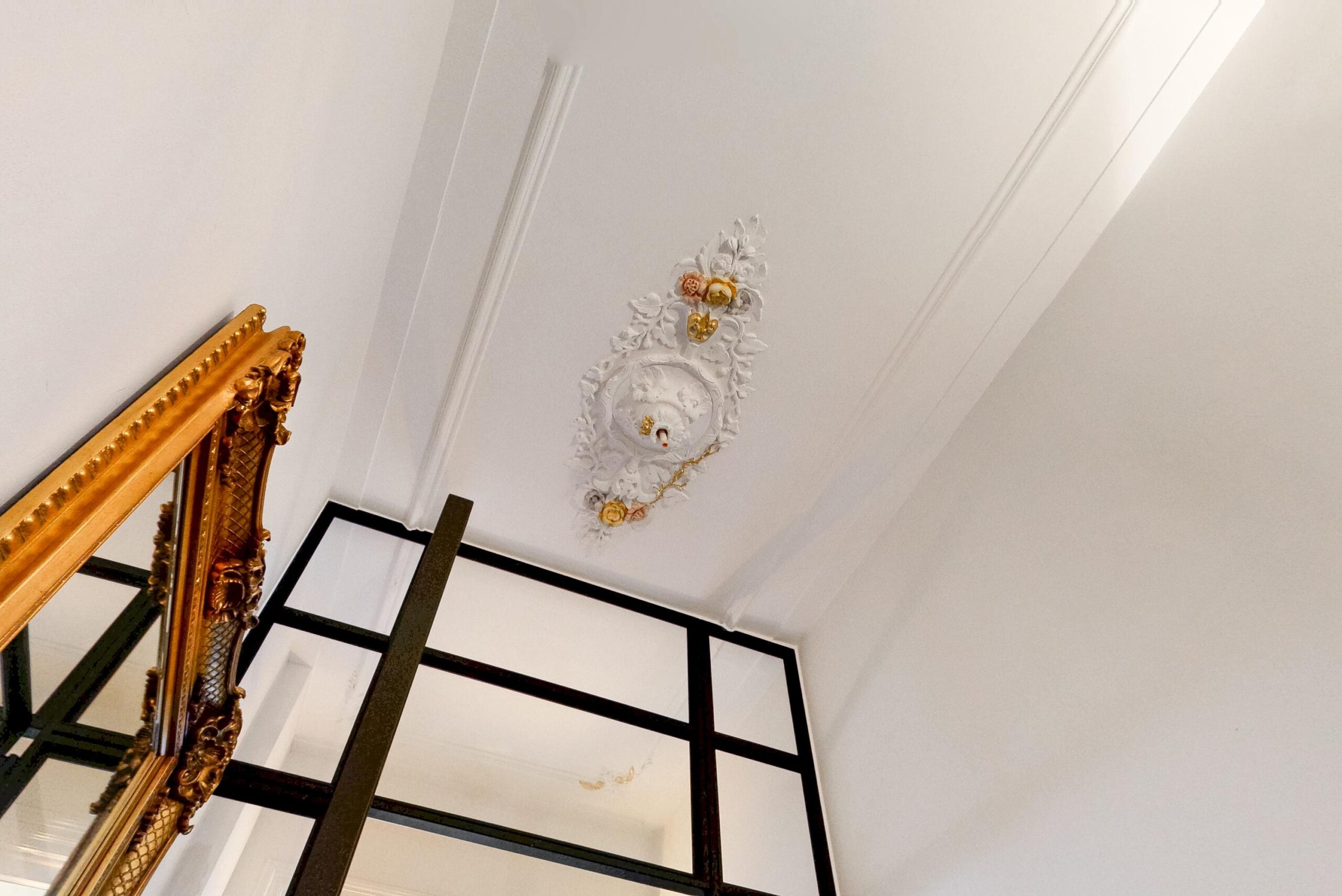 Indeling: beletage met circa 3,70 meter hoge plafonds met ornamenten. Ruime hal met trapopgang, fraai toilet met wandcloset, woonkamer met veel daglichttoetreding en tweemaal gashaard. Pleisterwerkwanden, open keuken met luxe witte hoogglans L-vormige unit en spoeleiland met inbouw wijnklimaatkast, elektrische oven, stoomoven, vaatwasser, 5 pits inductie Boretti fornuis, 90cm brede oven en Boretti koelkast/vriezer.