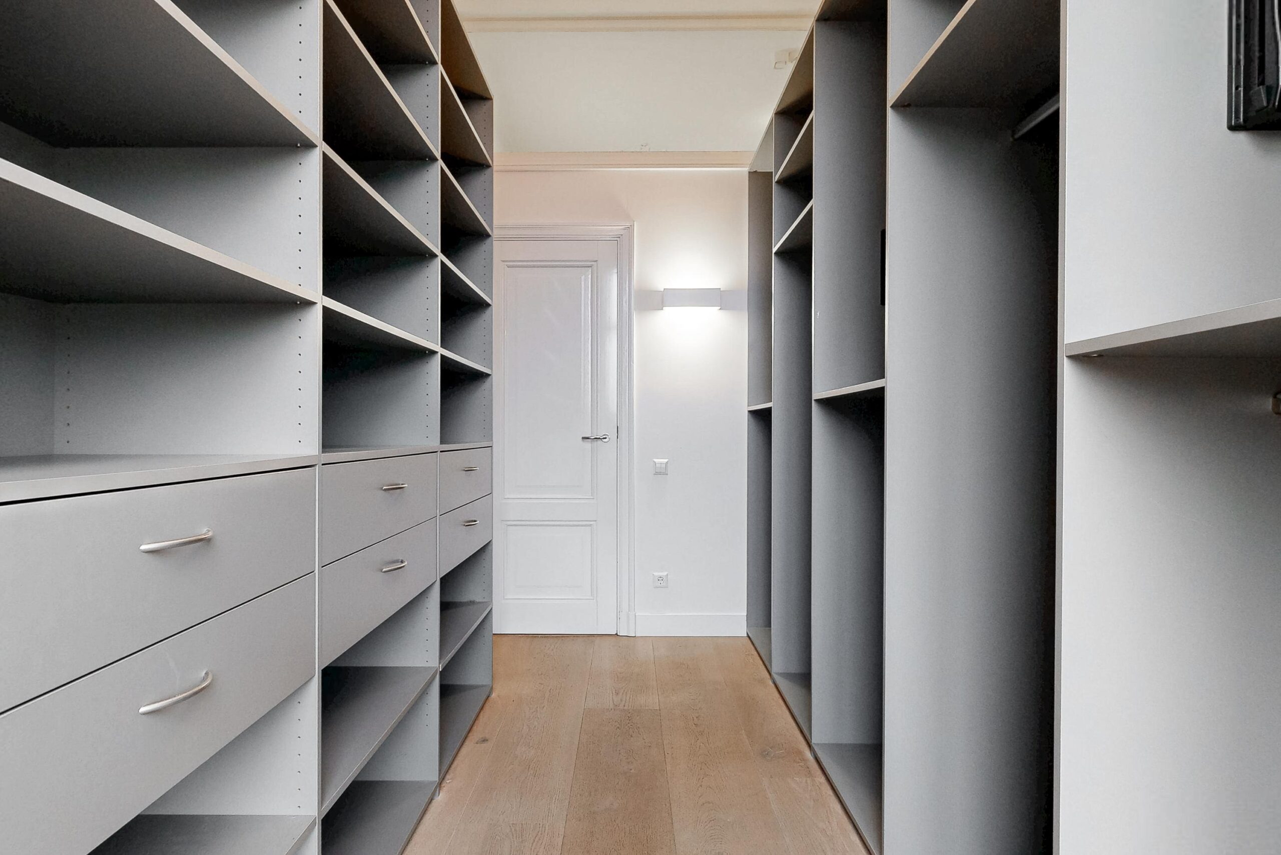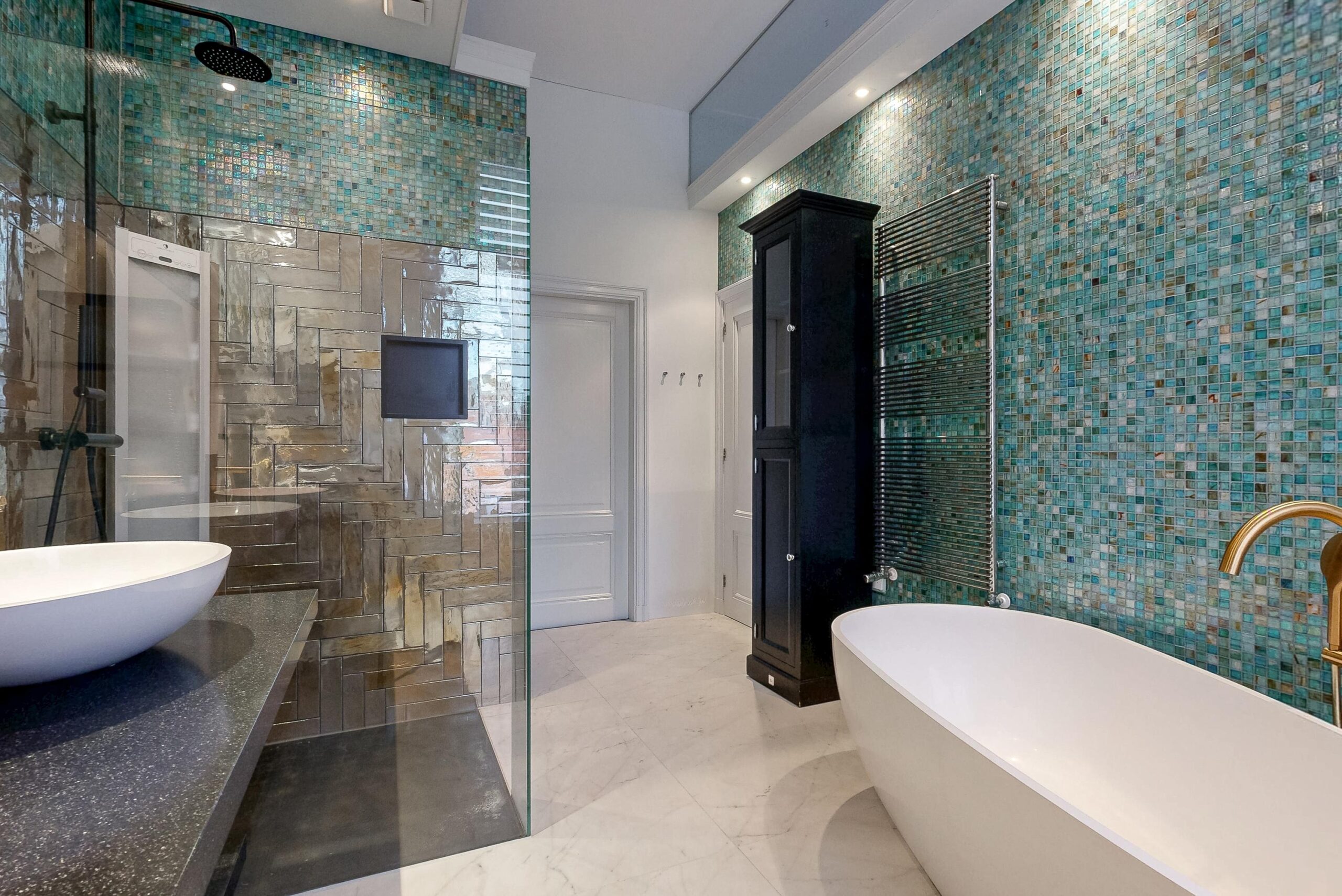 1e verdieping: overloop, 2 slaapkamers aan de voorzijde waarvan 1 met gashaard, luxe eerste badkamer met inloopdouche, dubbele wastafel in meubel, vrijstaand bad en designradiator. Separaat tweede toilet met wandcloset en grote master bedroom met videplafond.