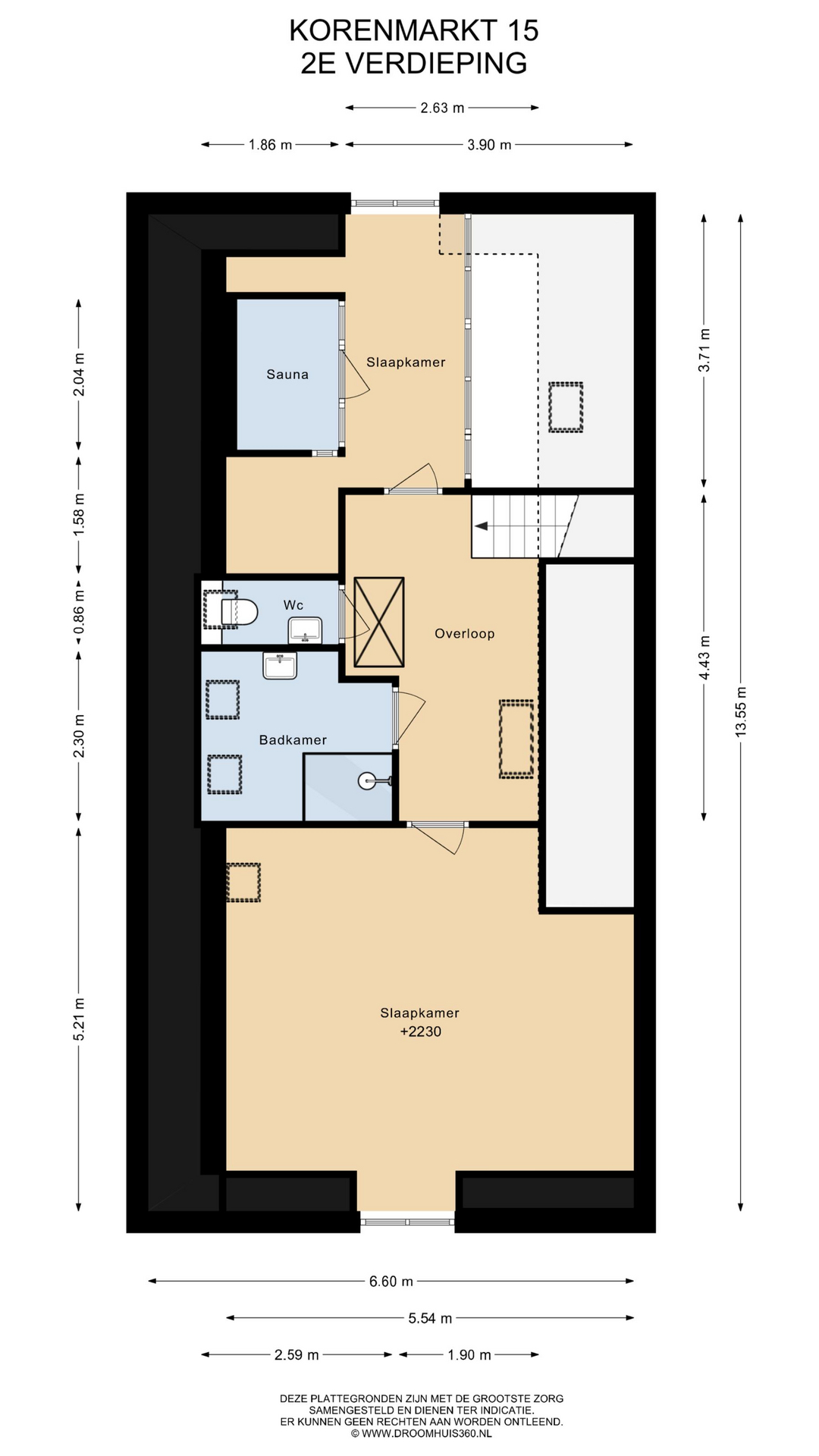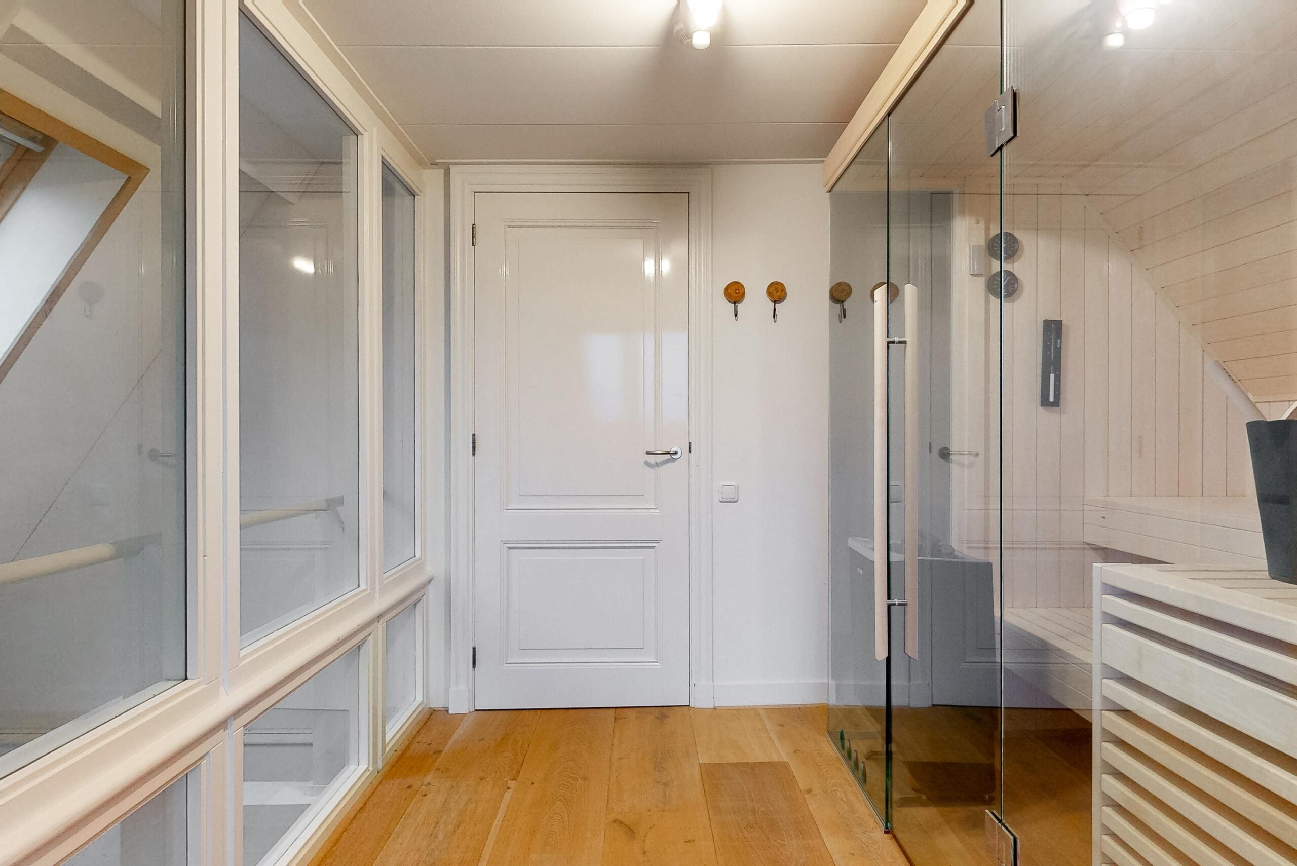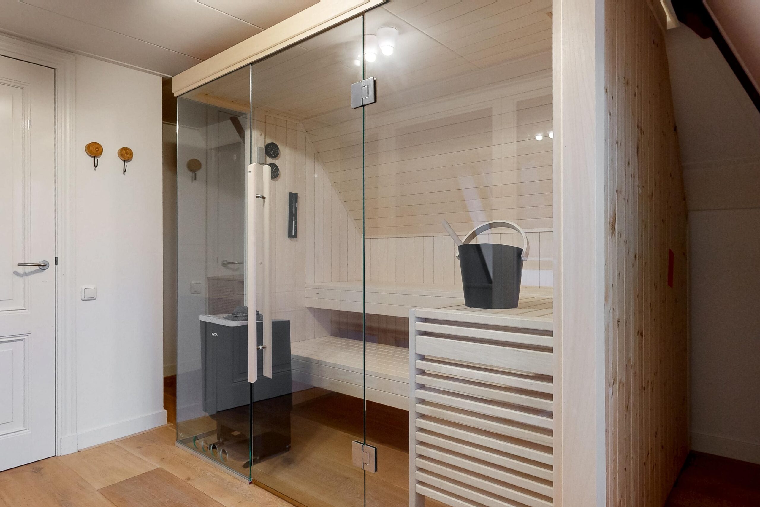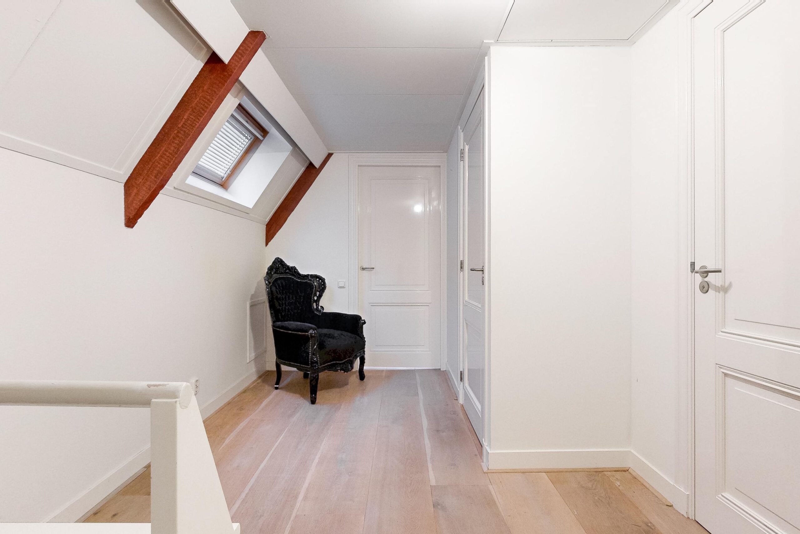 2e verdieping: overloop, grote slaapkamer aan de voorzijde, tweede badkamer met inloopdouche en wastafelmeubel. Separaat derde toilet met wandcloset, slaapkamer aan de achterzijde thans ingericht als saunaruimte, vlizotrap naar grote bergzolder met cv-opstelling.