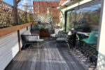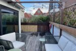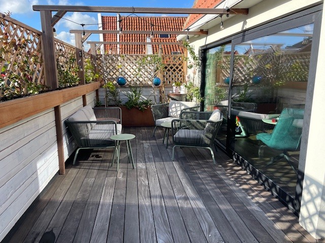 Via de stalen trap bereik je de 2e woonkamer. De vide zorgt voor een loftachtige ambiance, 2 aluminium schuifpuinen bieden toegang naar het L-vormige dakterras op het zonnige zuiden. Aan de voorzijde van de woning bevindt zich een grote slaapkamer met inloopkast en badkamer en-suite. De airconditioning zorgt voor een prettige nachtrust, ook tijdens de warme zomerdagen. De slaapkamer wordt gescheiden van de woonkamer door middel van een glazen wand. “Sleep like a royal” in deze hotel chique ruimte.