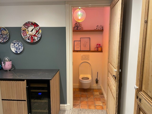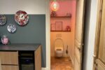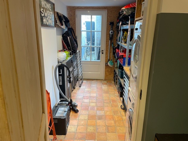 Je betreedt de woning op straatniveau in de ruim opgezette, gezellige woon-/leefkeuken. Deze sfeervolle ruimte met een authentieke Franse estrikken vloer is voorzien van een modern kookeiland met inbouwapparatuur van hoogwaardige kwaliteit. Opvallend detail is dat de achterwand bekleed is met handgemaakte metallic witjes van Piet Jonker. Deze geven de keuken een uniek karakter. De strakke stalen houtkachel van Dirk Geurts maken de ruimte de perfecte plek voor gezellige etentjes. De mooie hoogte en het authentieke plafond zorgen voor een ruimtelijke beleving. De eyecatcher in deze ruimte is de op maat gemaakte stalen trap die als een ader door de woning loopt. Hier wordt modern stijlvol gecombineerd met historische details.
