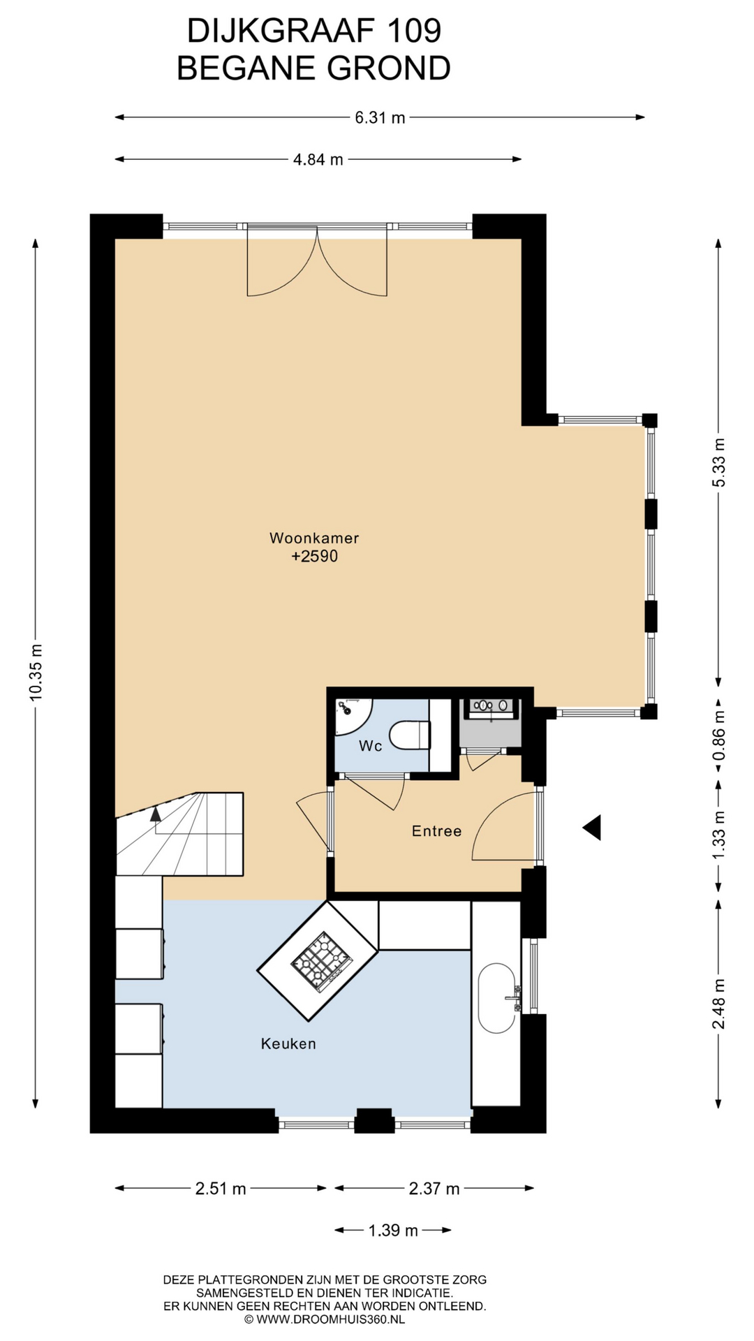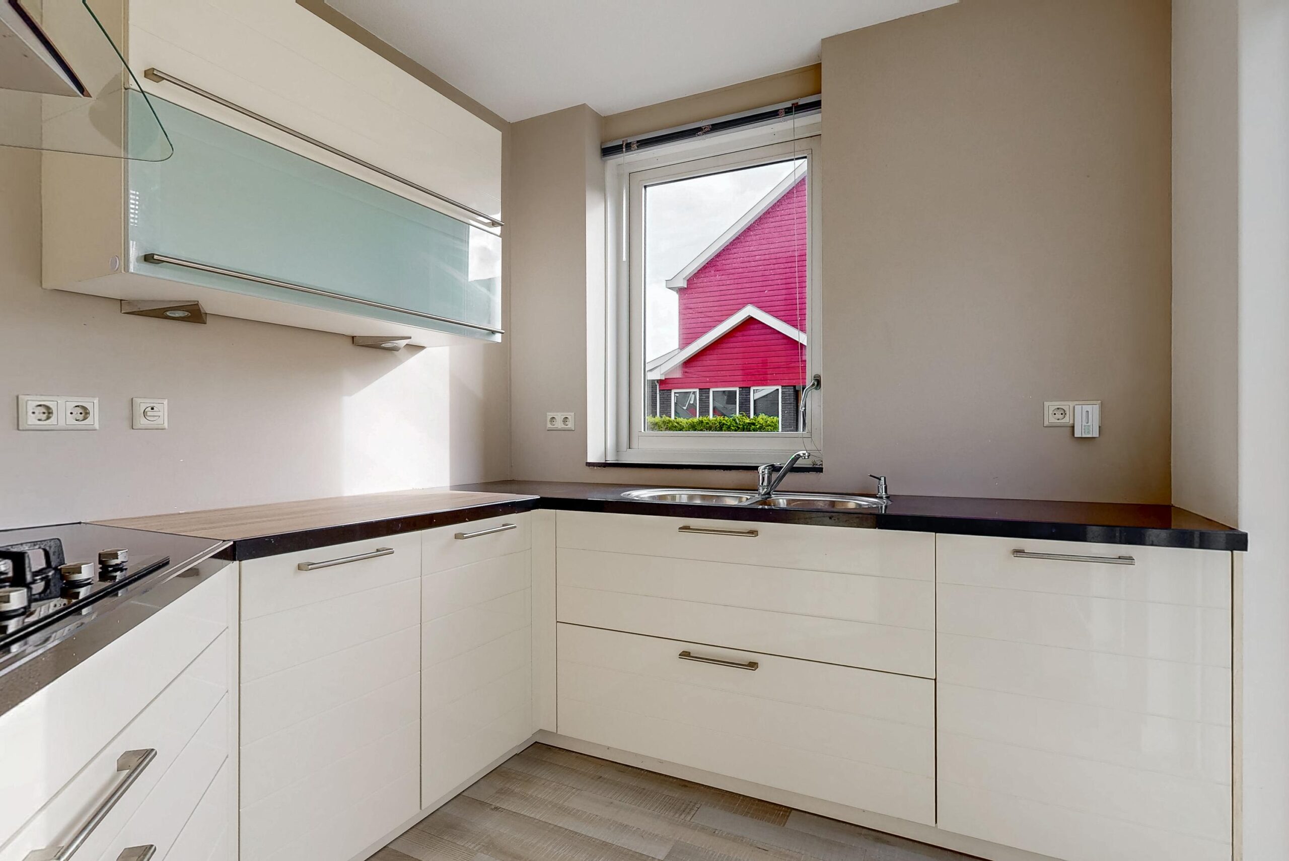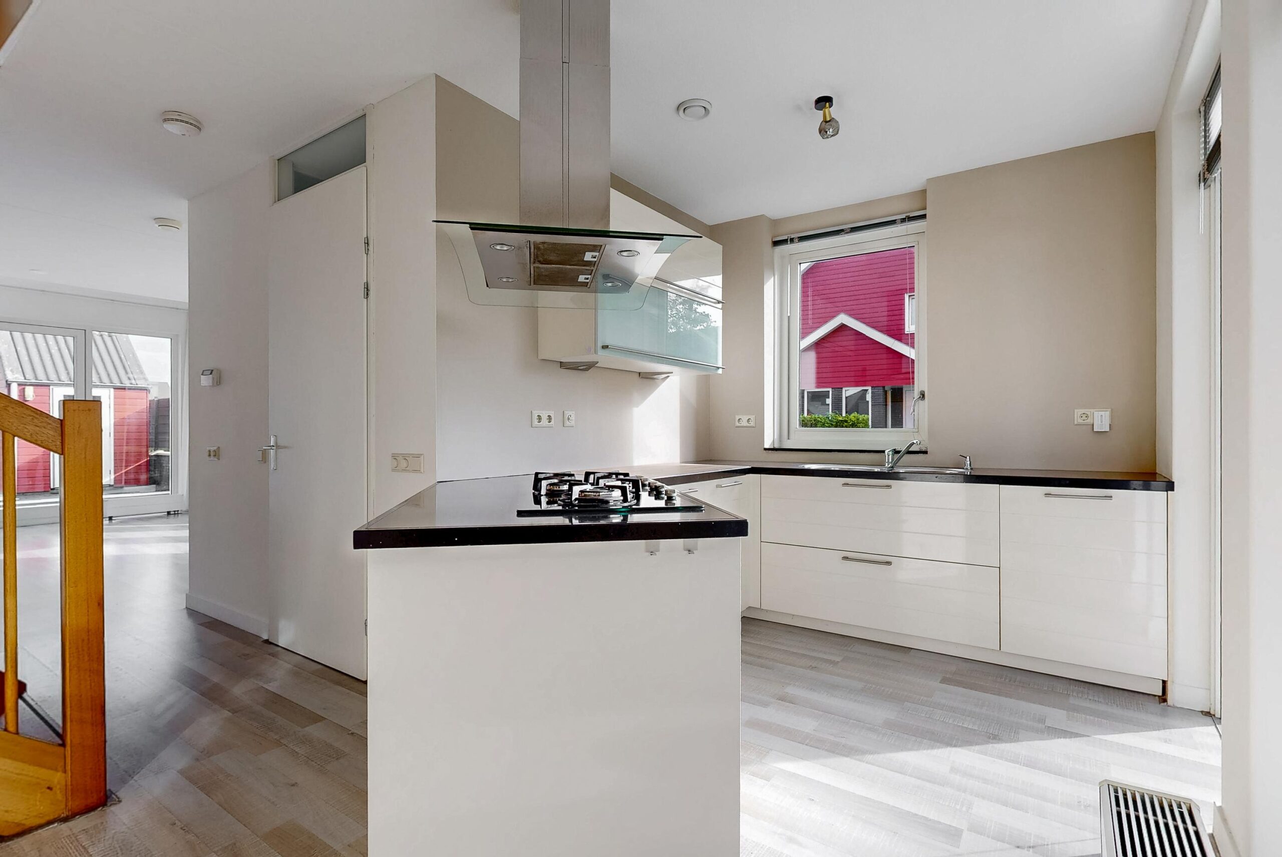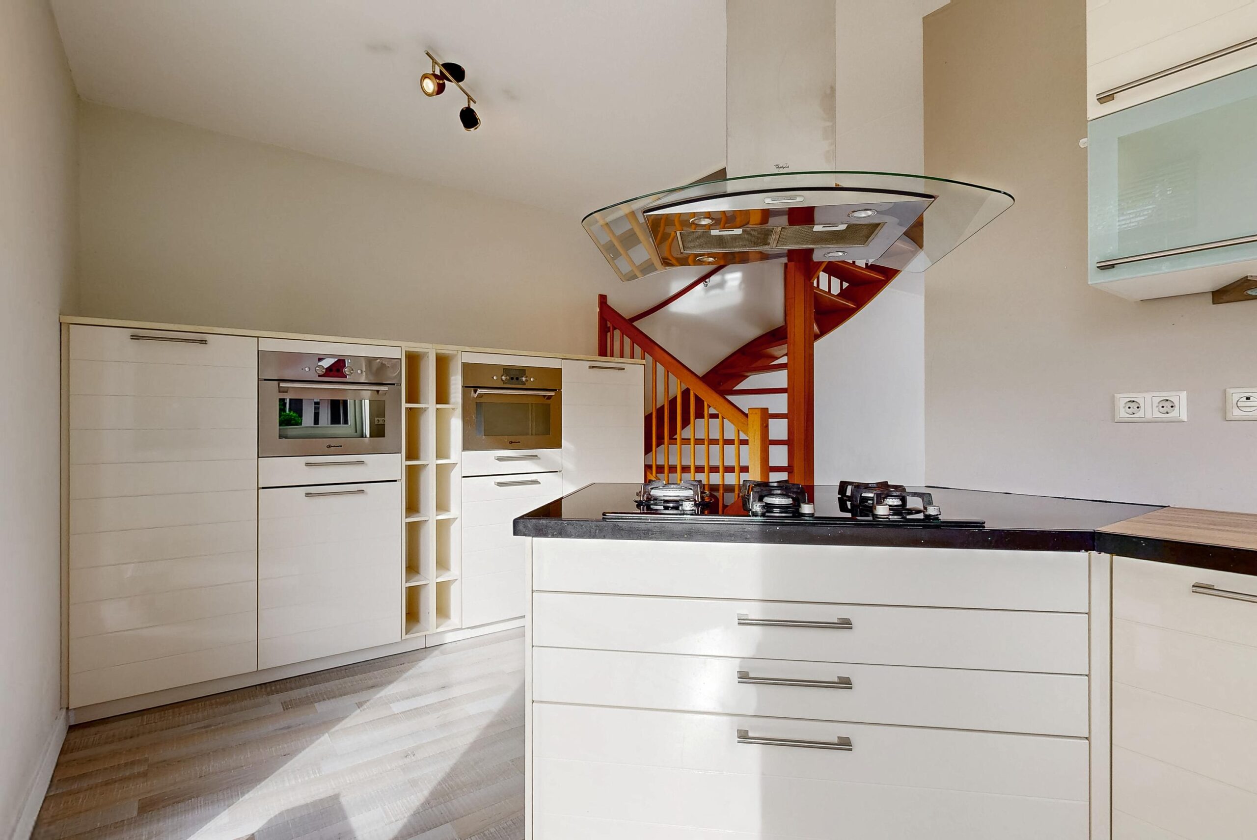 Indeling: zijentree met toilet, uitgebouwde woonkamer met erker en dubbele openslaande tuindeuren, open keuken met roomwitte hoogglans keukenunit voorzien van inbouwkoelkast, elektrische oven, magnetron, vriezer, 5 pits gaskookplaat, afzuigkap en vaatwasser.