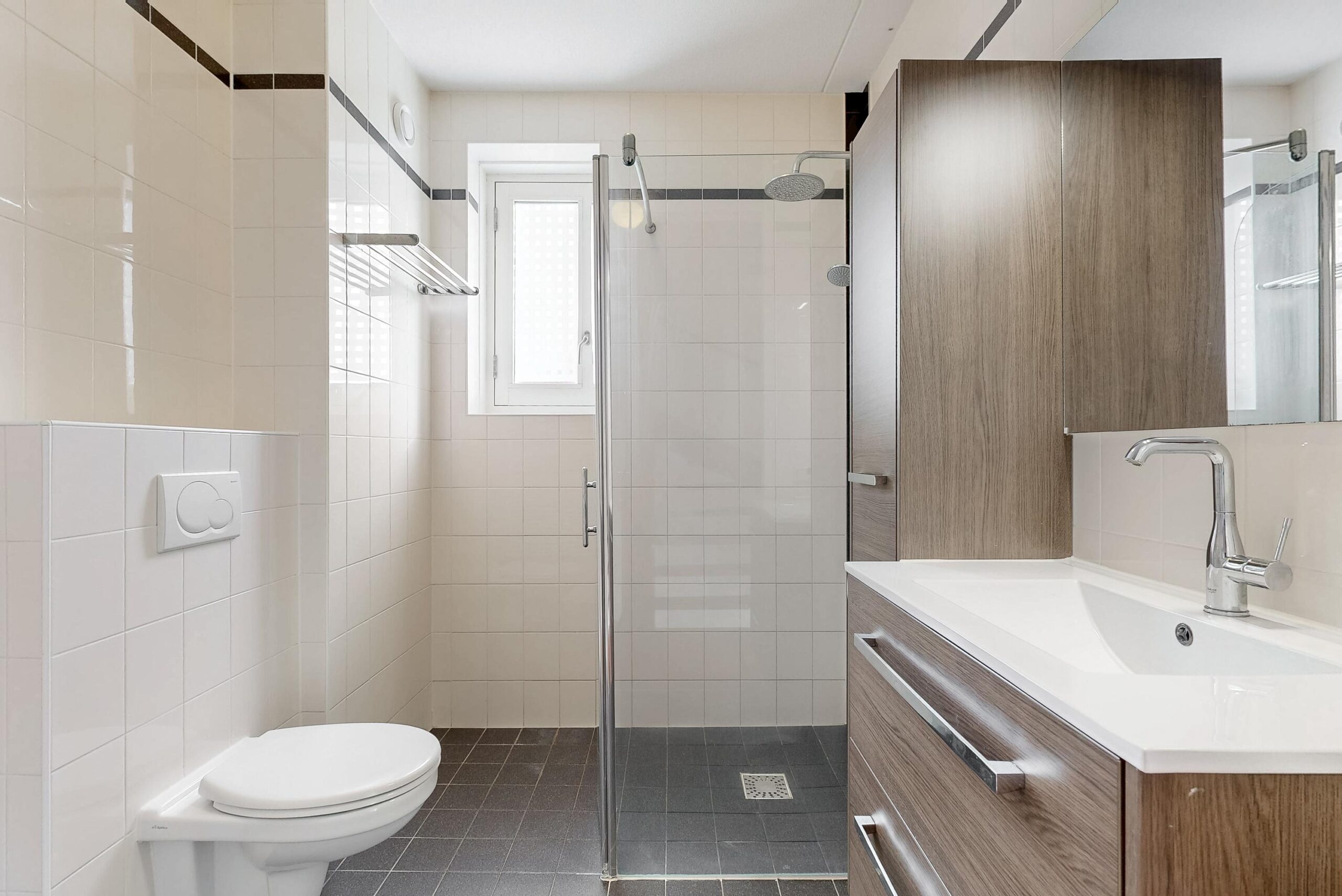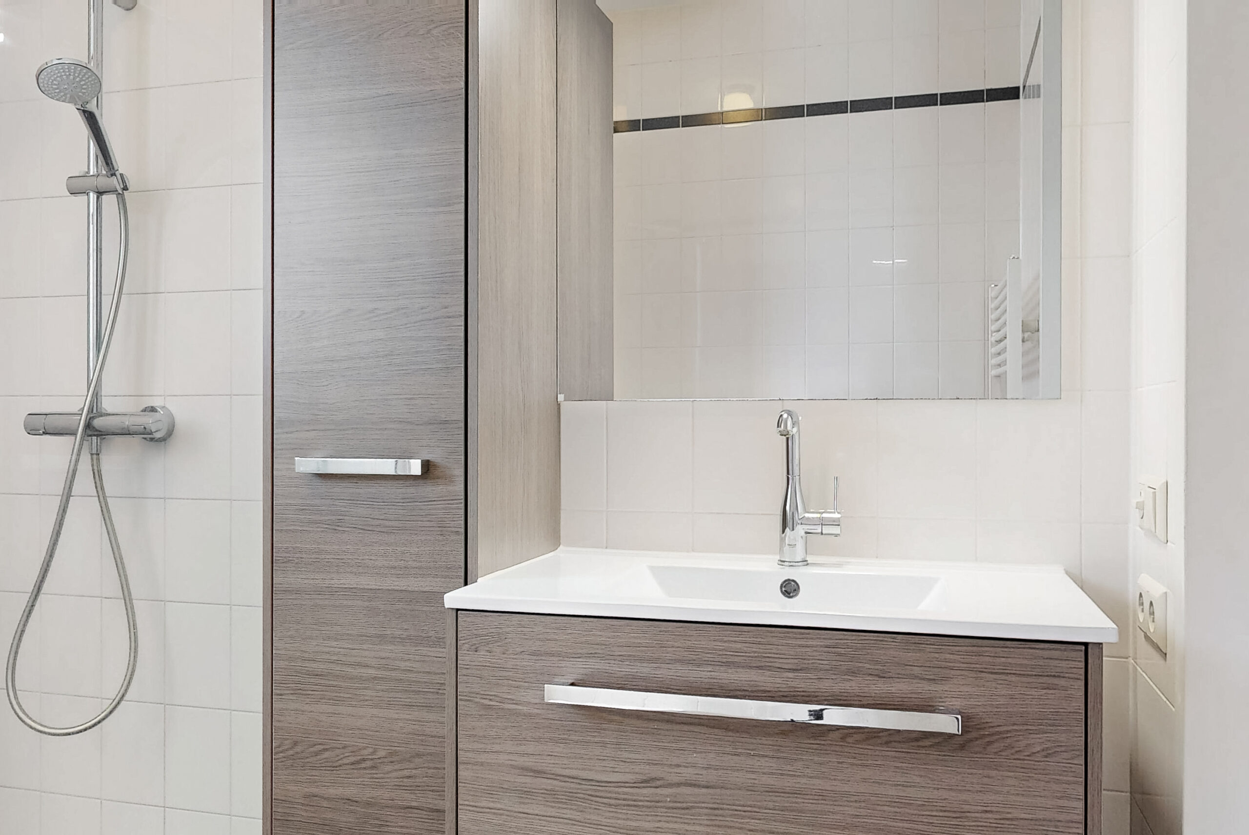 Eerste verdieping: overloop, twee zeer ruime slaapkamers waarvan een met frans balkon, witte badkamer met inloopdouche, tweede wandcloset, design radiator en wastafelmeubel.