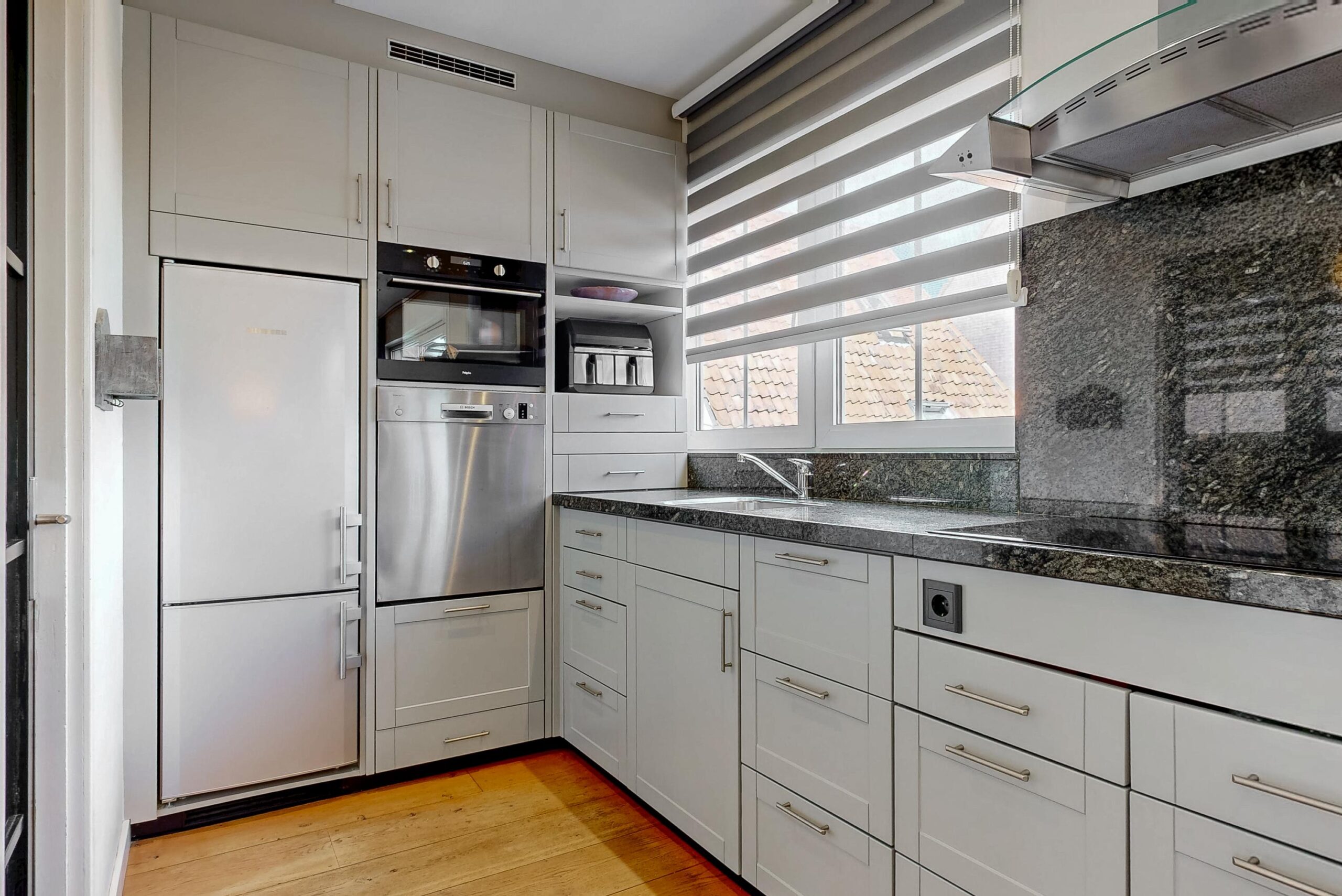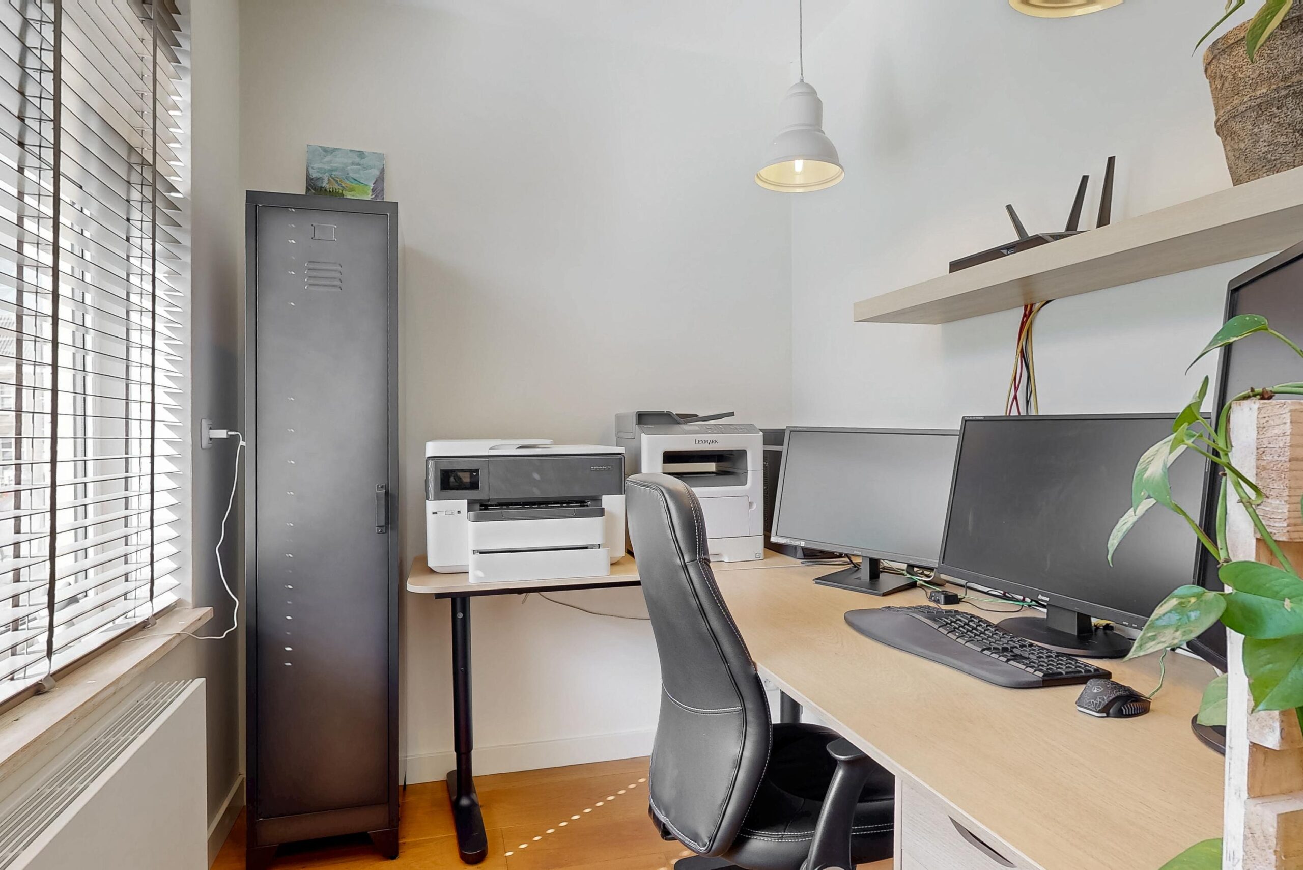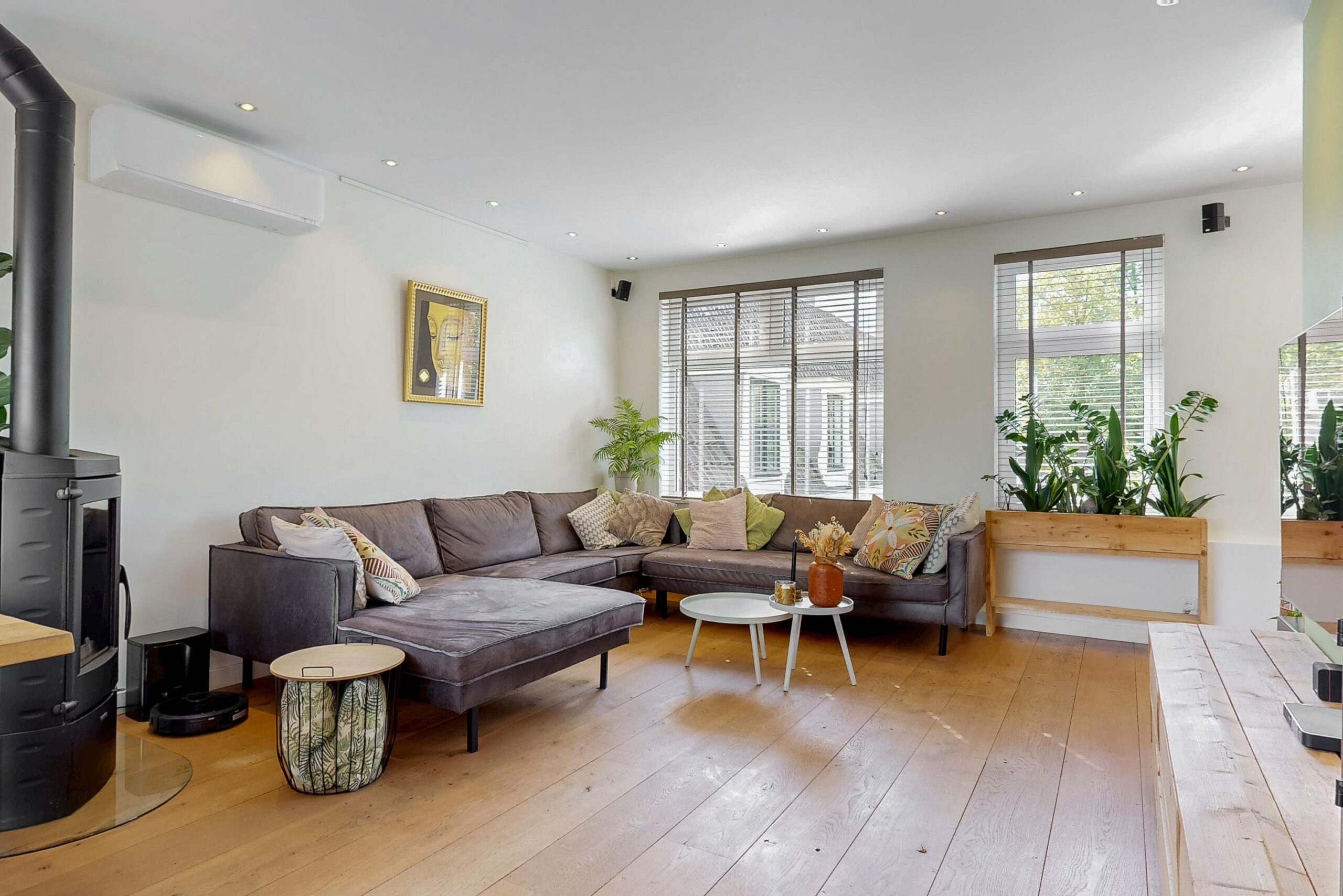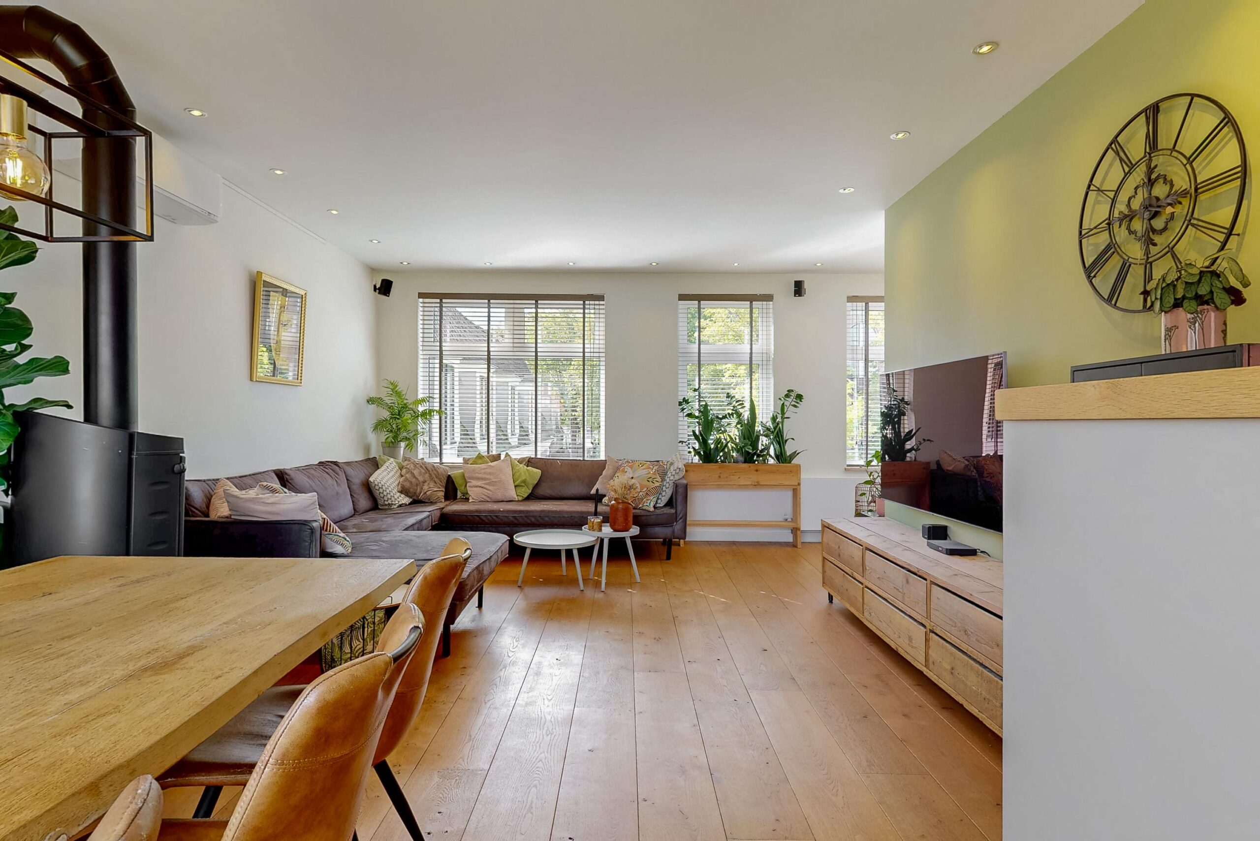 Eerste verdieping: overloop met 2e toilet (2022), open keuken met uitgebreide keukenunit voorzien van een verhoogd granieten aanrechtblad, 5-zones inductiekookplaat, afzuigkap, oven met magnetronfunctie, vaatwasser op hoogte en losse koelkast en vriezer, ruime 2e woonkamer met veel lichtinval, sfeervolle houtkachel, elektrische zonwering aan beide zijden van het pand, gestuukte wanden, airco (2025) en via schuifpui toegang tot fijn dakterras.