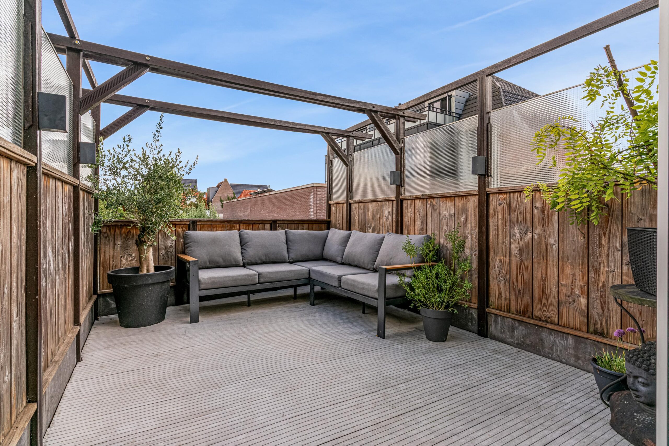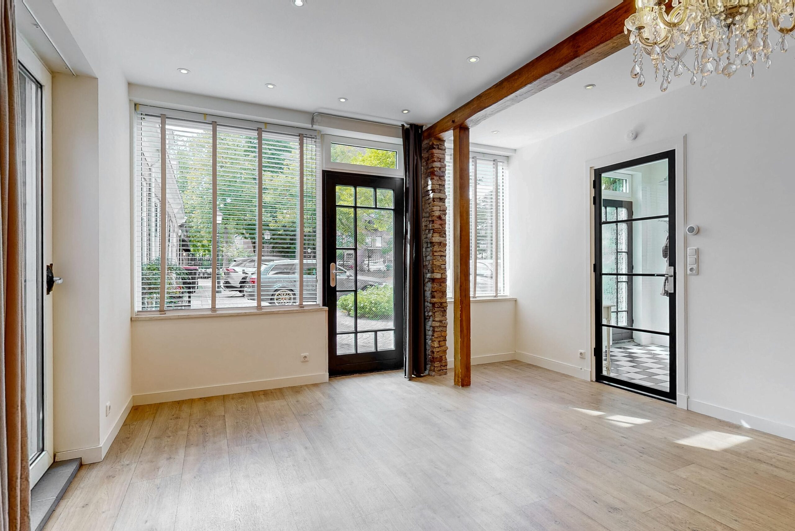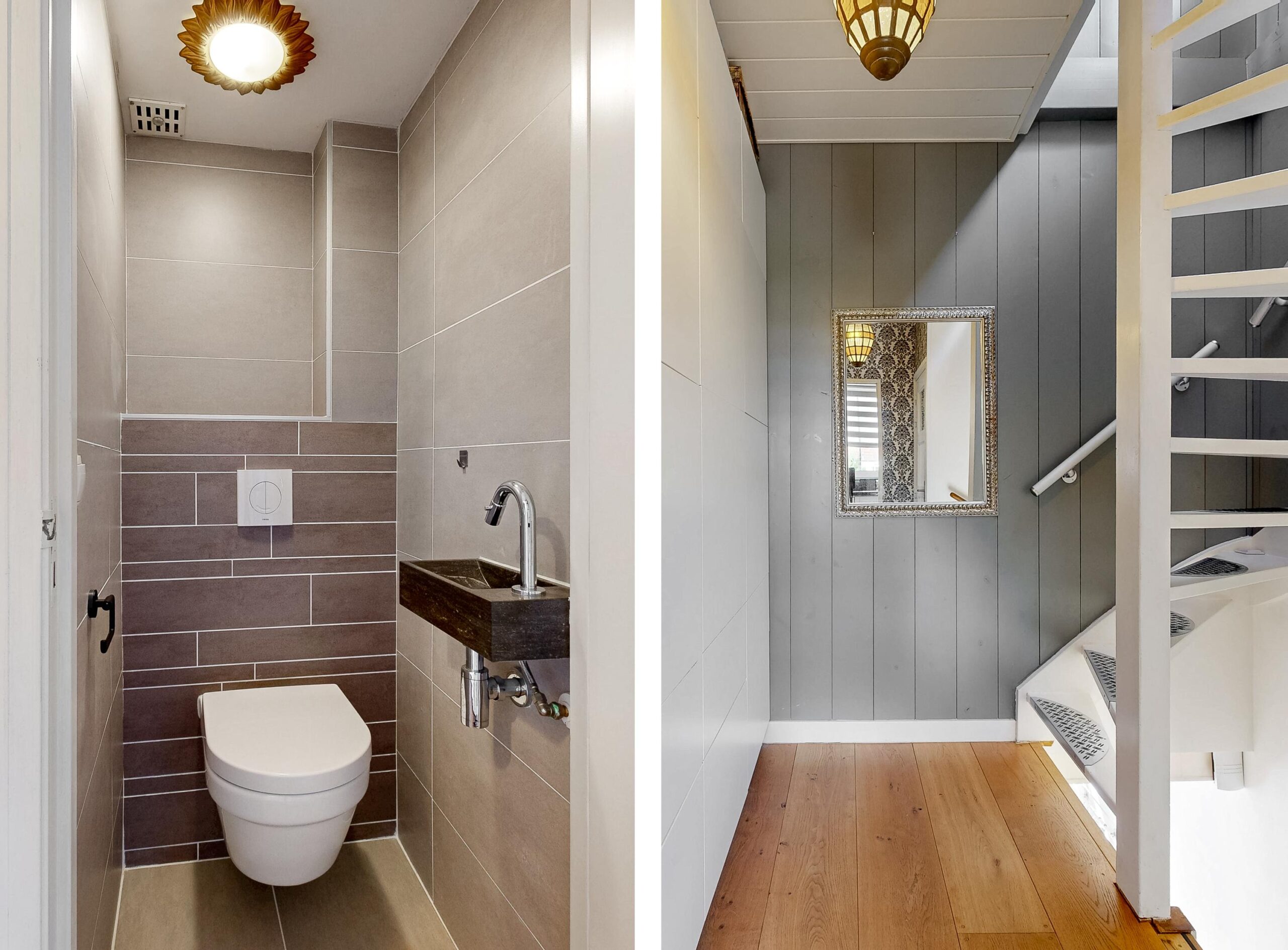 Eerste verdieping: overloop met 2e toilet (2022), open keuken met uitgebreide keukenunit voorzien van een verhoogd granieten aanrechtblad, 5-zones inductiekookplaat, afzuigkap, oven met magnetronfunctie, vaatwasser op hoogte en losse koelkast en vriezer, ruime 2e woonkamer met veel lichtinval, sfeervolle houtkachel, elektrische zonwering aan beide zijden van het pand, gestuukte wanden, airco (2025) en via schuifpui toegang tot fijn dakterras.