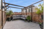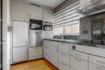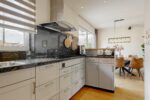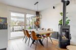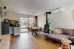 Eerste verdieping: overloop met 2e toilet (2022), open keuken met uitgebreide keukenunit voorzien van een verhoogd granieten aanrechtblad, 5-zones inductiekookplaat, afzuigkap, oven met magnetronfunctie, vaatwasser op hoogte en losse koelkast en vriezer, ruime 2e woonkamer met veel lichtinval, sfeervolle houtkachel, elektrische zonwering aan beide zijden van het pand, gestuukte wanden, airco (2025) en via schuifpui toegang tot fijn dakterras.