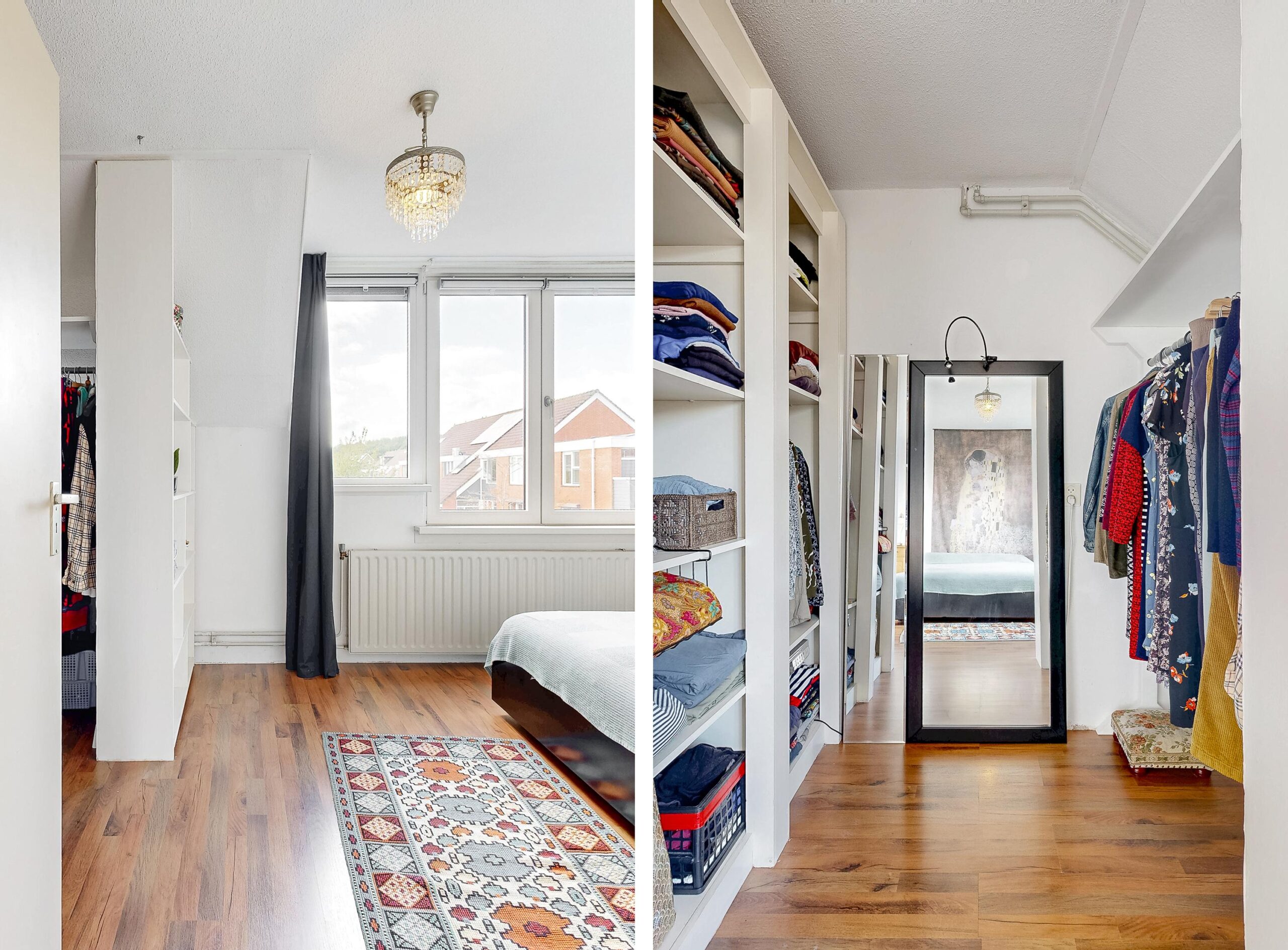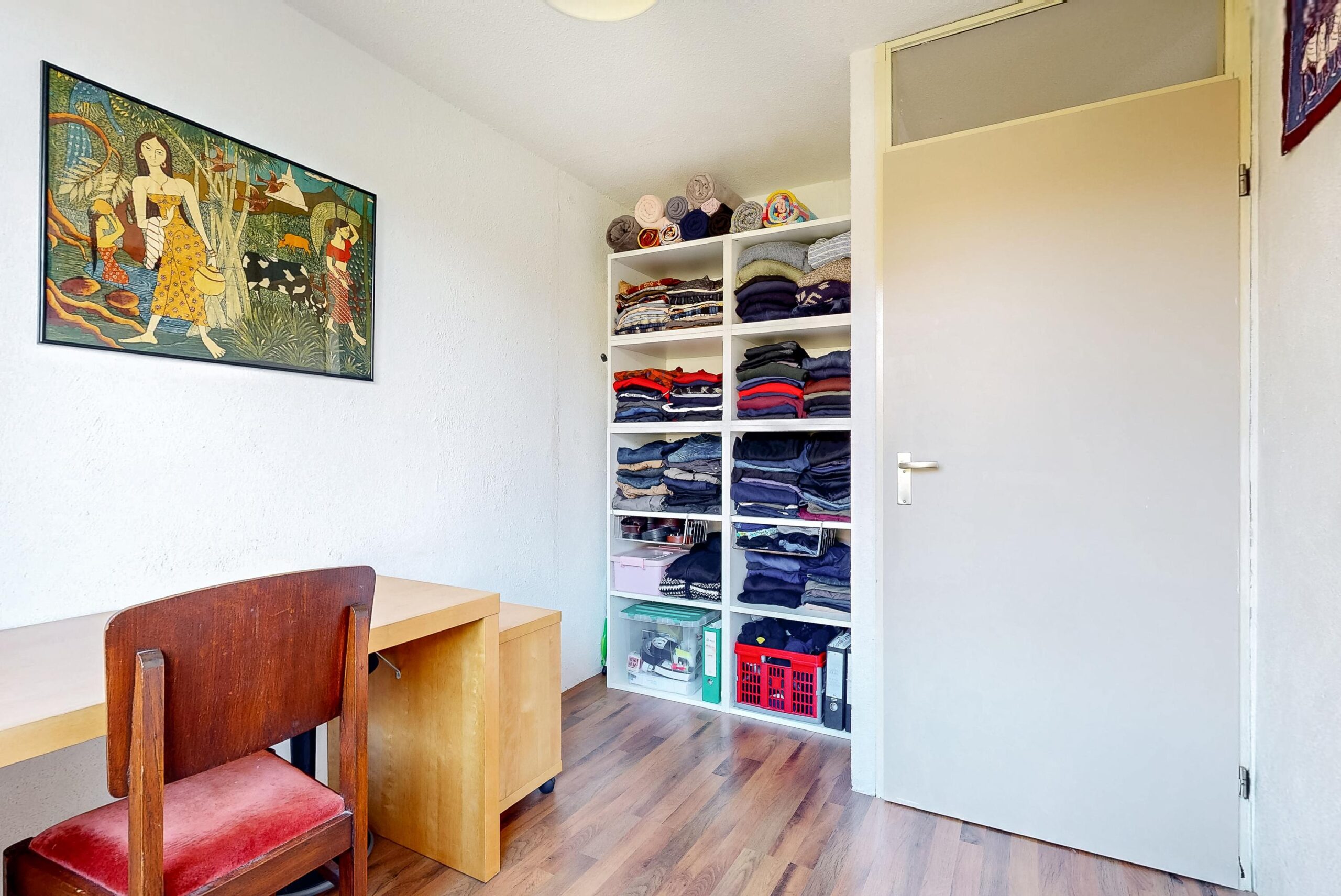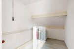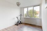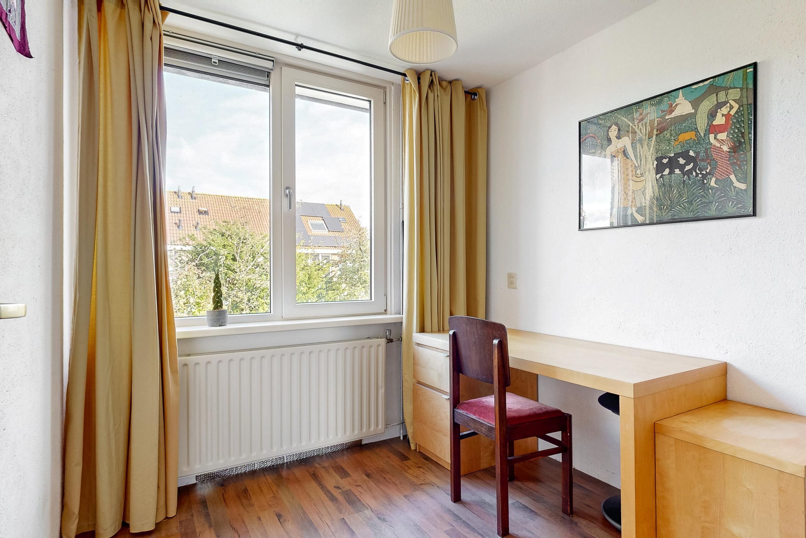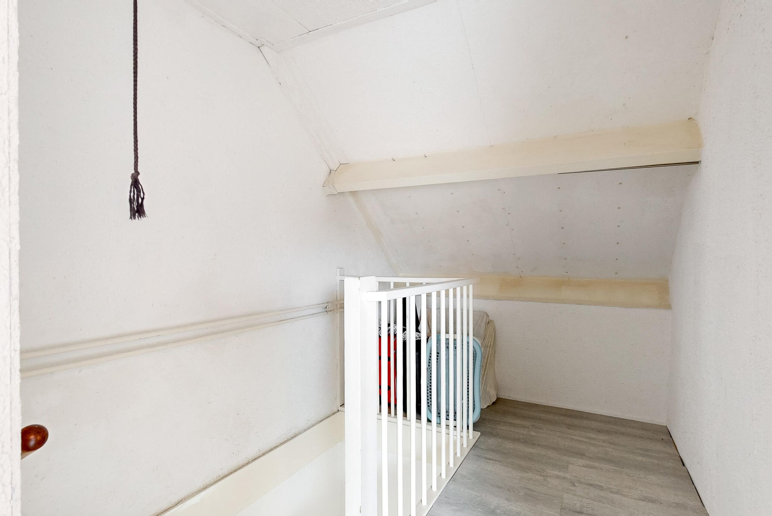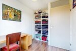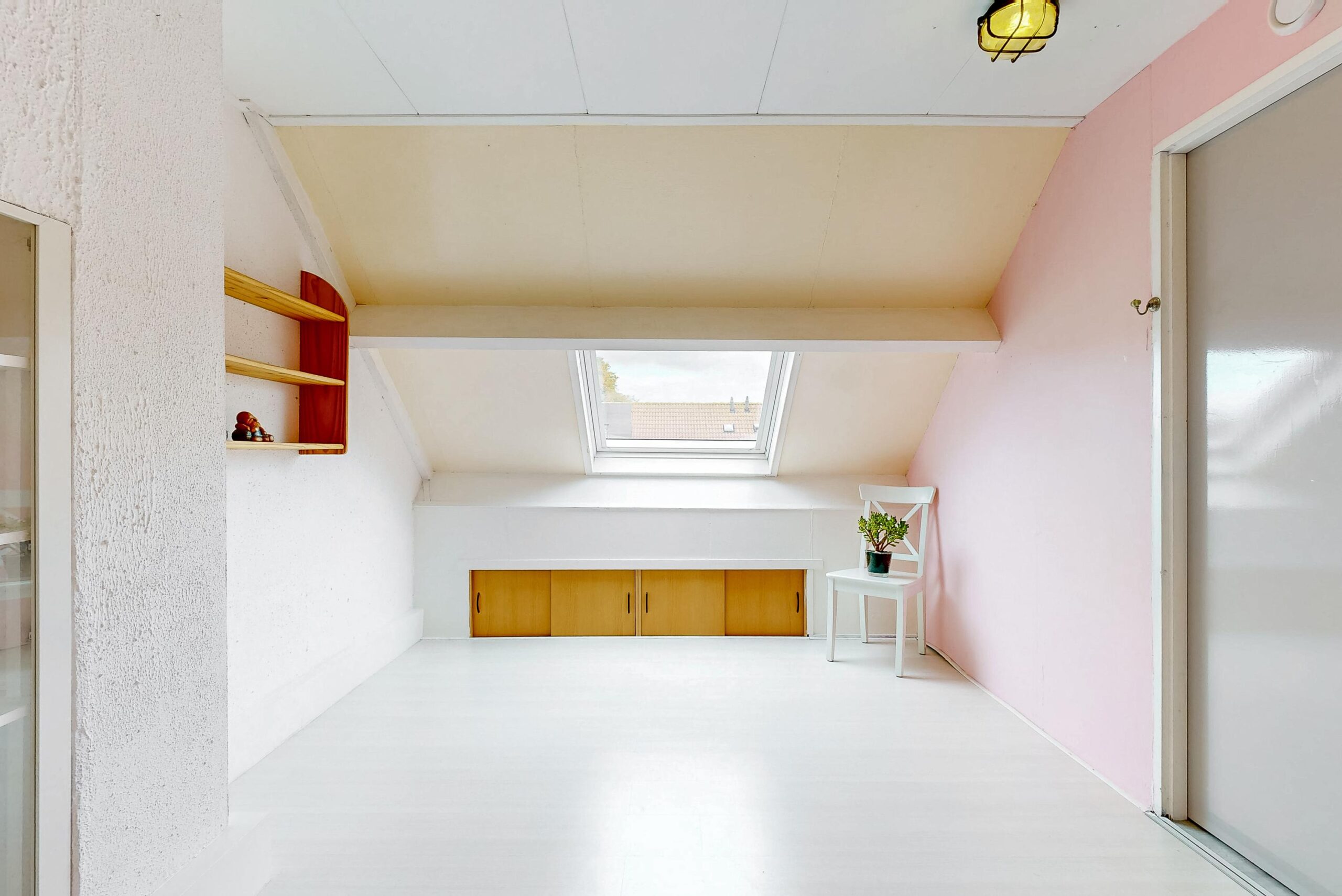 Tweede verdieping: ruime overloop met cv-opstelling en aansluiting voor de wasmachine en droger, ruime 4e slaapkamer met dakraam, vaste kasten en wastafel.
