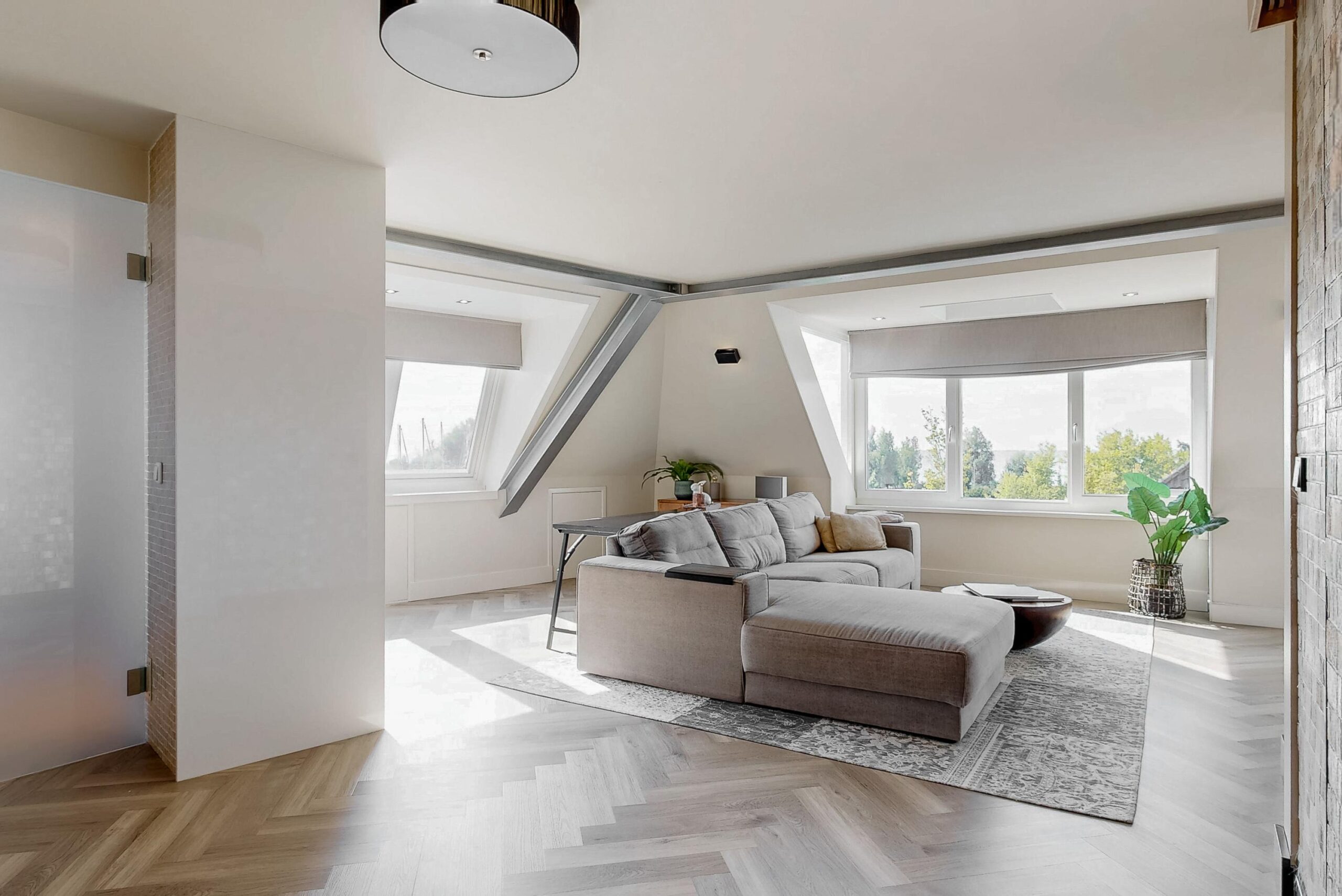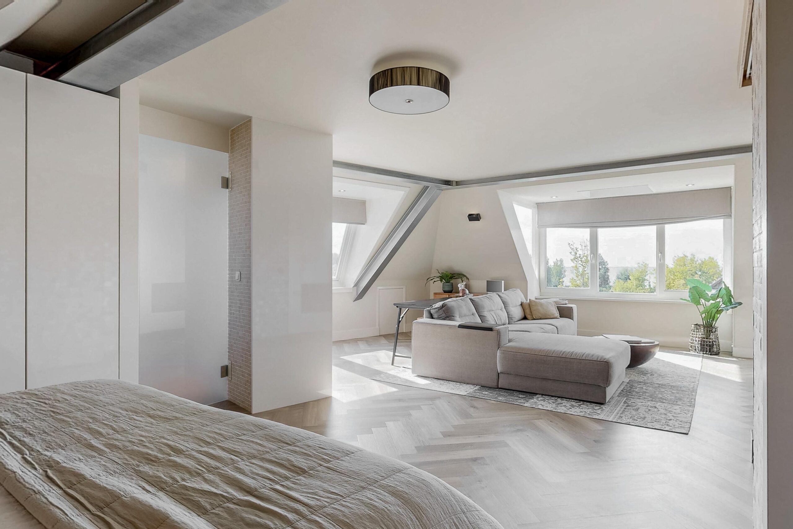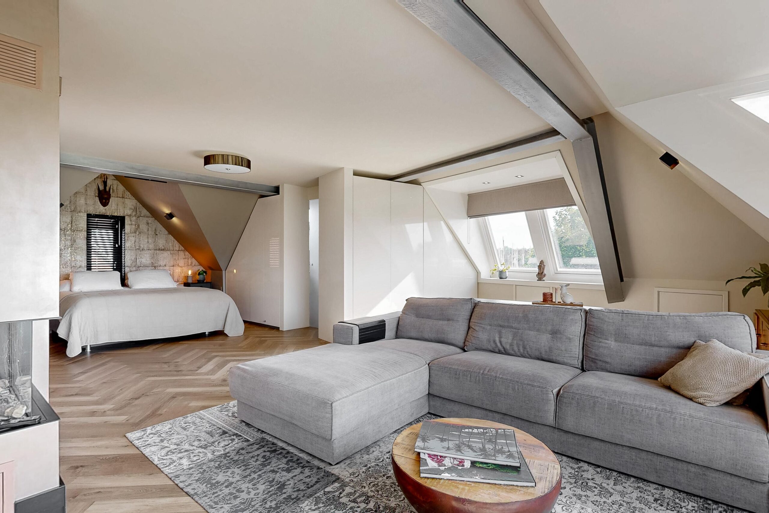 Tweede verdieping: open woon-/slaapkamer met airco, luxe 3e badkamer met stoomdouchecabine, wastafelmeubel en 3e toilet.
