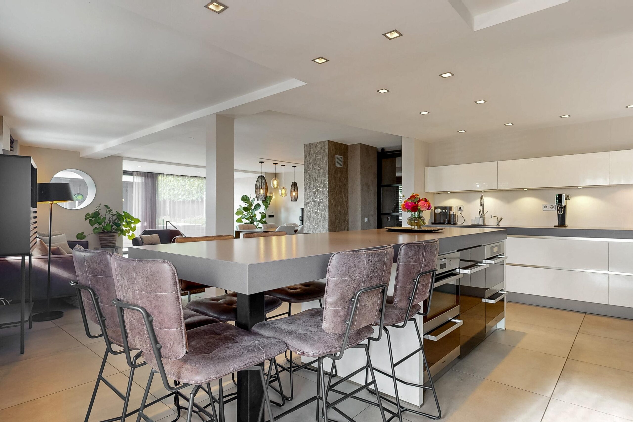 Indeling loopniveau: hal met trapopgang, open woonkeuken met uitgebreid unit met kookeiland, voorzien van inbouw koelkast, inductiekookplaat, afzuigkap, vaatwasser, stoomoven, combimagnetron, 2 x warmhoudlade, Quooker en composiet aanrecht, ruime woonkamer met brede schuifpui naar fantastische daktuin met fraaie veranda.