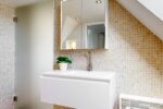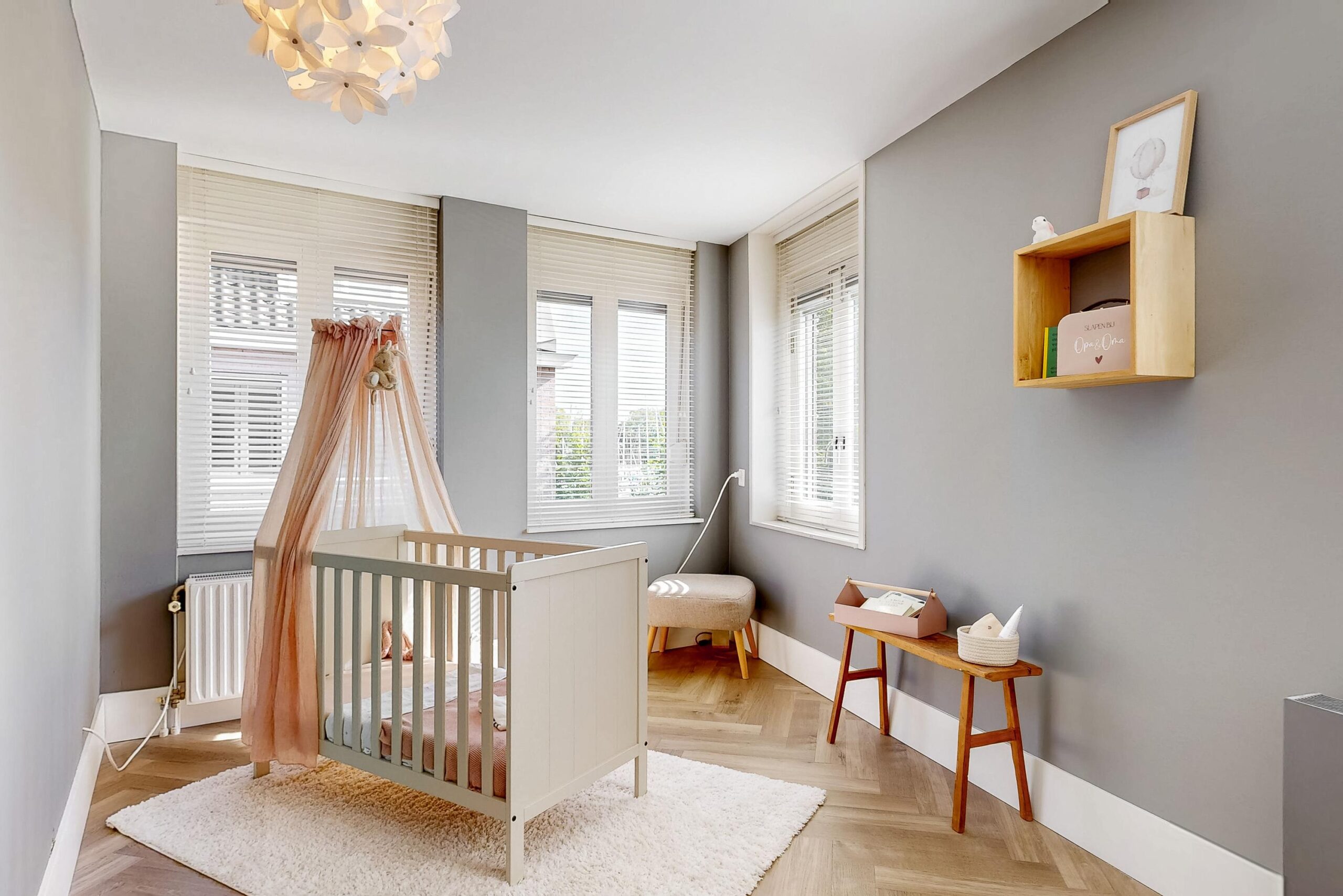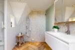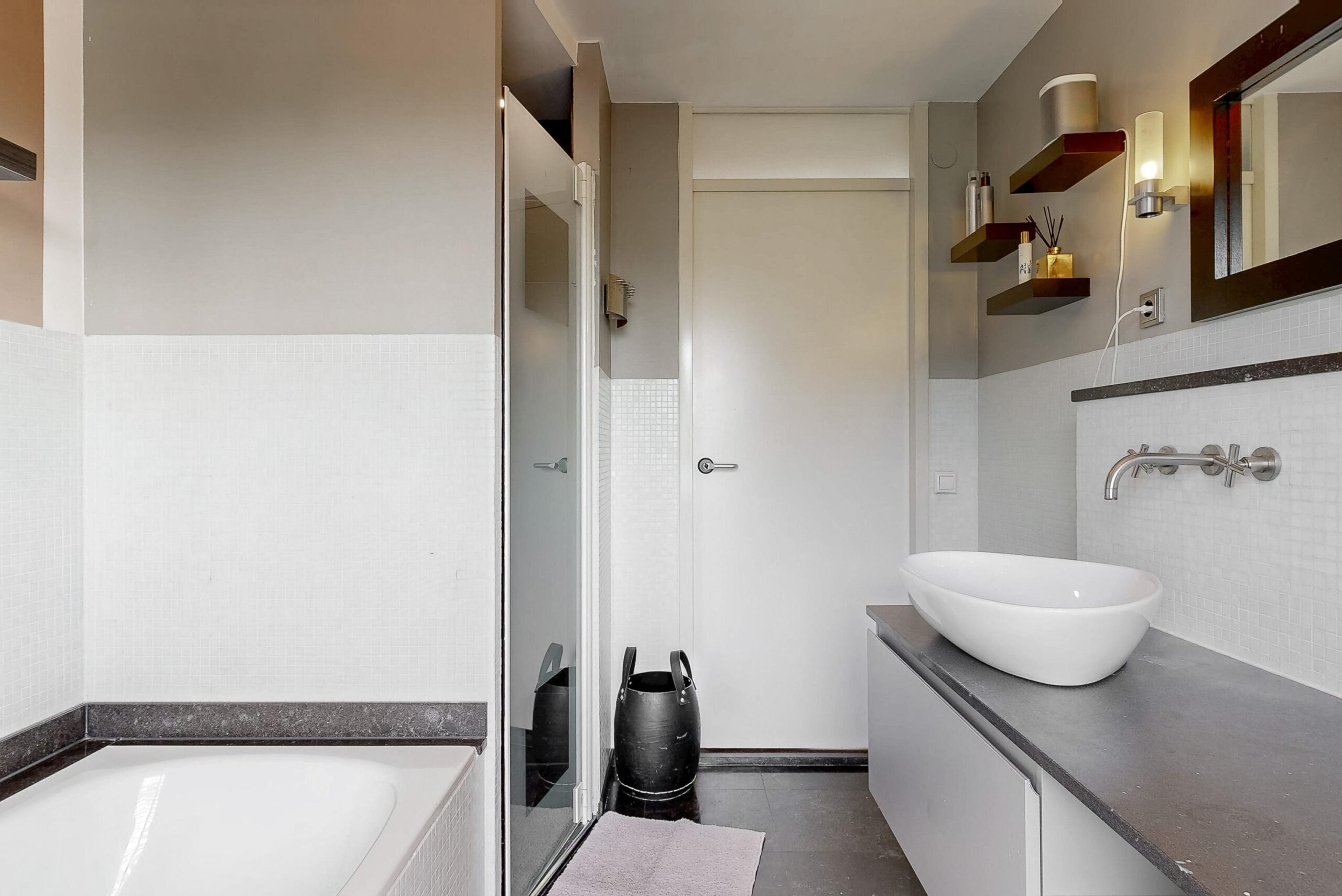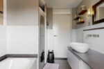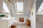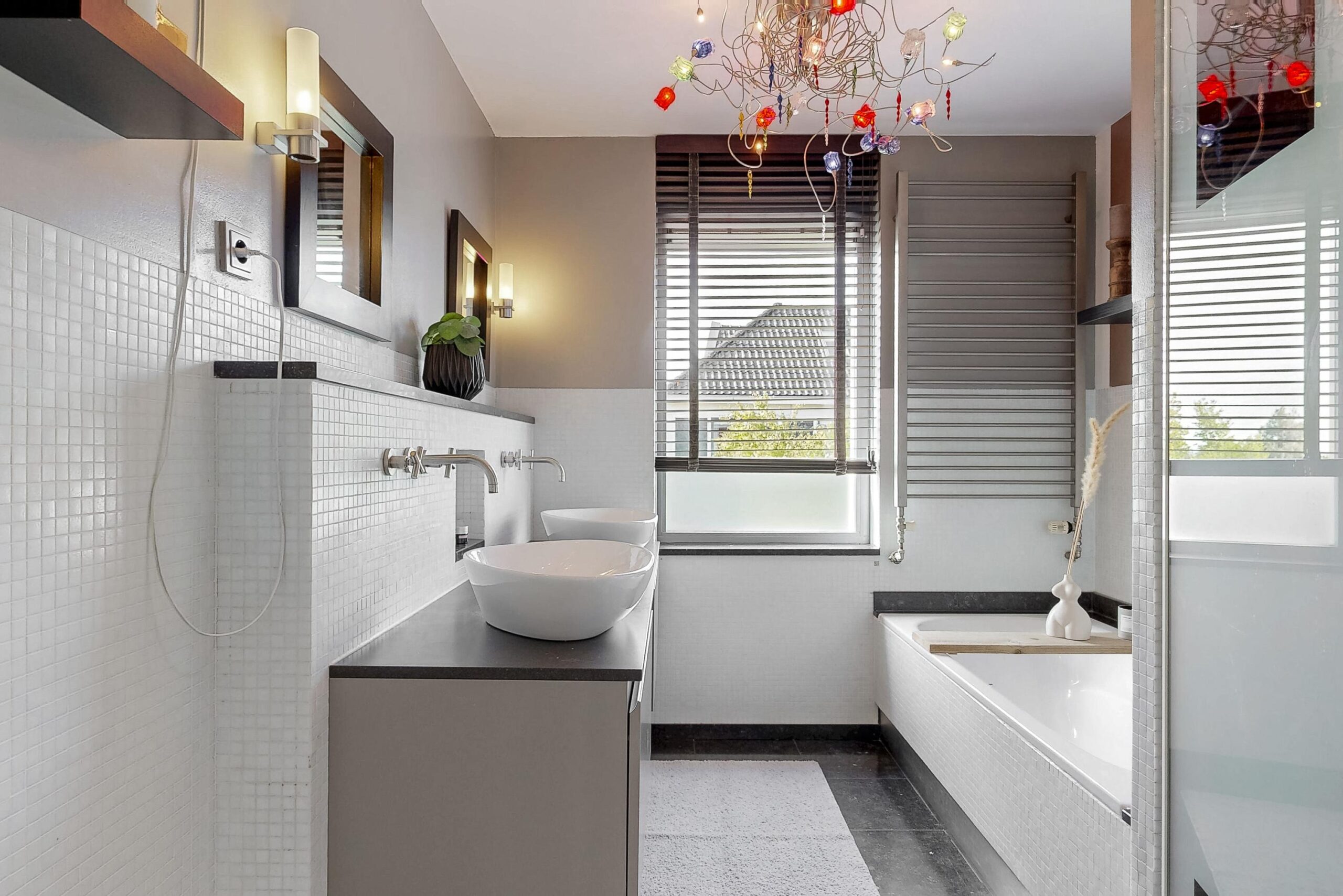 Eerste verdieping: drie slaapkamers en 2e badkamer met ligbad, inloopdouche, wastafelmeubel, designradiator en separaat 2e toilet.