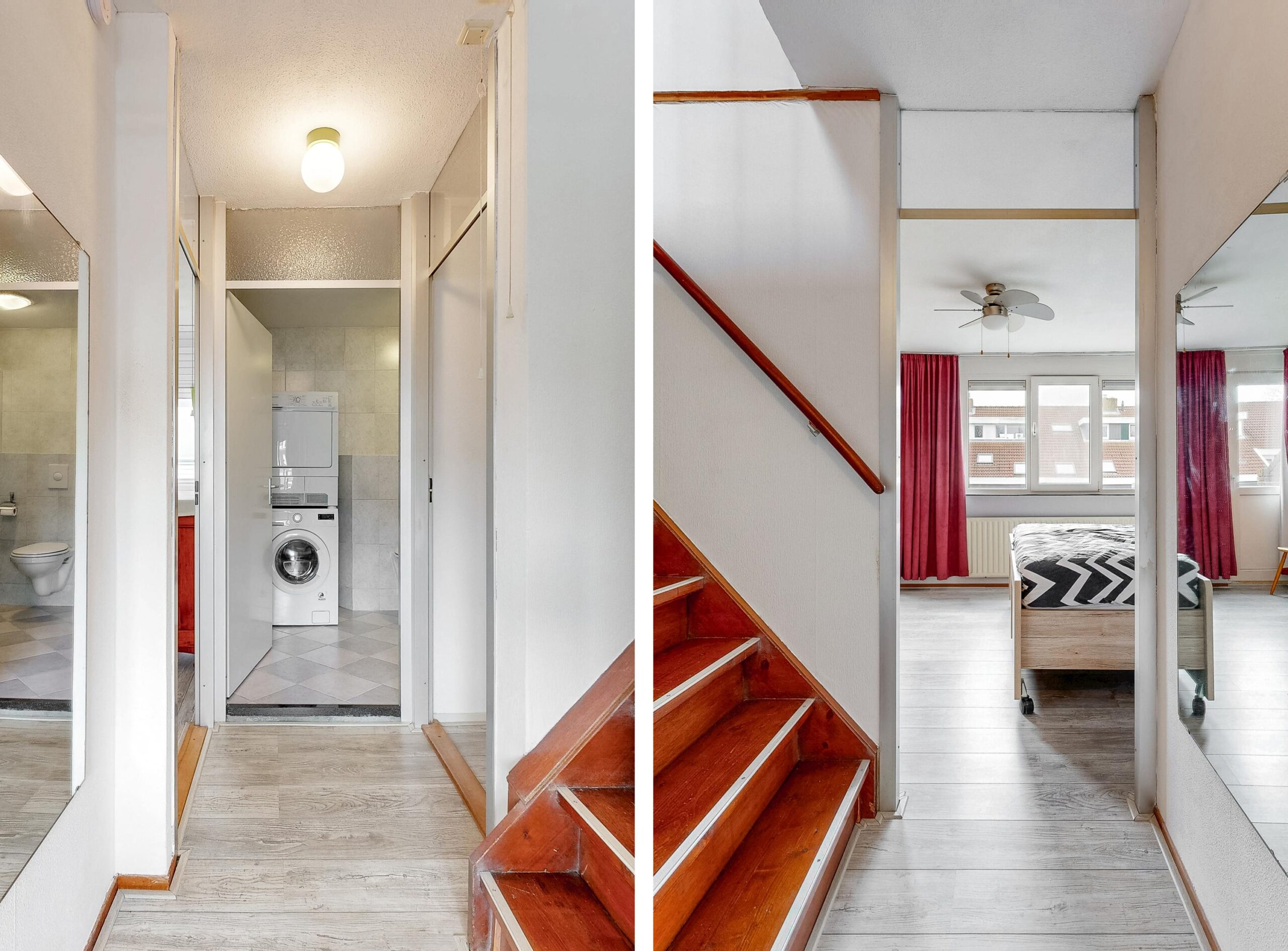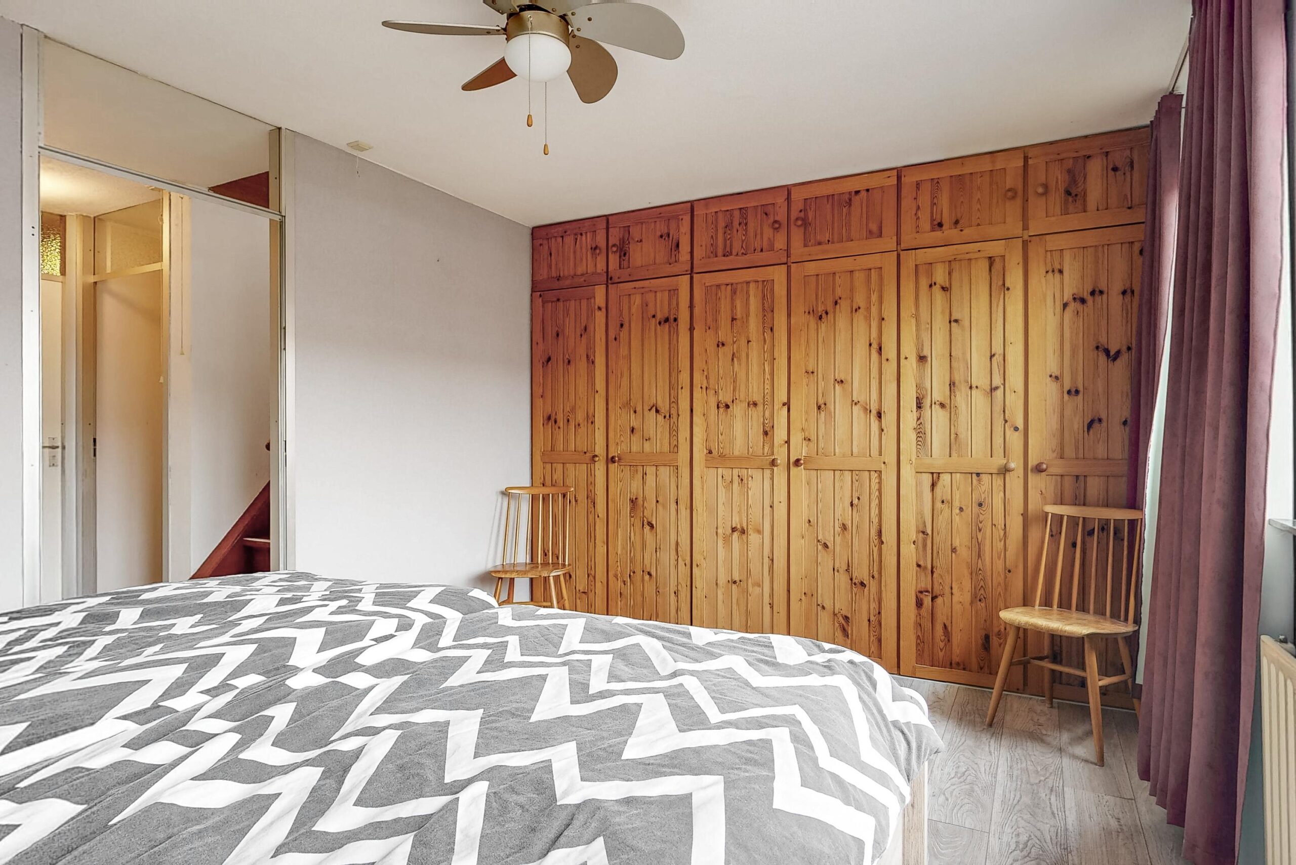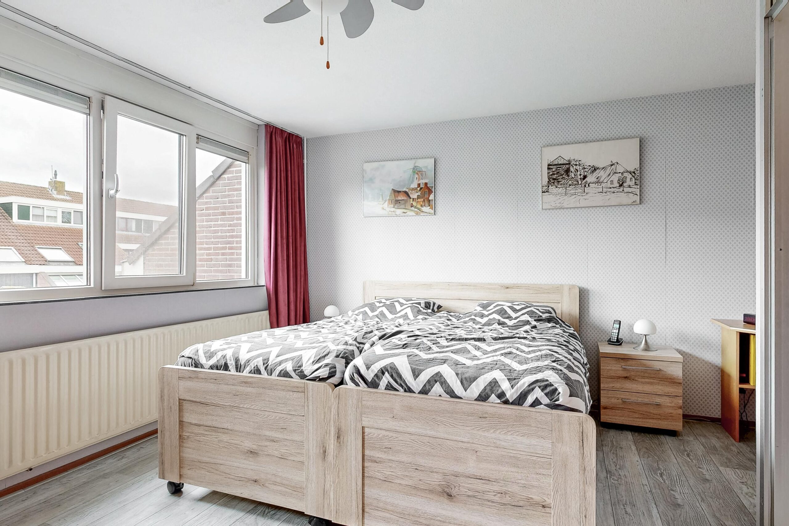 Eerste verdieping: overloop, royale slaapkamer aan de achterzijde met vaste kastenwand en frans balkon, 2e slaapkamer aan de voorzijde met dakraam en toegang tot berging, badkamer met douchecabine, 2e toilet, wastafel en aansluiting voor de wasmachine en droger.