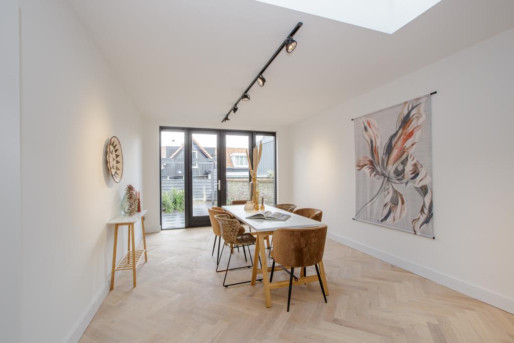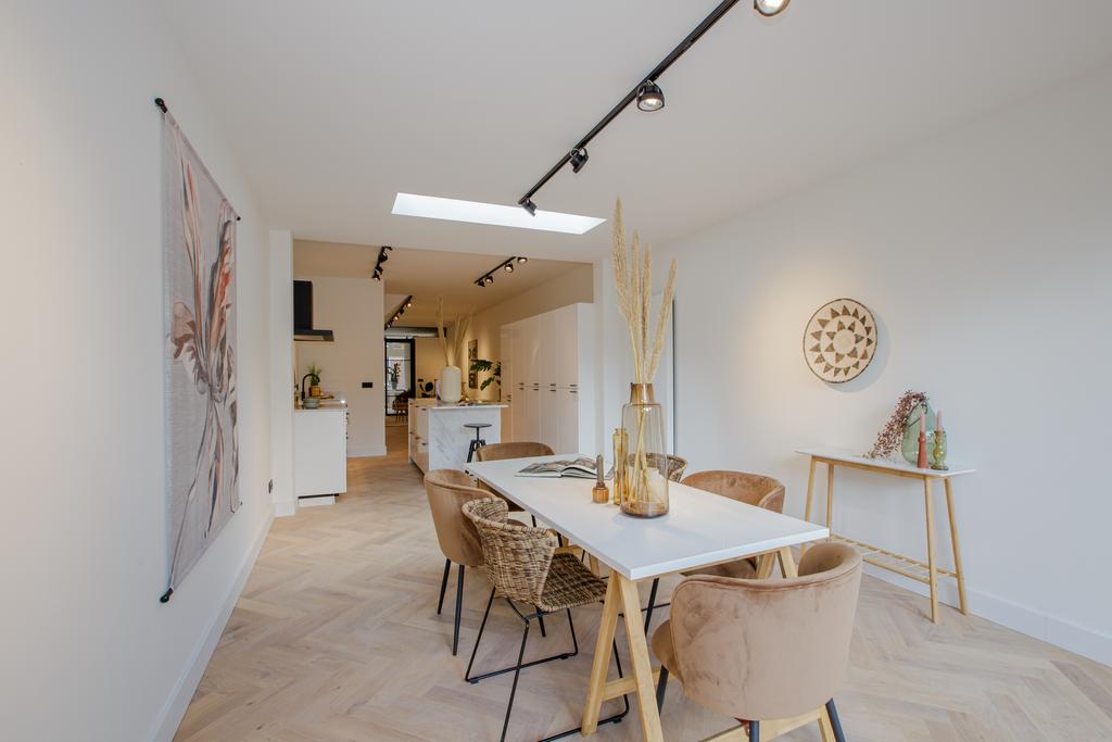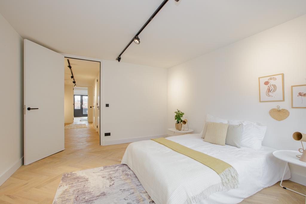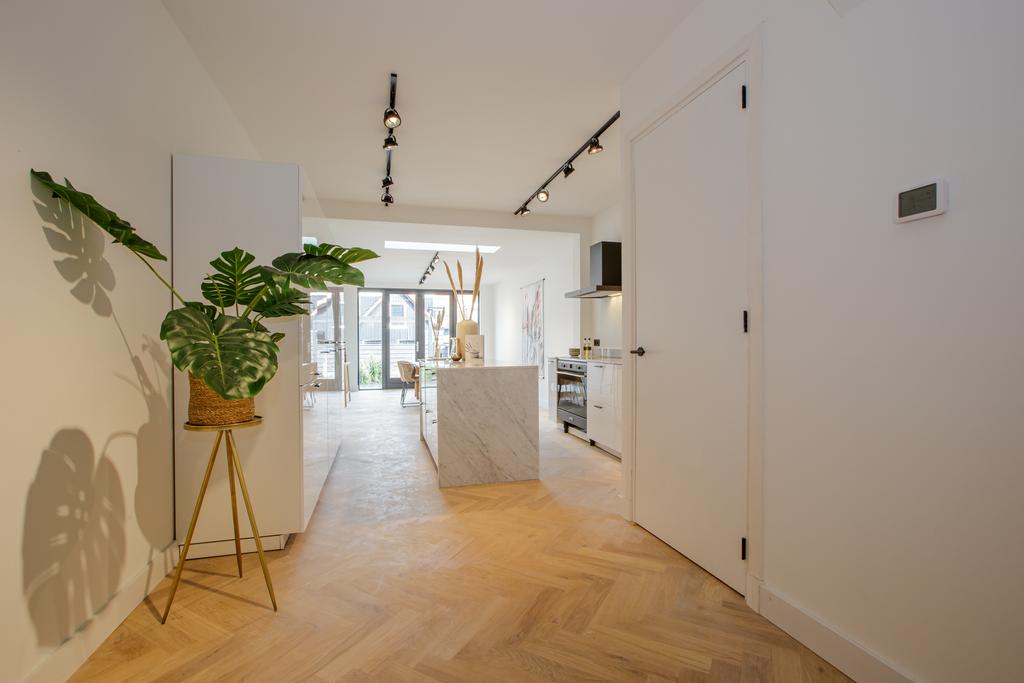 De woning is grotendeels voorzien van een eiken visgraat parketvloer, pleisterwerk wanden en plafonds.