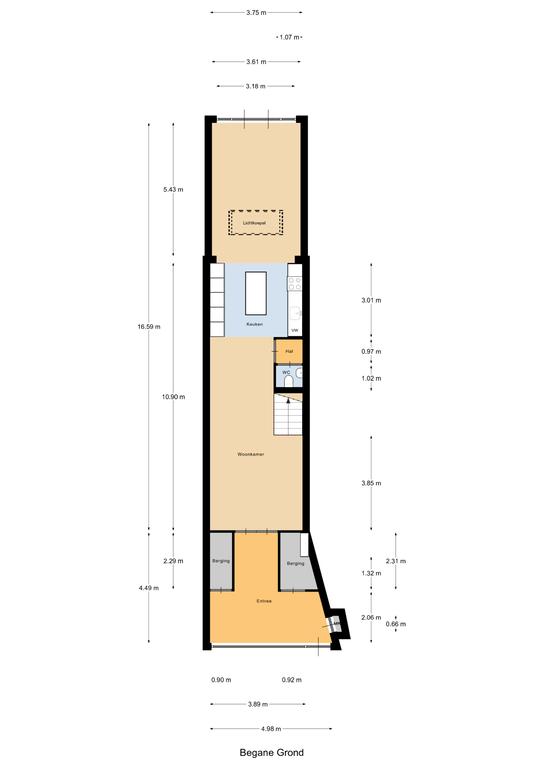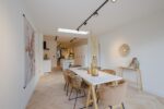 Indeling: hal met marmeren vloer en berging, via zwarte stalendeuren toegang tot de ruime woonkamer met hoog plafond, trapopgang en toiletruimte voorzien van wandcloset, open keuken met uitgebreide keukenunit voorzien van inbouw koelkast/vriezer, vaatwasser, afzuigkap, 90 cm breed fornuis met inductiekookplaat en elektrische oven, eetgedeelte met lichtkoepel en openslaande deuren naar de tuin.