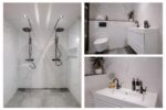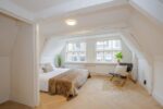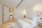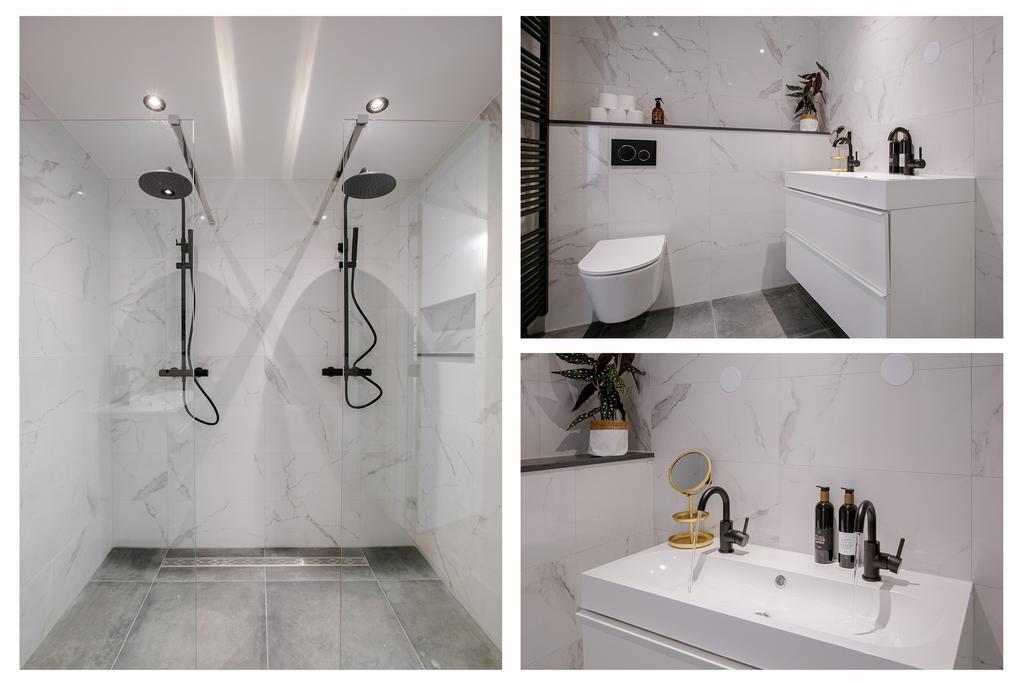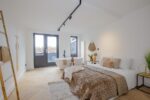 Eerste verdieping: overloop, wasmachine-/drogerruimte, luxe badkamer met dubbele inloopdouche, 2e wandcloset, dubbele wastafel en designradiator, ruime slaapkamer aan de voorzijde, 2e slaapkamer met vrijstaand bad en toegang tot ruim dakterras aan de achterzijde.