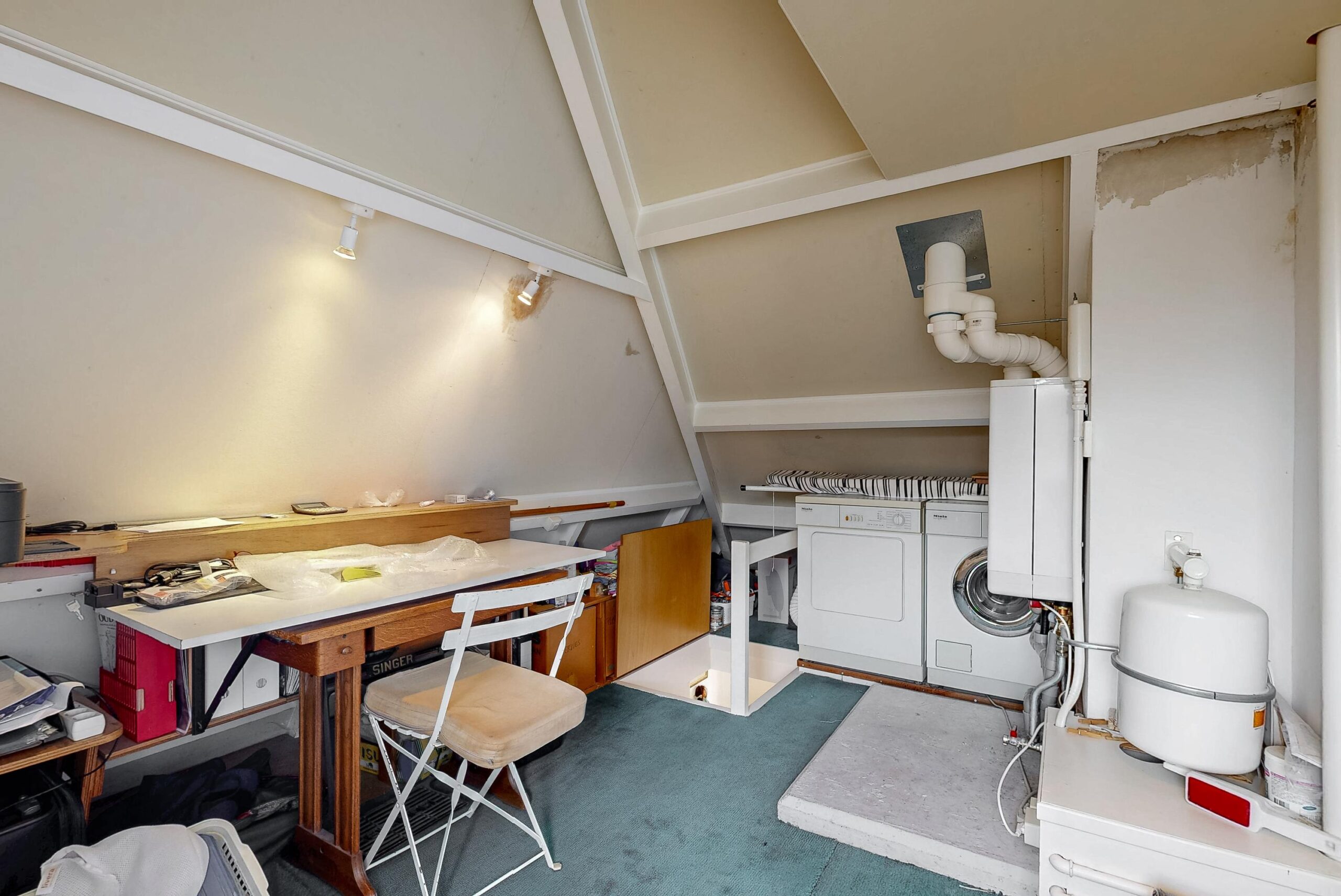 Tweede verdieping: open ruimte met CV opstelling en de wasmachine-, drogeropstelling. Deze ruimte is verder prima te gebruiken als hobby-/kantoor-/bergruimte.
