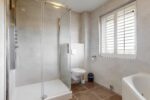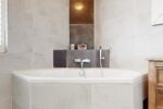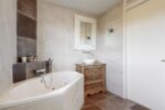 Overloop met toegang tot twee slaapkamers, waaronder de master bedroom en de ruime badkamer. De master bedroom beschikt over een inloopkast. De badkamer is voorzien van een douchecabine, tweede toilet, wastafelmeubel en een bubbelbad.