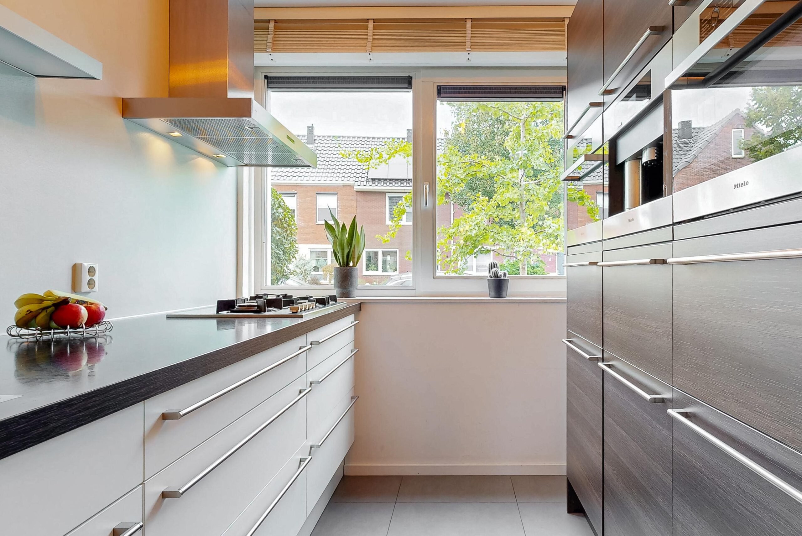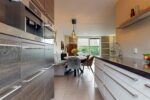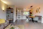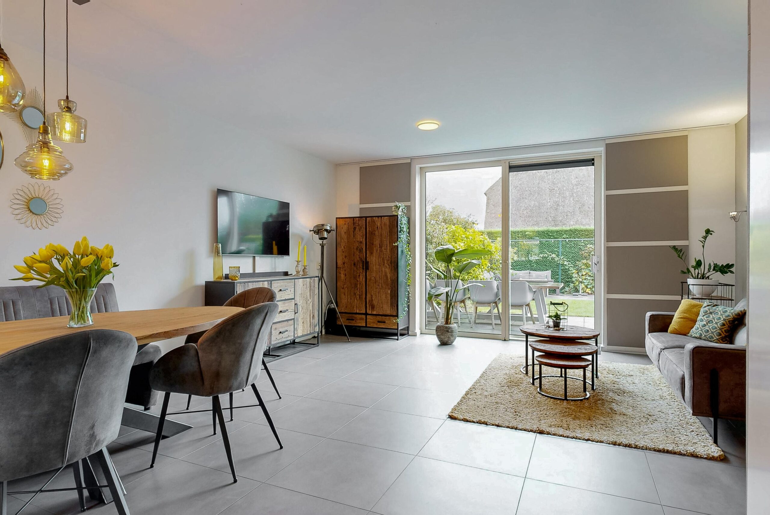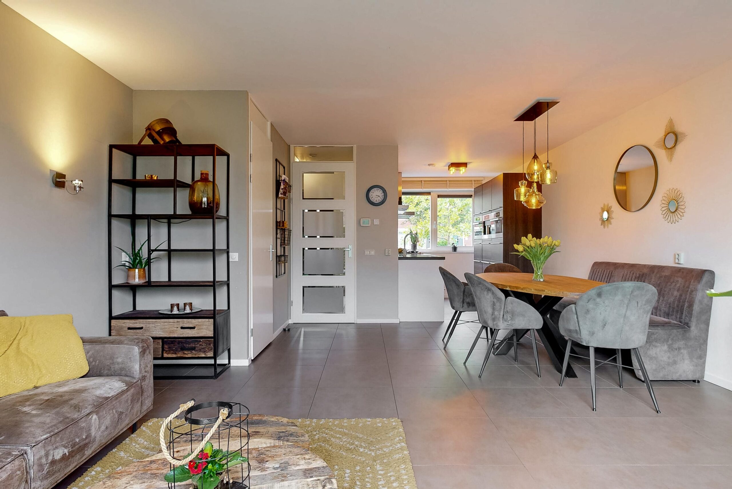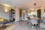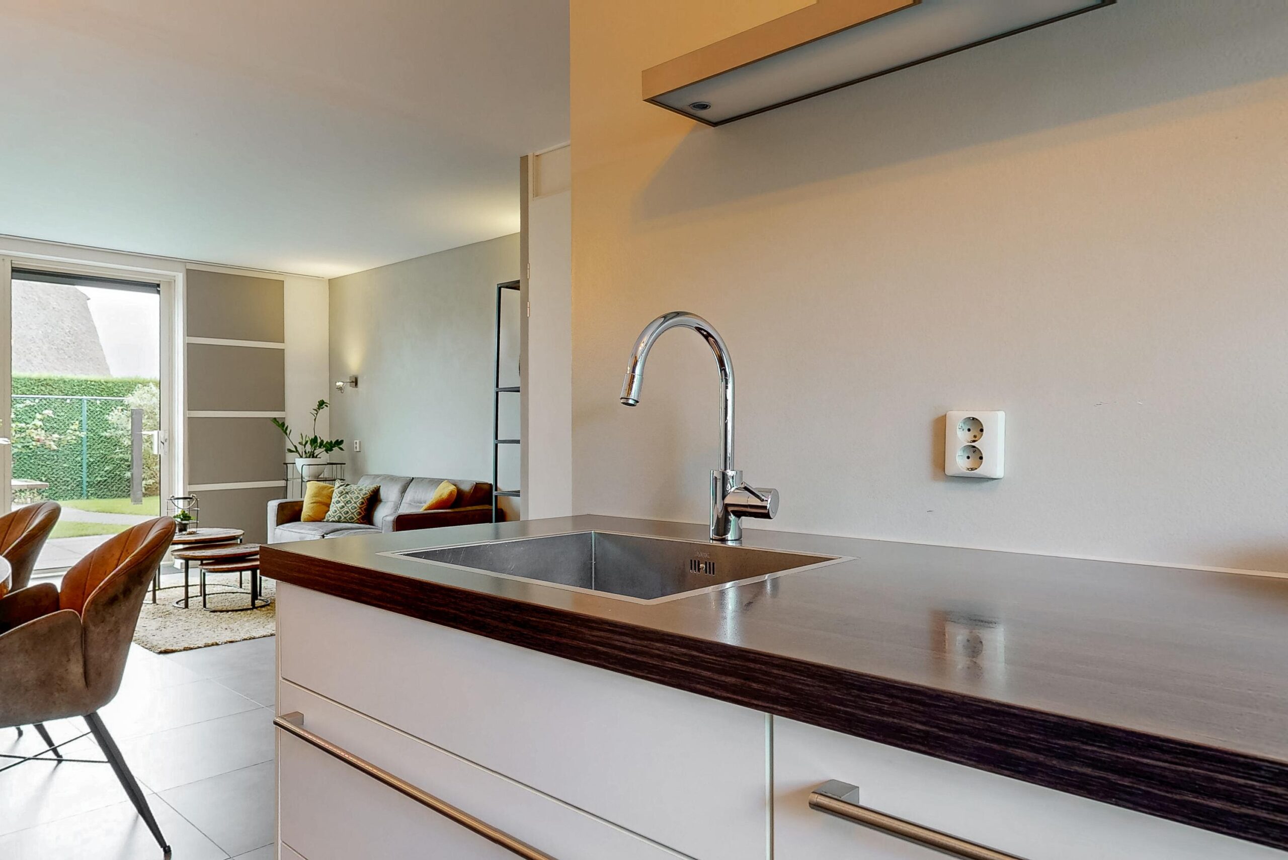Indeling: hal met toilet en trapopgang, woonkamer met schuifpui, plavuizenvloer met vloerverwarming, vliesbehang wanden en pleisterwerk plafond, open keuken met dubbele rechte unit voorzien van inbouw 5 pits gaskomfoor, afzuigkap, vaatwasser, koelkast, vriezer, combistoomoven, combimagnetron en koffiezetapparaat met wateraansluiting.