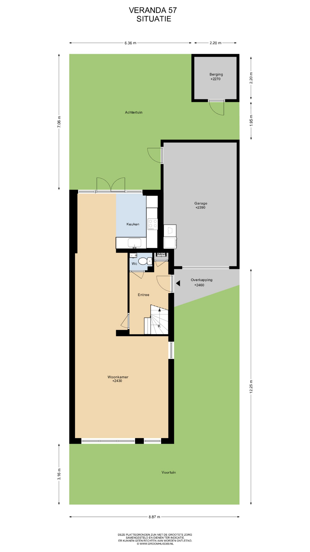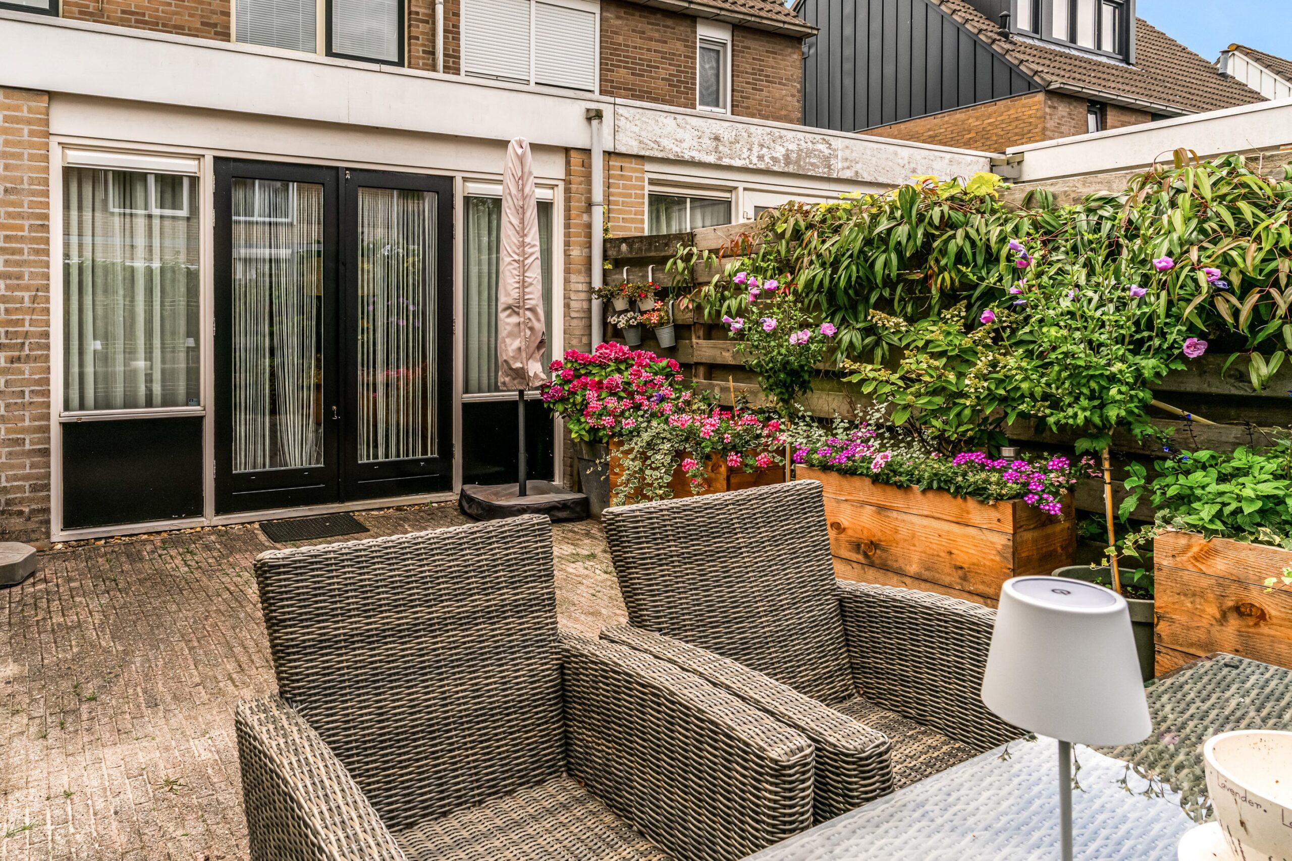 De garage is voorzien van een elektrische deur en aansluiting voor de wasmachine en droger. Op eigen terrein kunt u 2 auto’s parkeren.