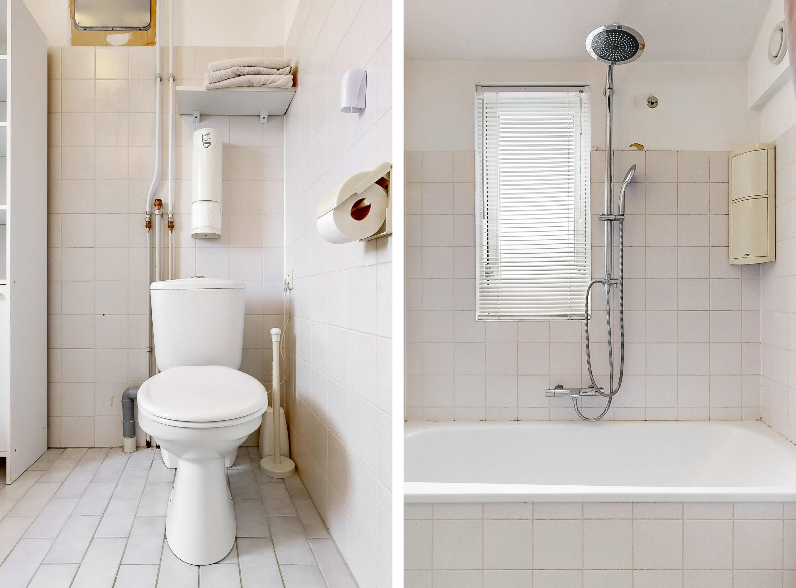 Eerste verdieping: overloop, slaapkamer aan de achterzijde, witte badkamer met ligbad, wastafel en toilet (sanibroyeur), royale 2e slaapkamer met vaste schuifdeurkast aan de voorzijde. Eenvoudig is een 3e slaapkamer te realiseren.