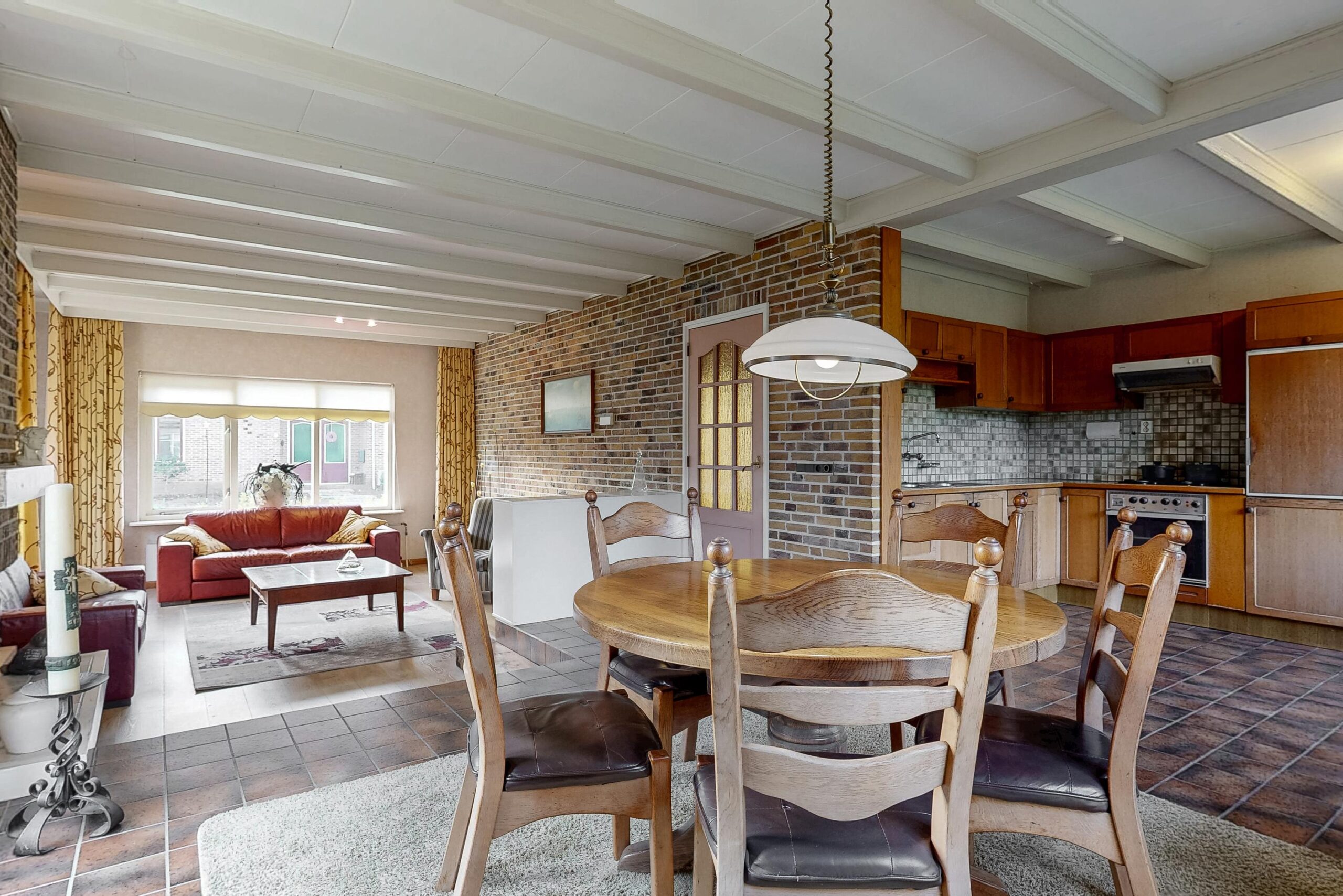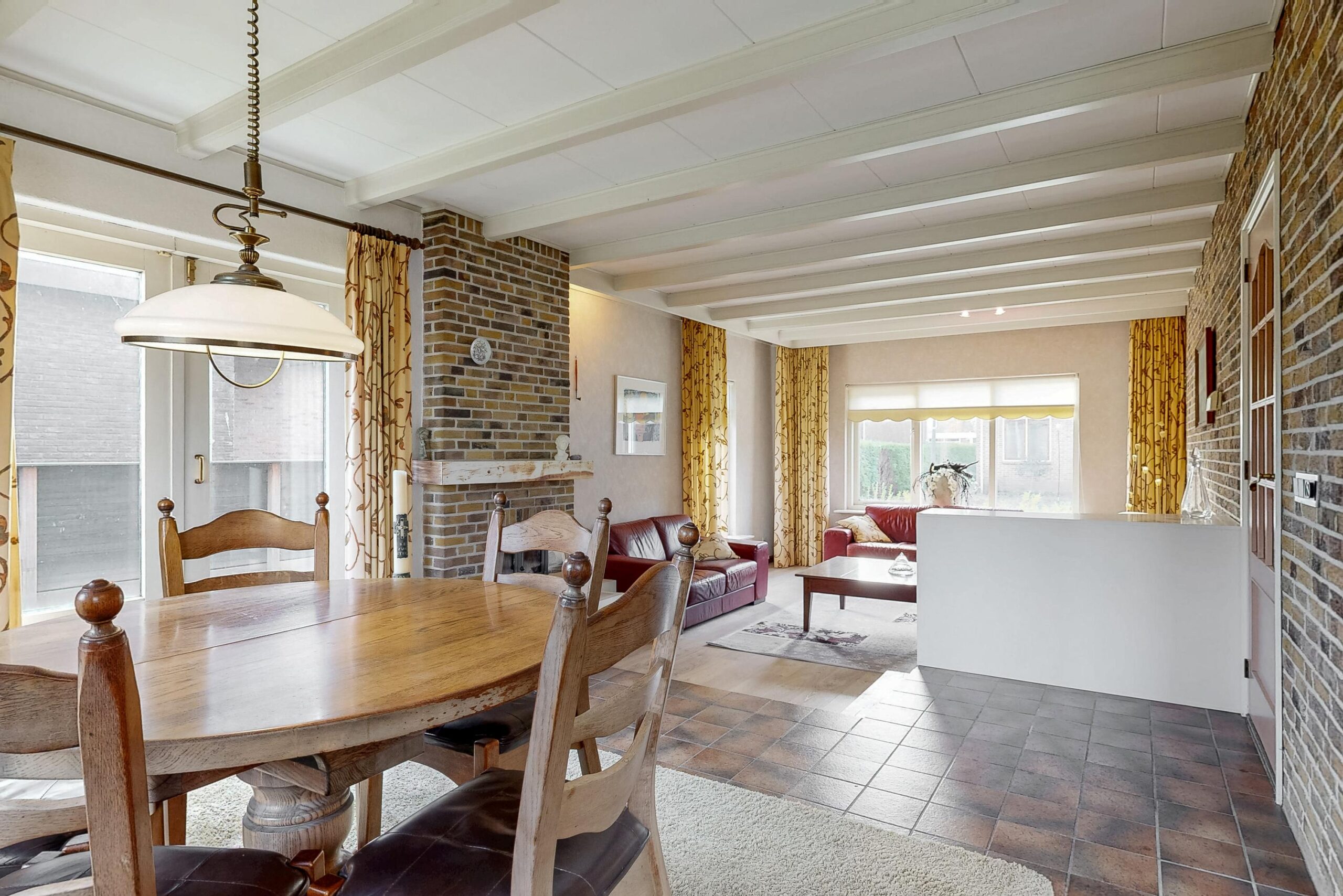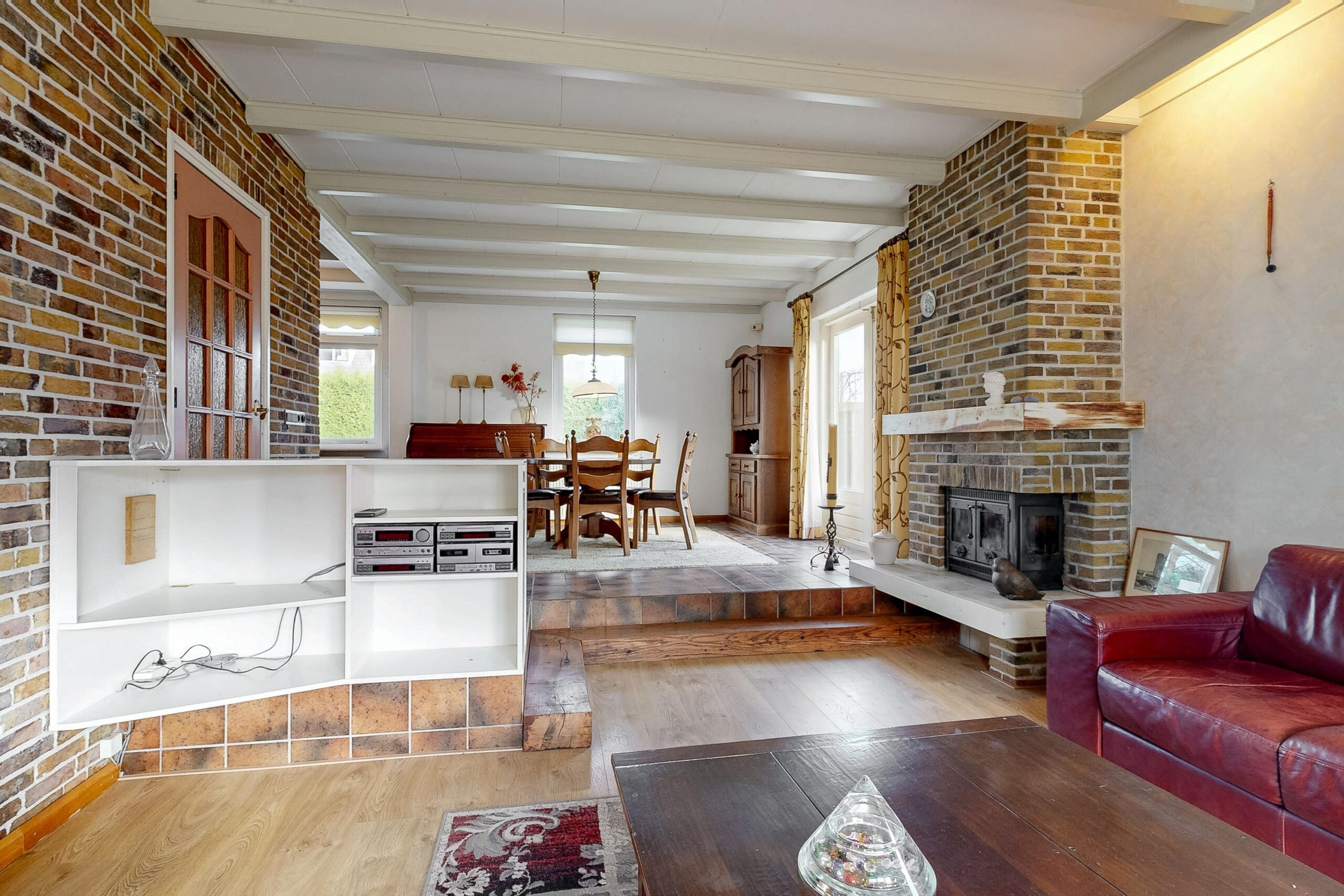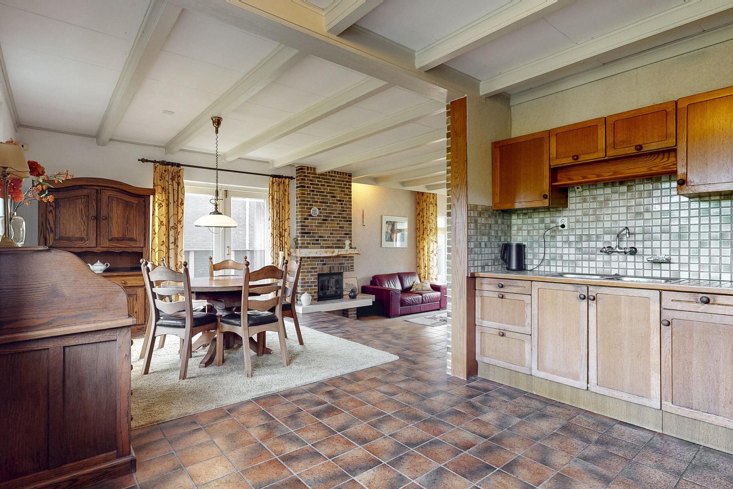 Indeling: hal met vide, trapopgang en toilet, ruime woonkamer met speels niveauverschil, balkenplafond en open haard, open keuken met L-vormige eiken unit voorzien van inbouwapparatuur, bijkeuken, werk-/slaapkamer, toegang tot stahoge kelder, binnendoor bereikbare royale garage met vlizotrap naar grote bergzolder.