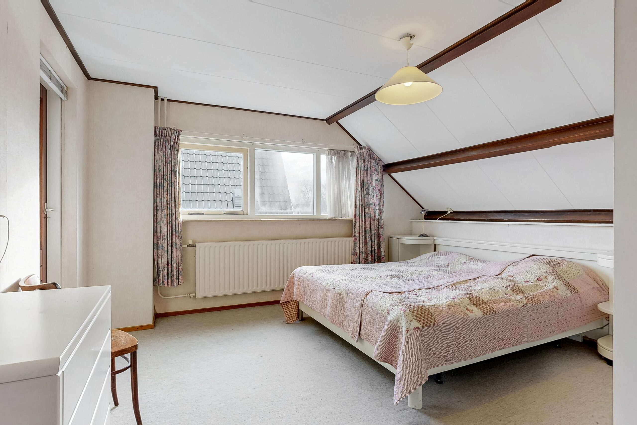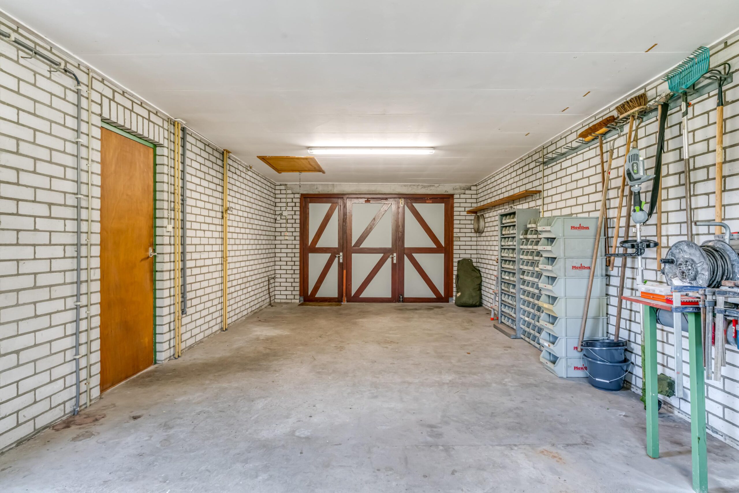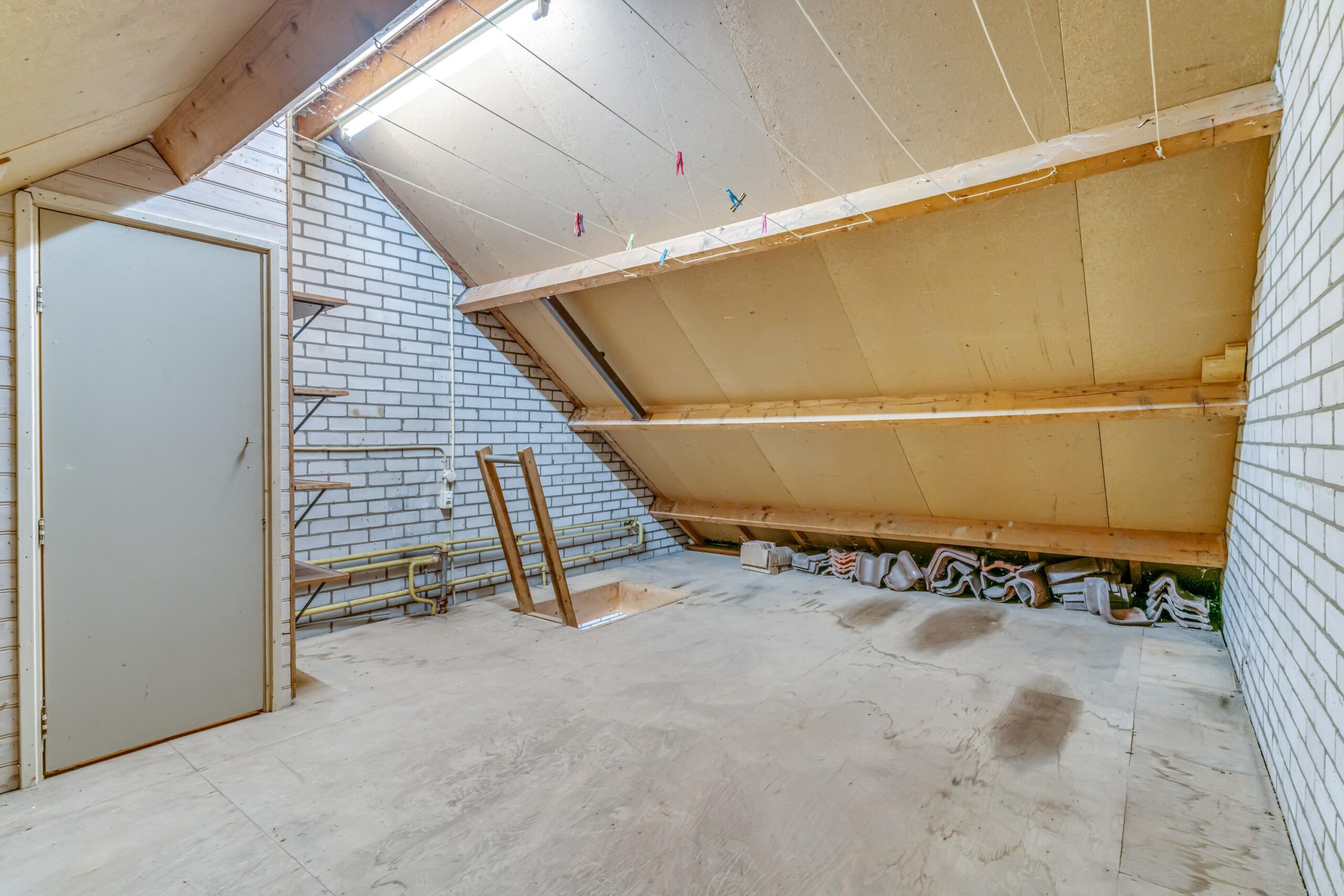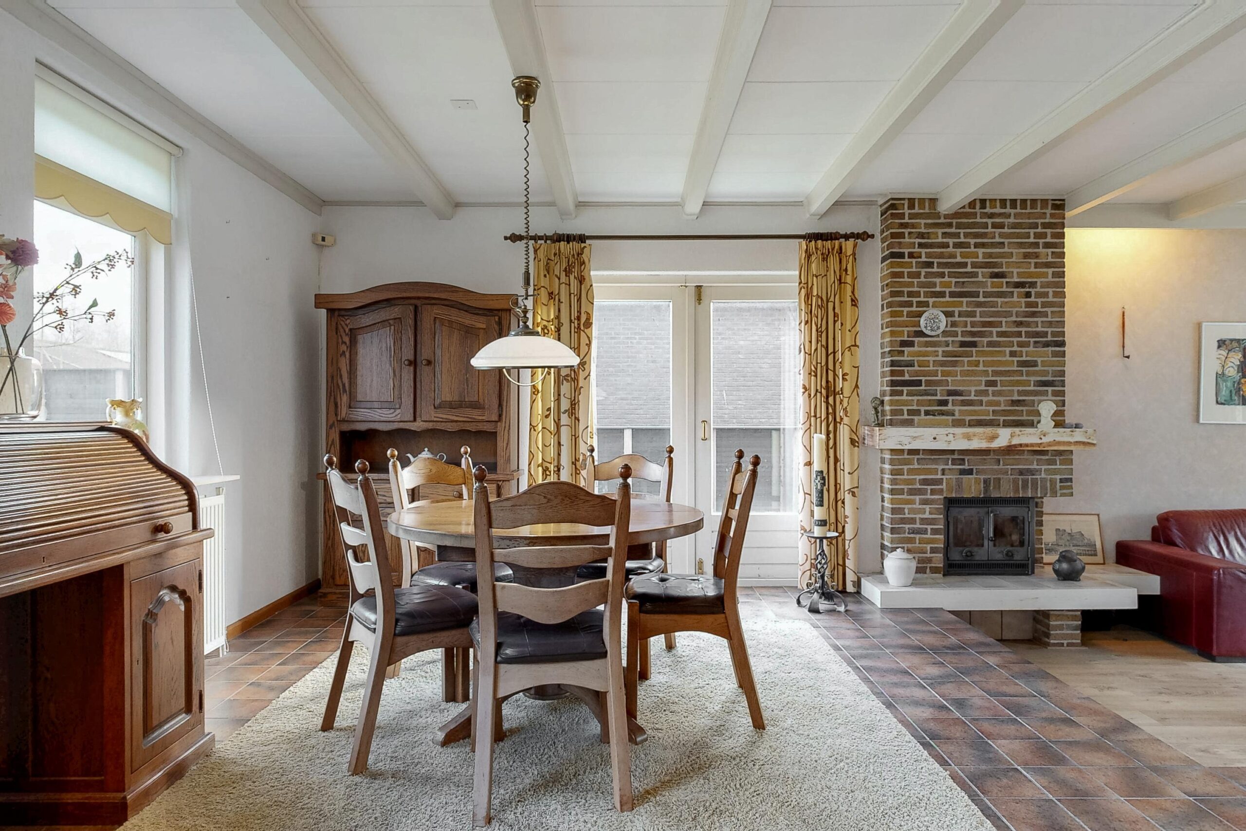 Indeling: hal met vide, trapopgang en toilet, ruime woonkamer met speels niveauverschil, balkenplafond en open haard, open keuken met L-vormige eiken unit voorzien van inbouwapparatuur, bijkeuken, werk-/slaapkamer, toegang tot stahoge kelder, binnendoor bereikbare royale garage met vlizotrap naar grote bergzolder.