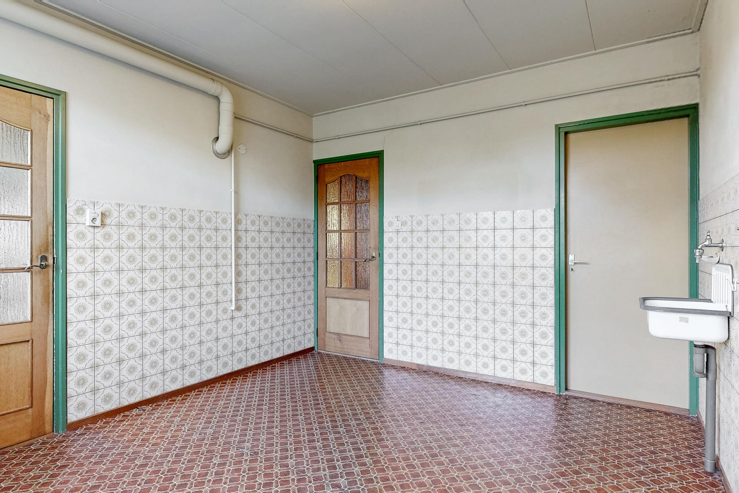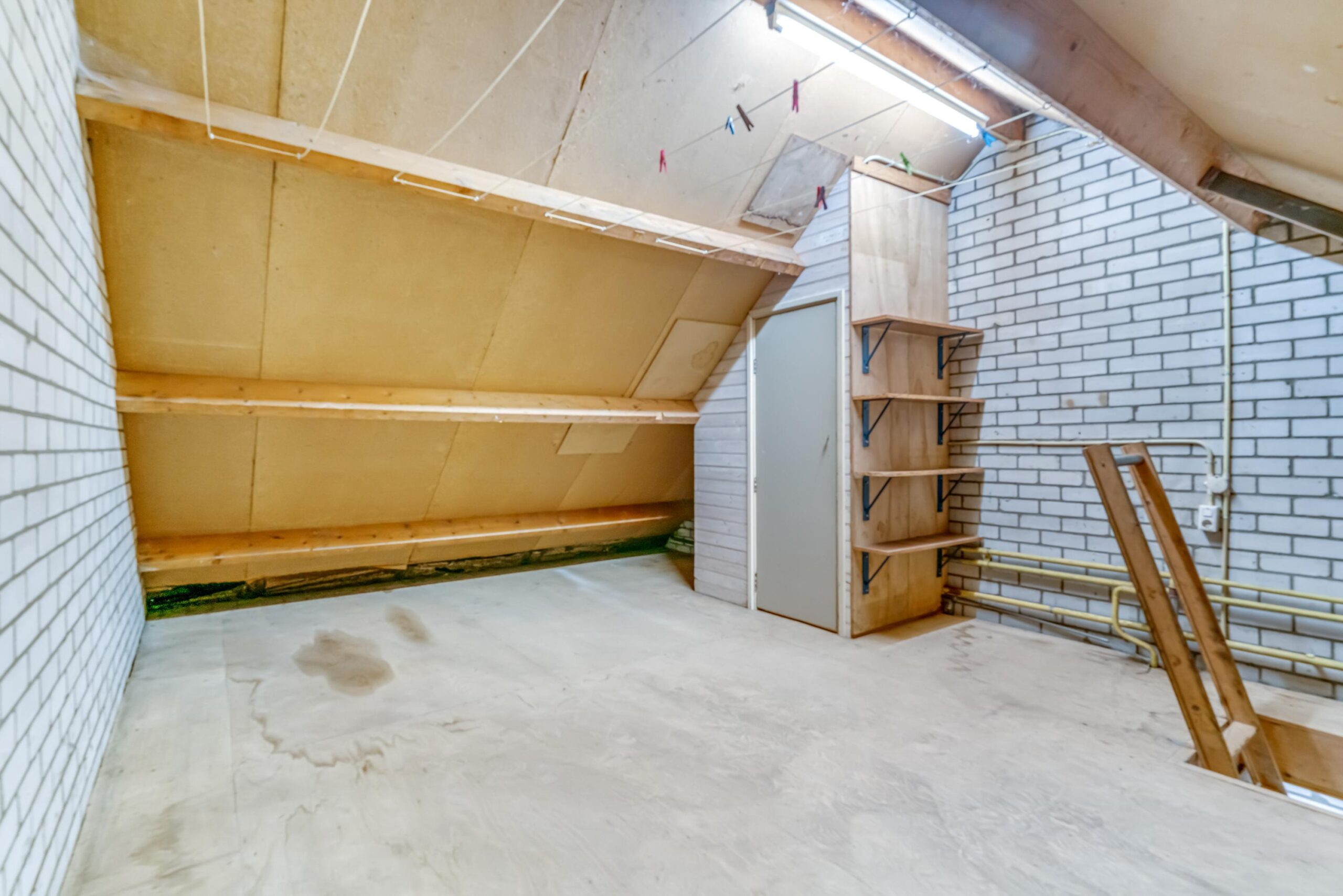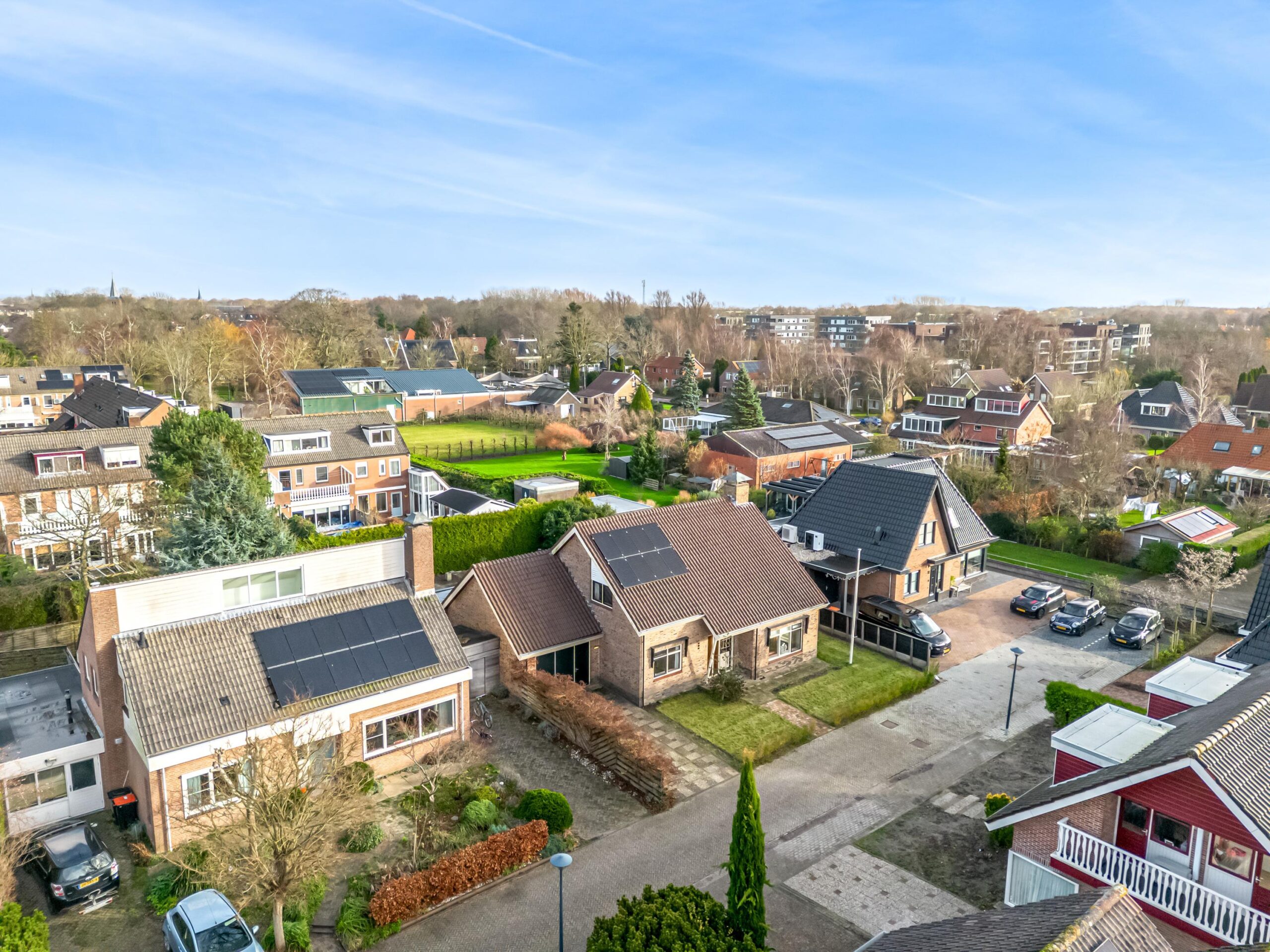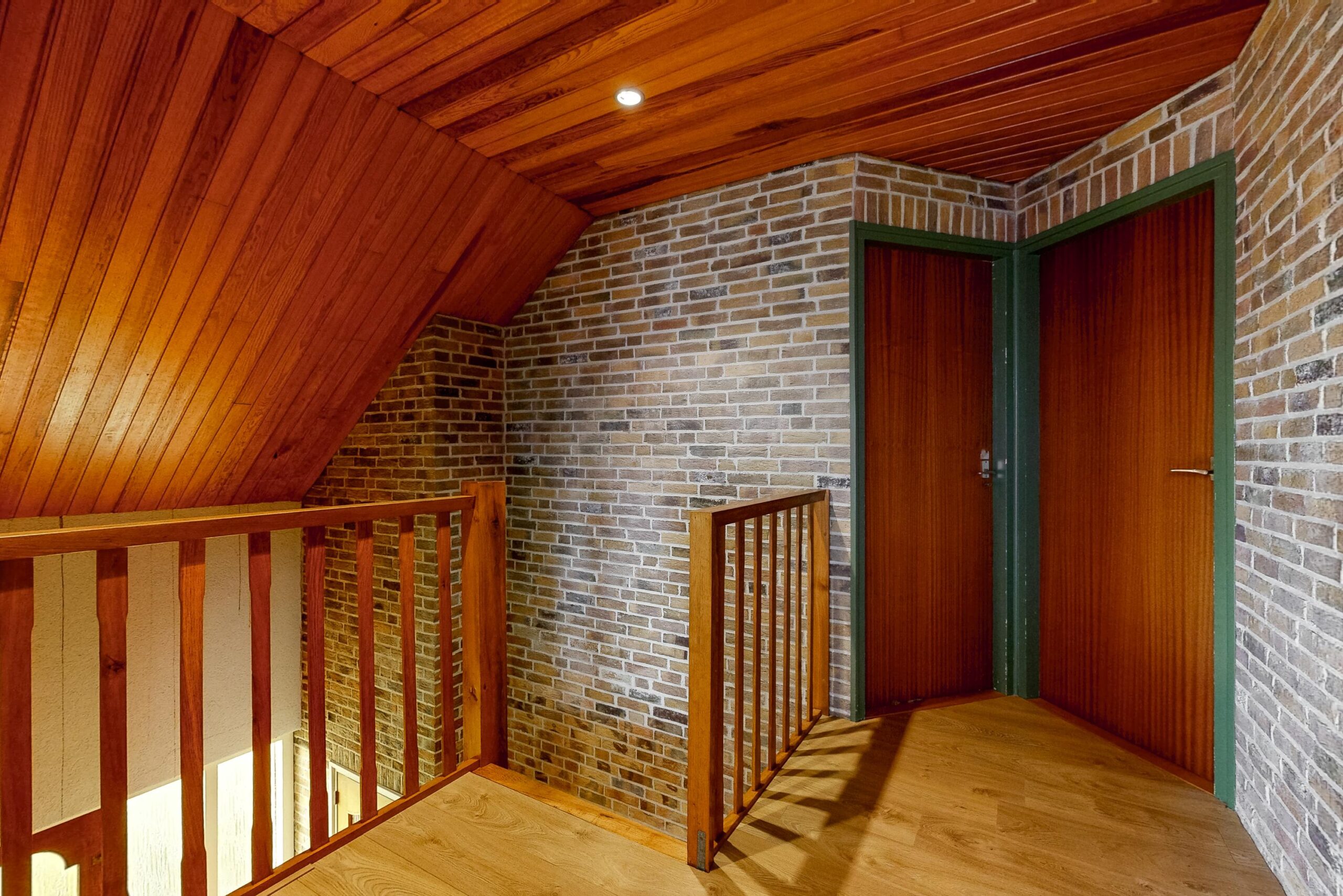 Indeling: hal met vide, trapopgang en toilet, ruime woonkamer met speels niveauverschil, balkenplafond en open haard, open keuken met L-vormige eiken unit voorzien van inbouwapparatuur, bijkeuken, werk-/slaapkamer, toegang tot stahoge kelder, binnendoor bereikbare royale garage met vlizotrap naar grote bergzolder.