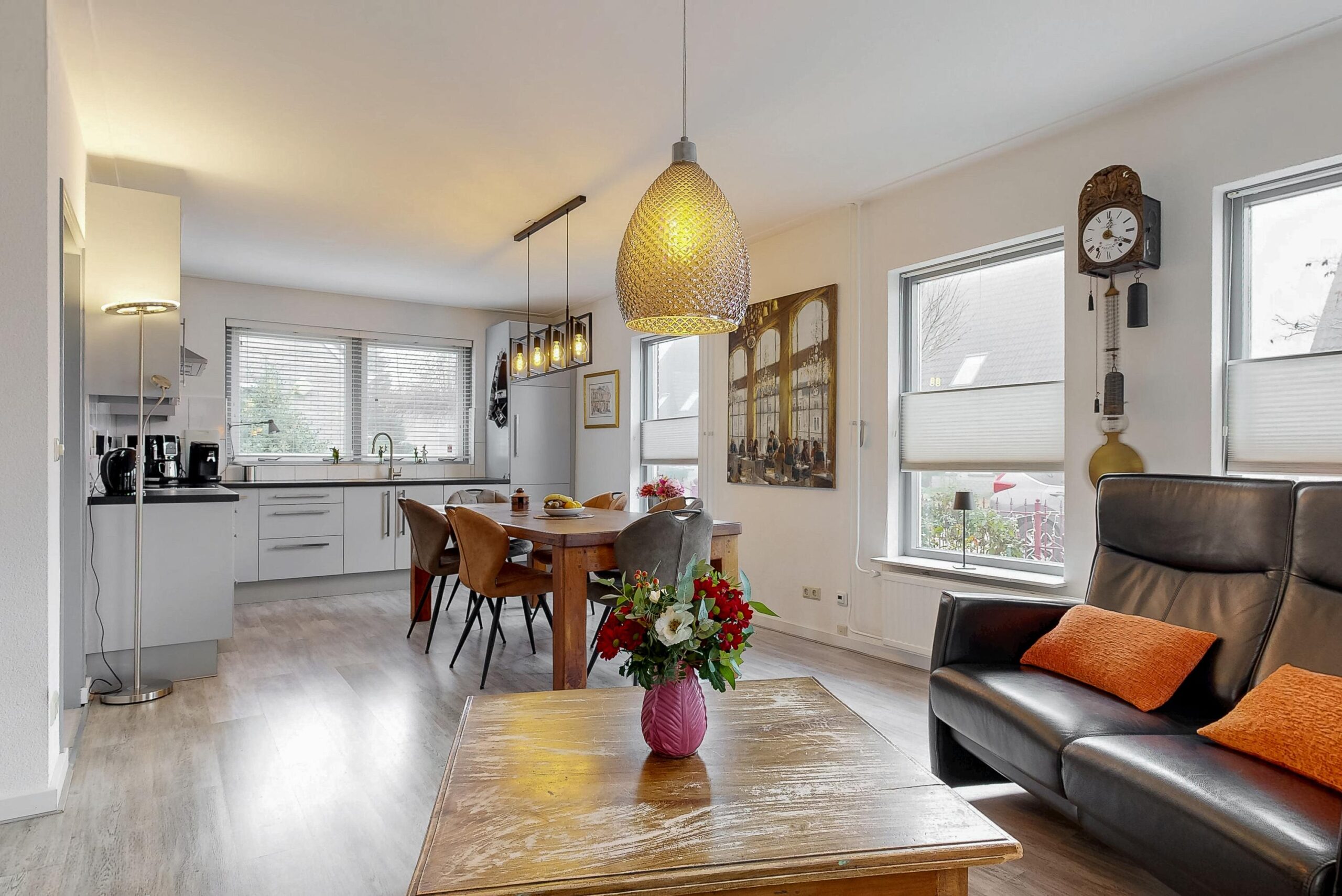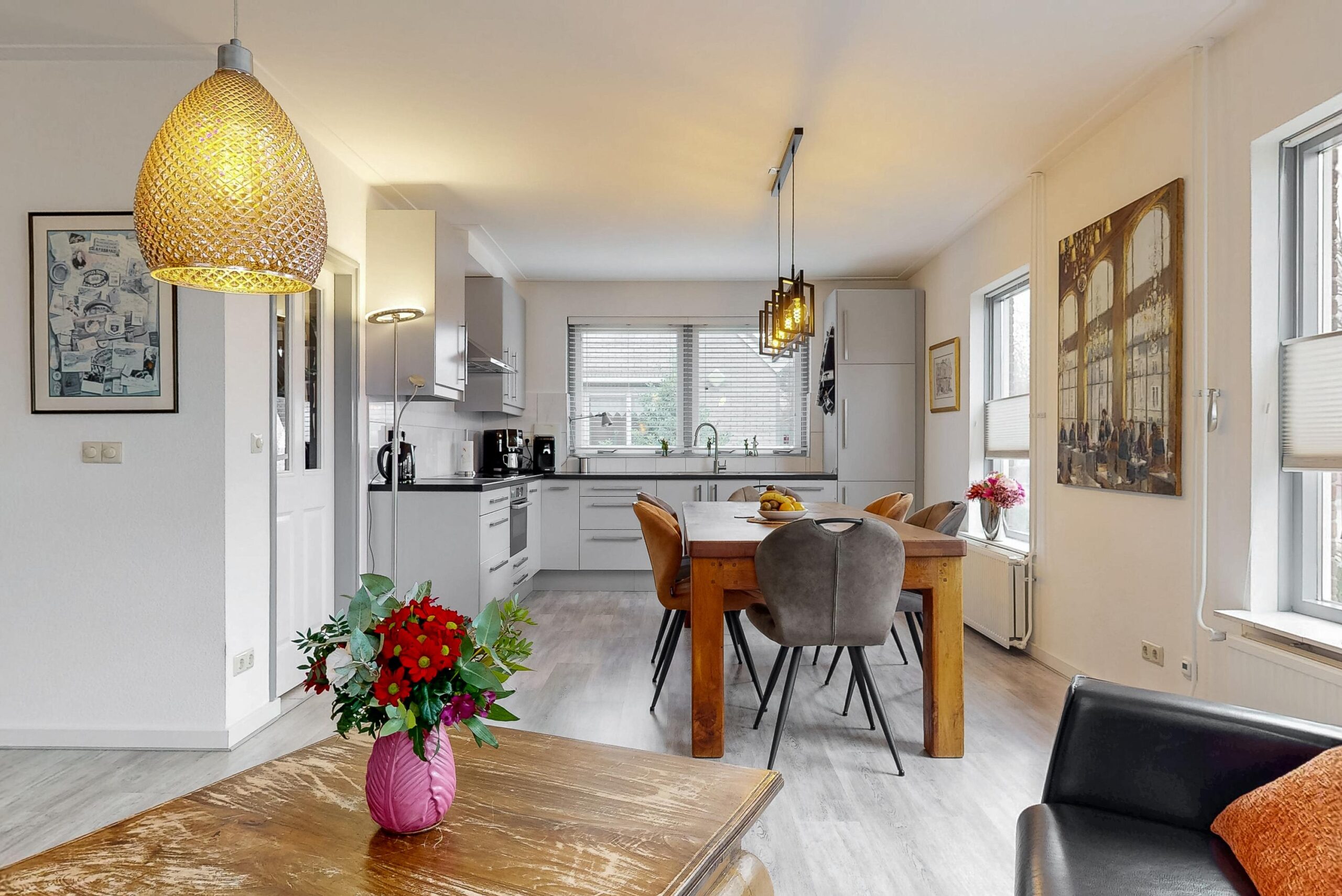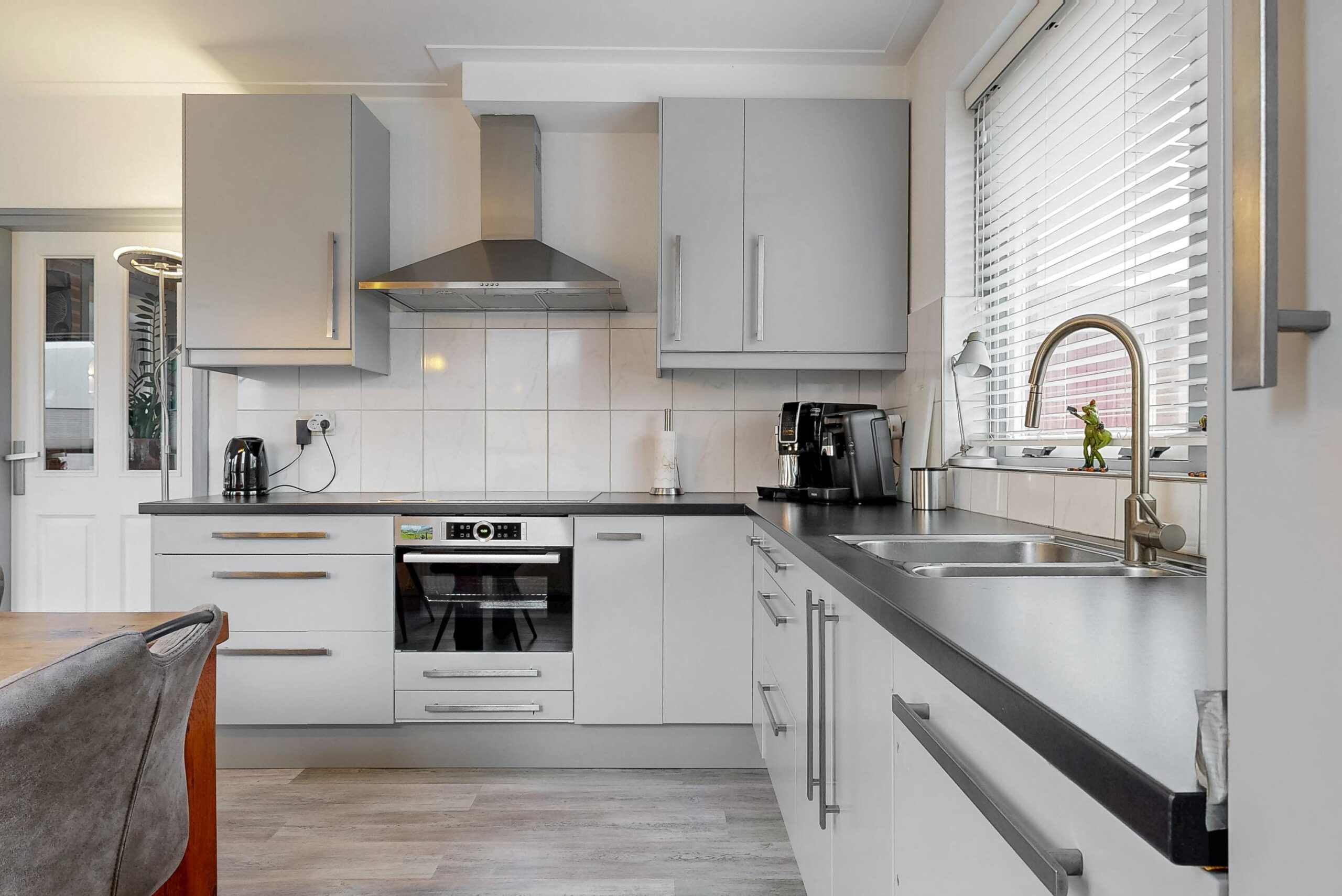 Ruime hal met toiletruimte voorzien van wandcloset, trapopgang, woonkamer met veel daglicht toetreding en twee deuren naar de tuin, woonkeuken met grijze L-vormige unit