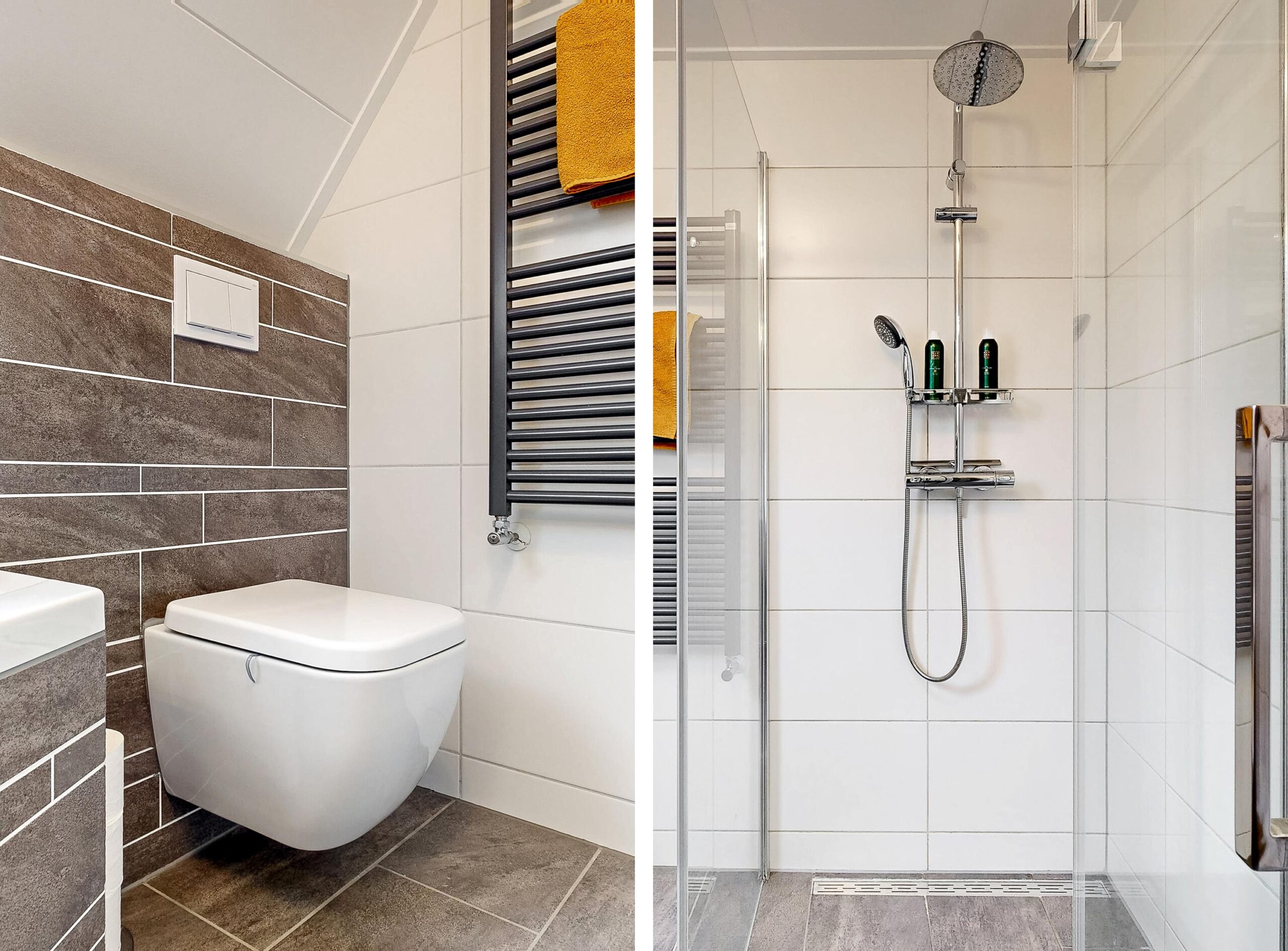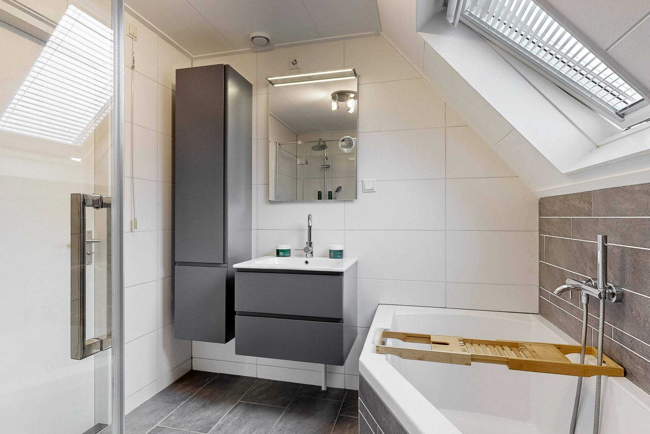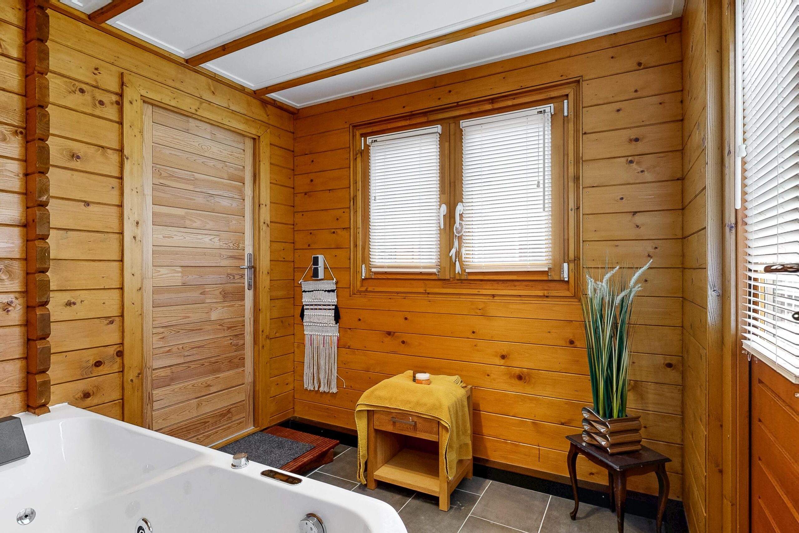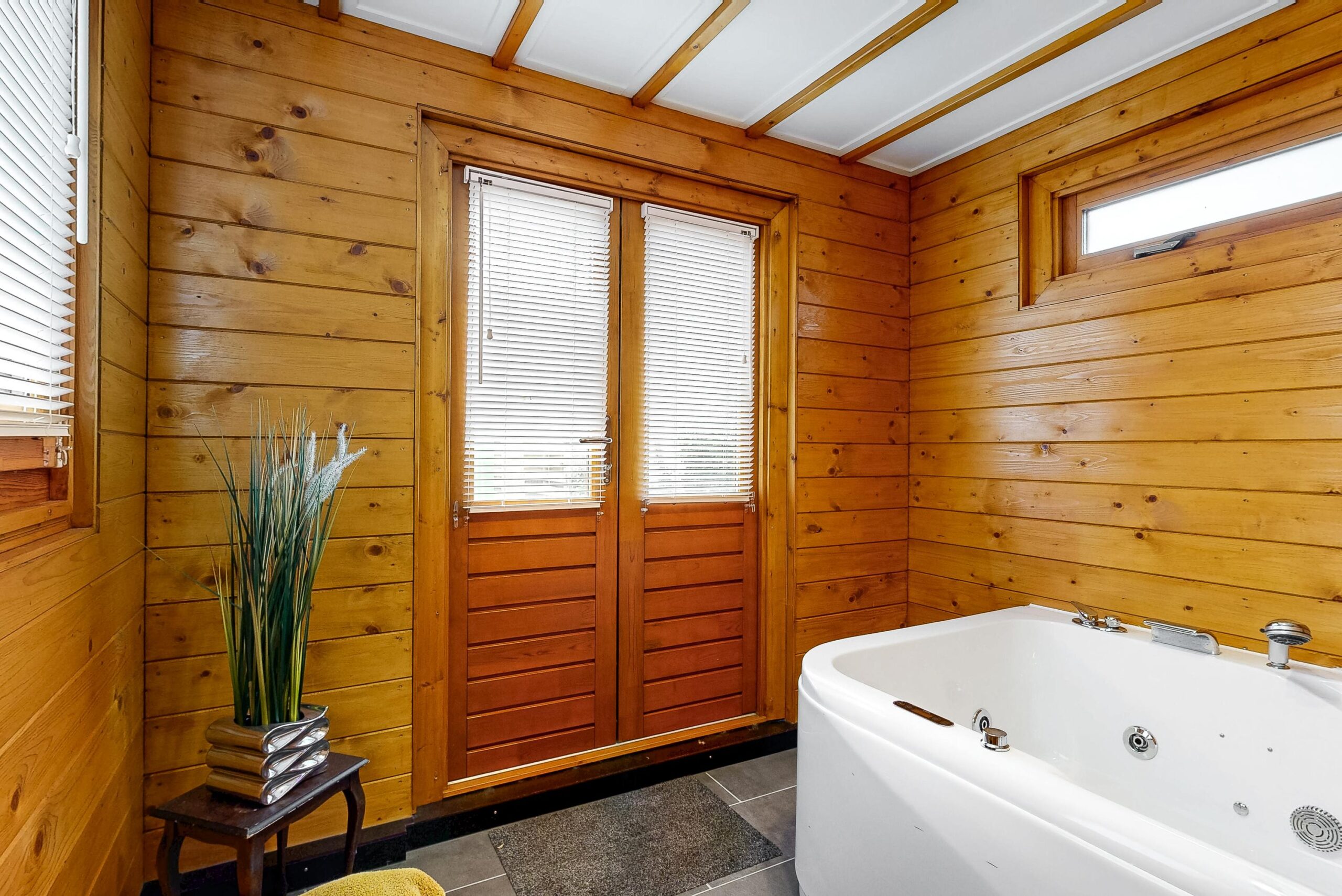 met badkamer voorzien van toilet, douchecabine en wastafelmeubel, twee slaapruimtes en tuinkamer met jacuzzi.