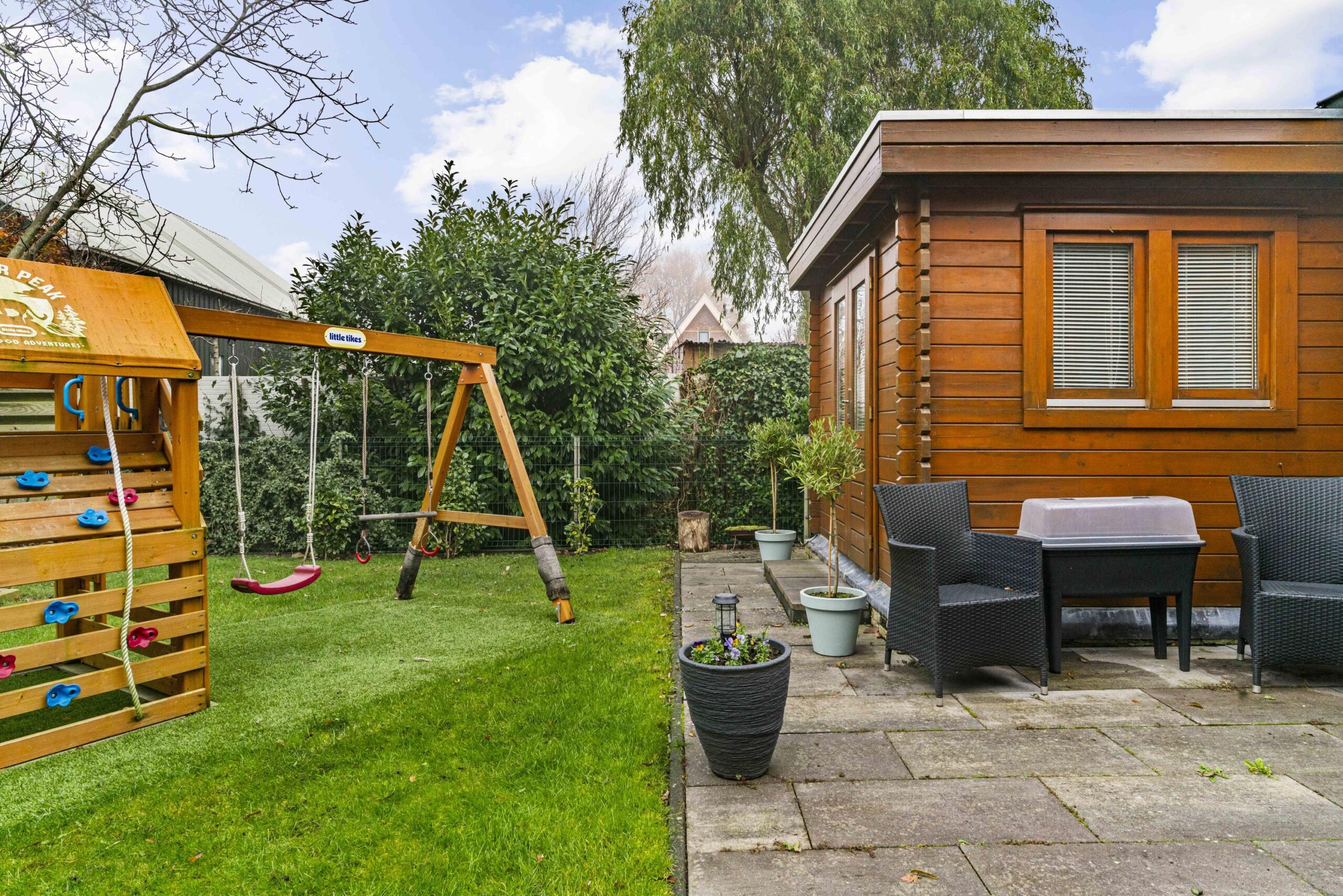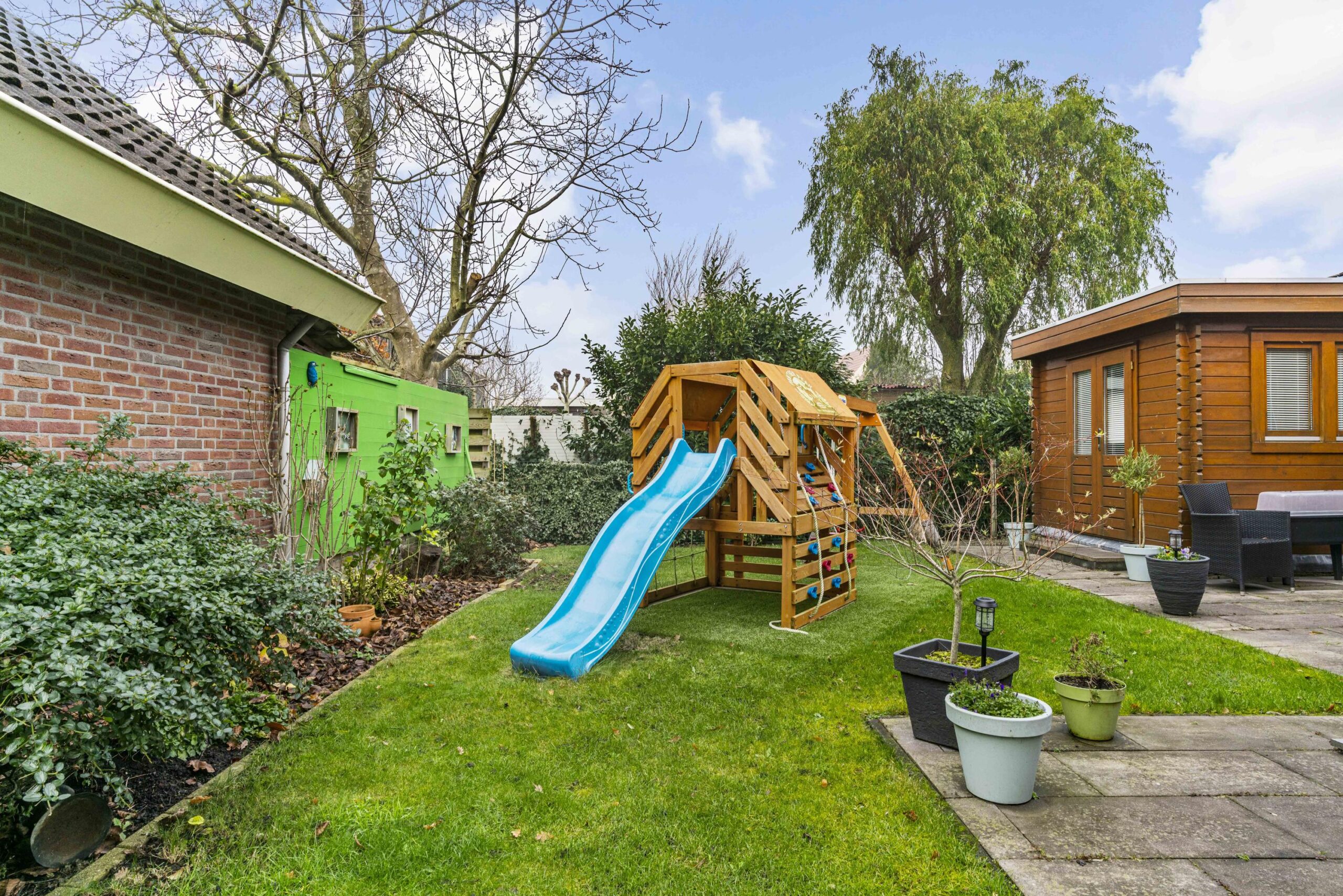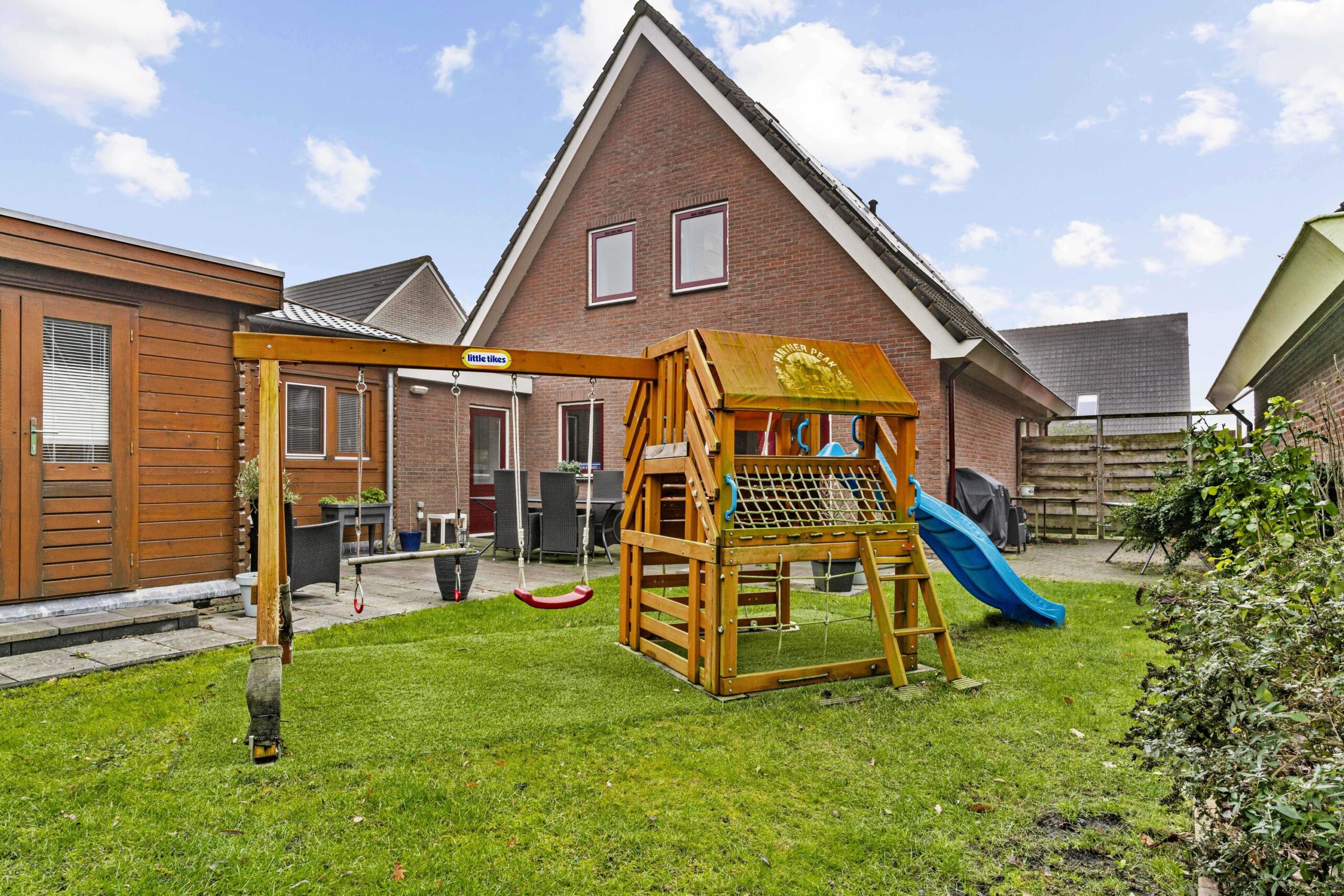 Kindvriendelijk gelegen vrijstaande woning in compleet dorp met gastenverblijf en privacy volle tuin.