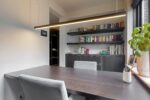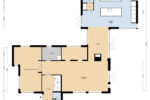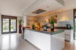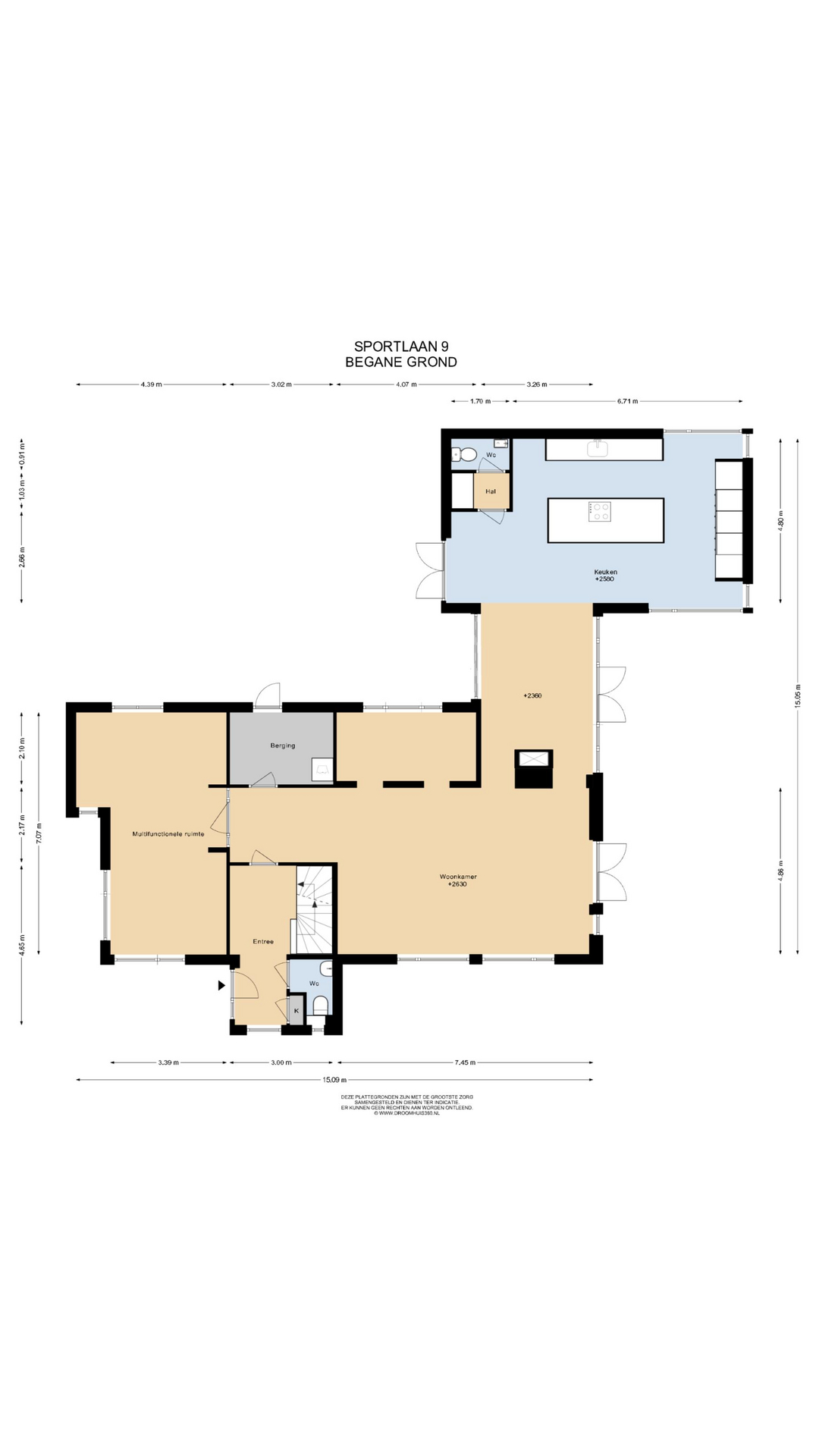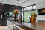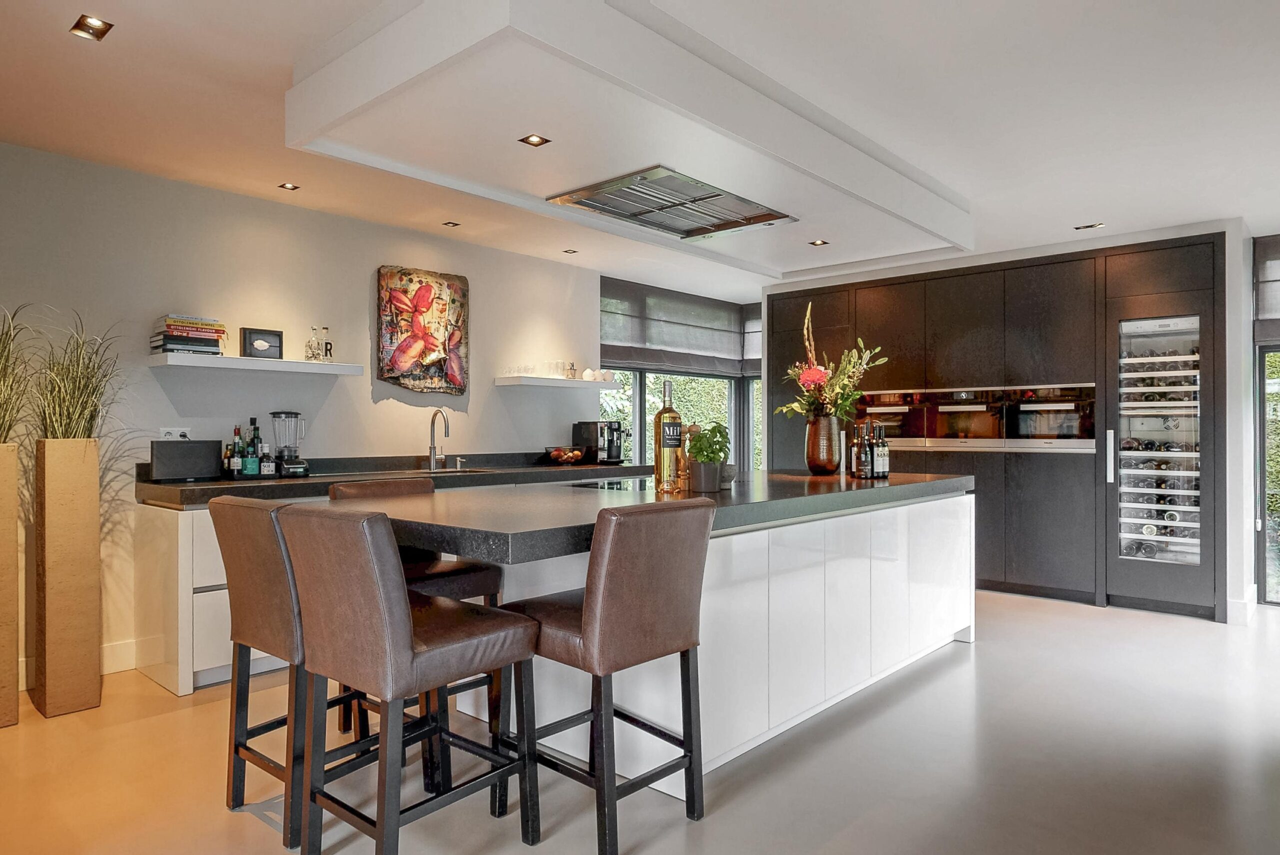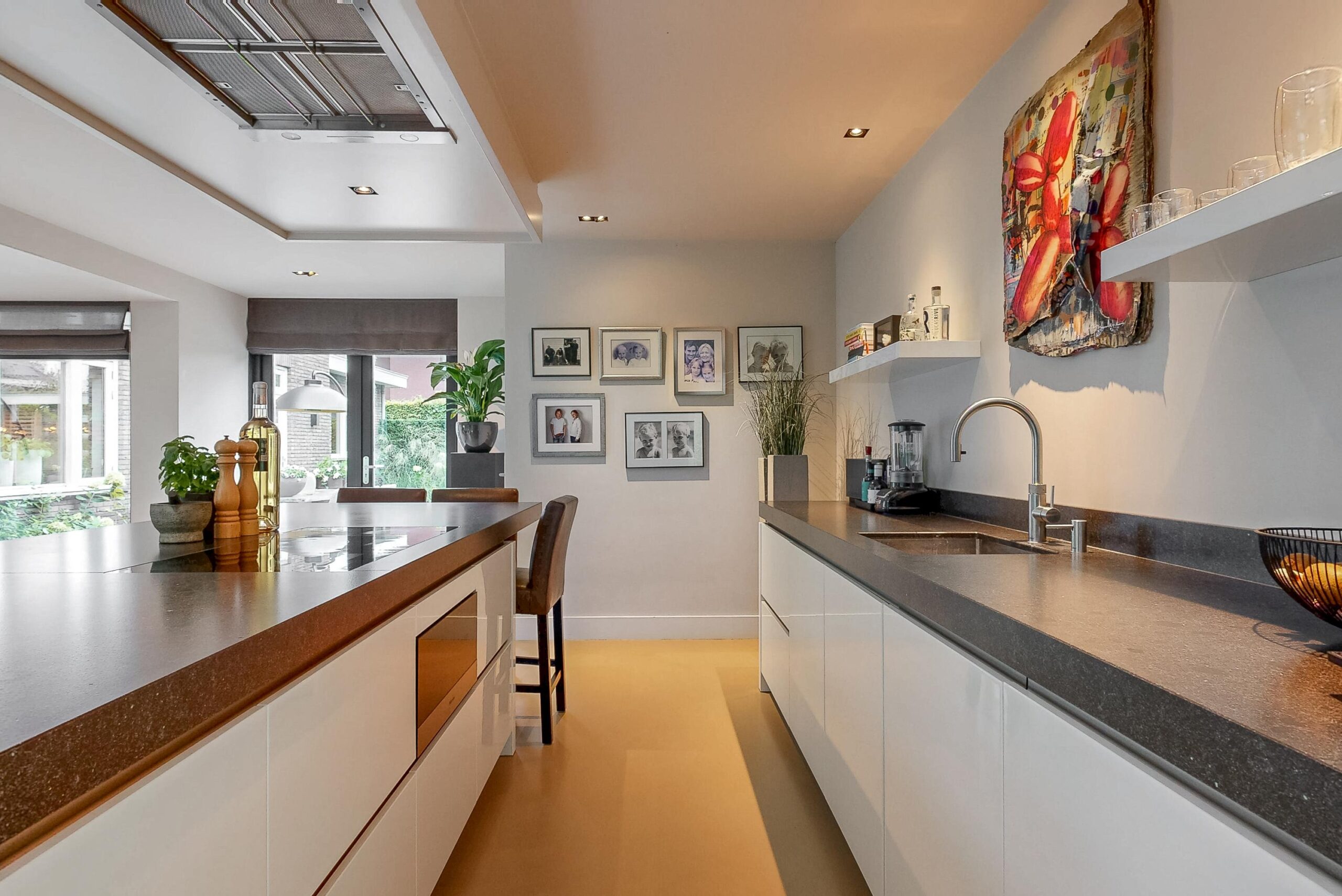 Indeling: hal met toilet en toegang naar royale wijnkelder met tevens de opstelling voor de wko-installatie, multifunctionele loungeruimte, bijkeuken, studie-/werkruimte, heerlijke woonkamer met open haard, woonkeuken met 2e gashaard en uitgebreide keukenunit met kookeiland in wit hoogglans/zwart eiken voorzien van een composiet aanrechtblad en inbouw koelkast, vaatwasser, vriezer, combimagnetron, stoomoven, heteluchtoven, warmhoudlade, inductiekookplaat, afzuiging en wijnklimaatkast, 3x dubbele openslaande deuren naar de tuin, 2e bijkeuken en toilet.