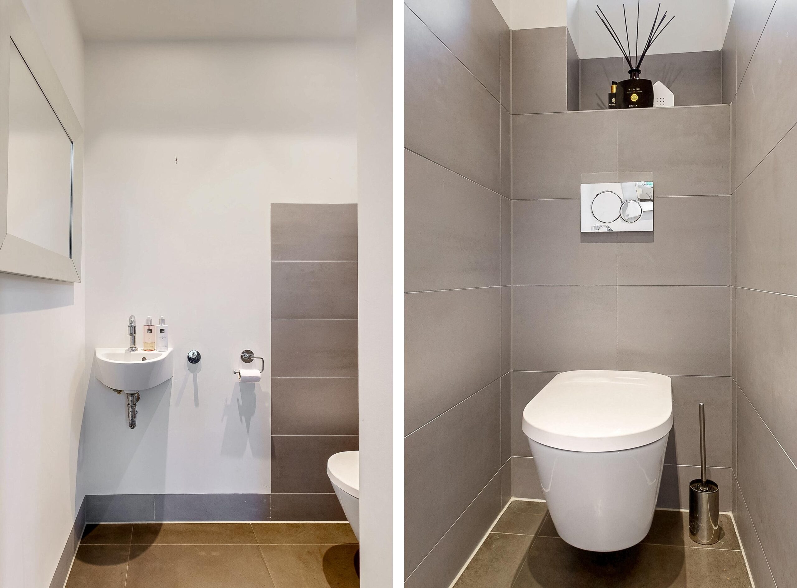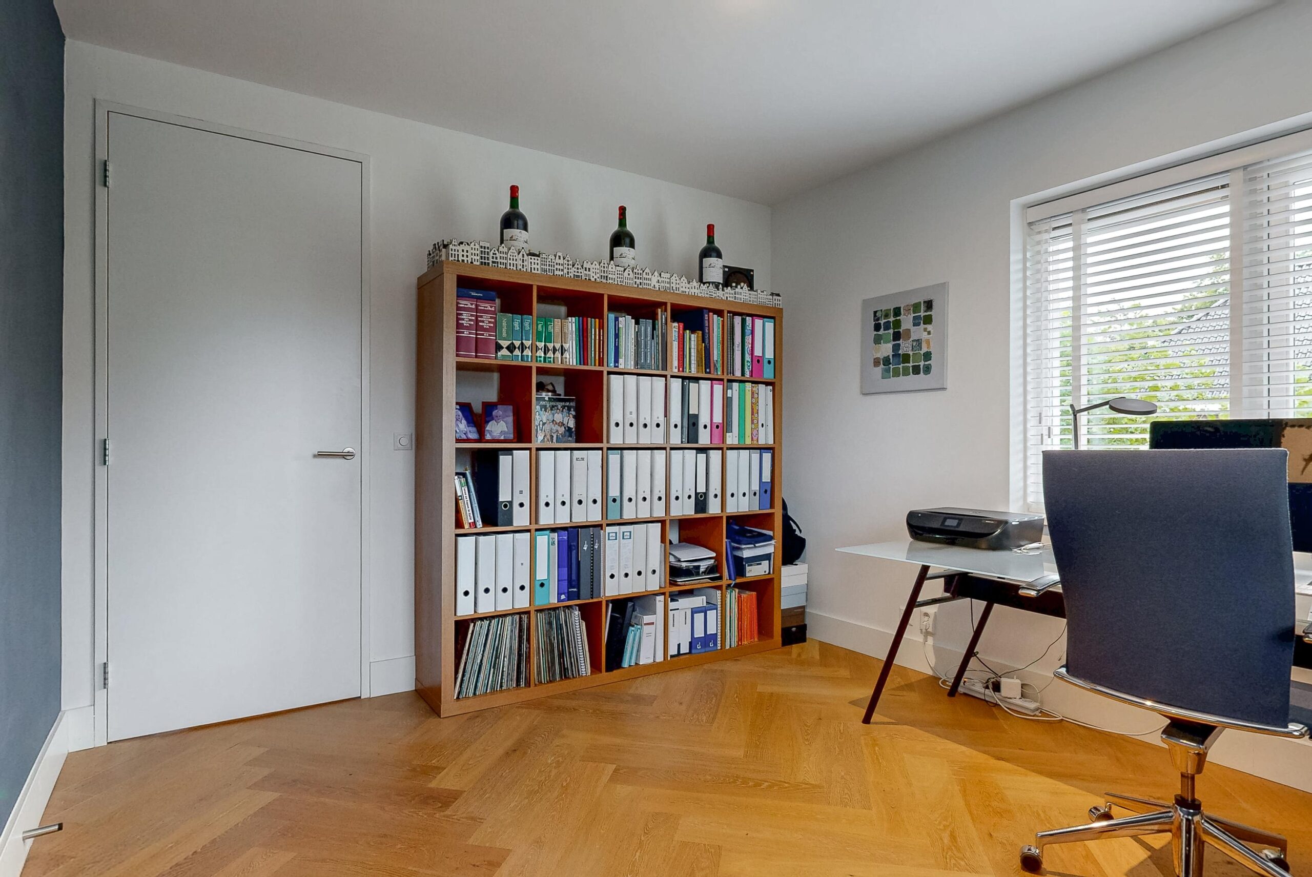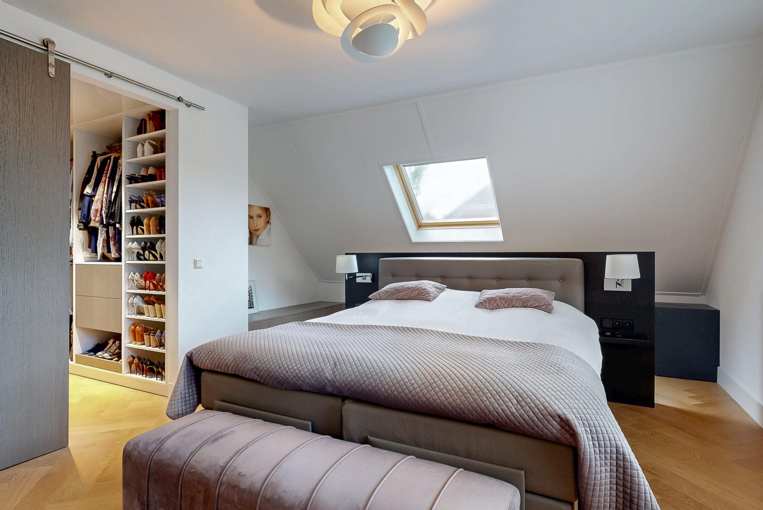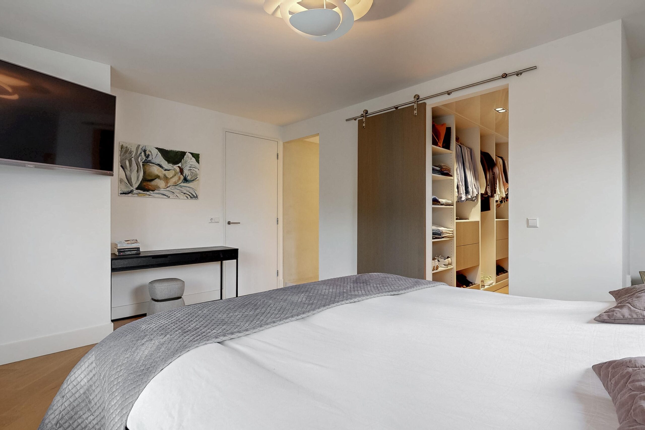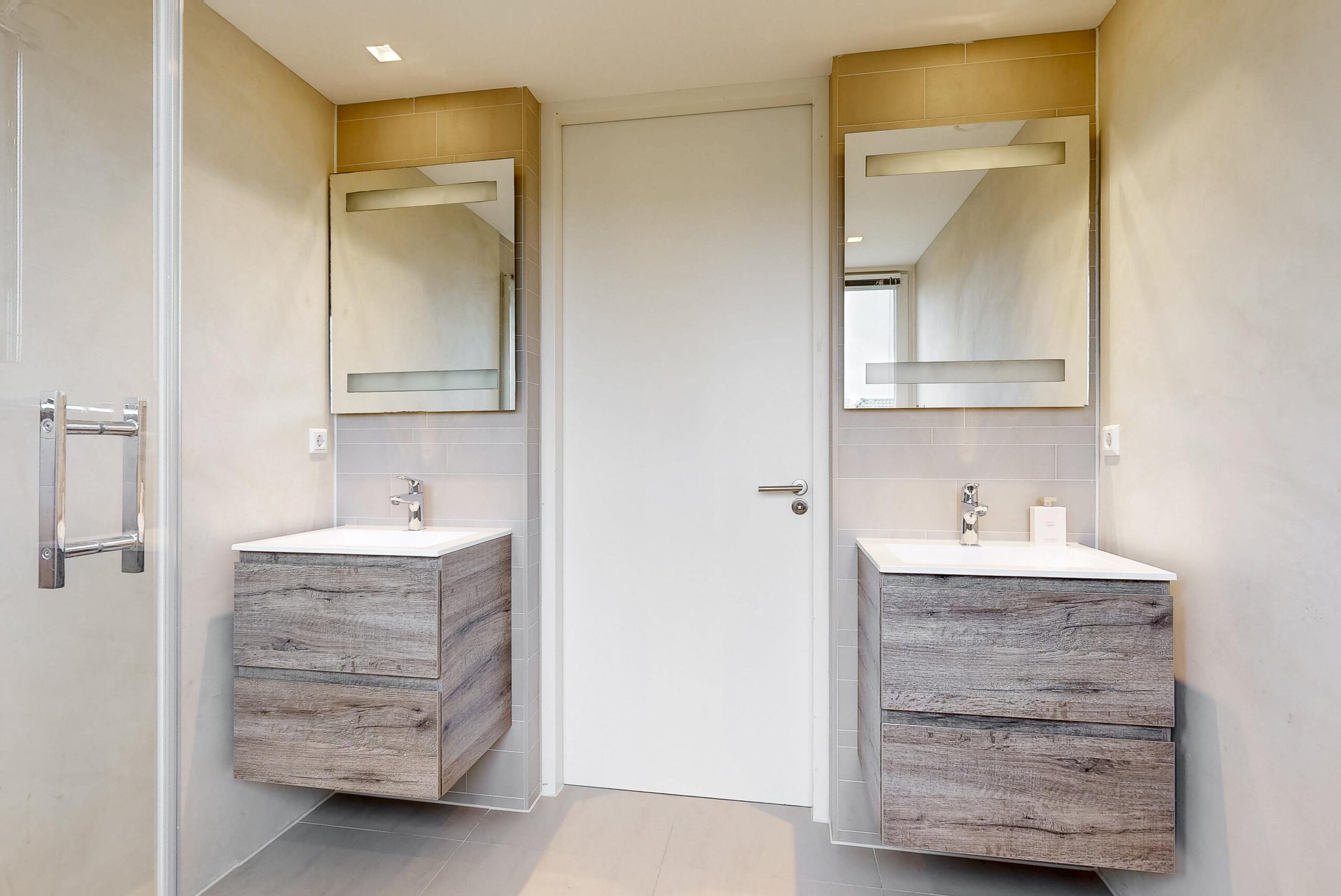 Eerste verdieping: ruime overloop, separaat 3e toilet, 2 slaapkamers, royale 3e slaapkamer met inloopkast en toegang tot luxe badkamer met duodouche, dubbele wastafel in meubel en 4e toilet.