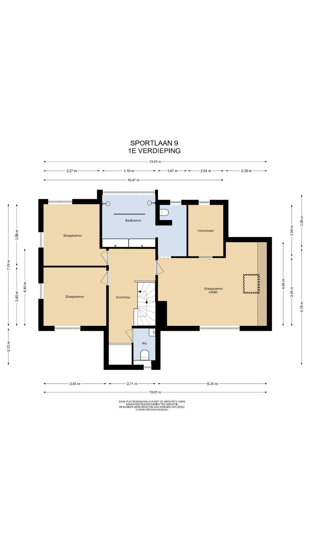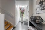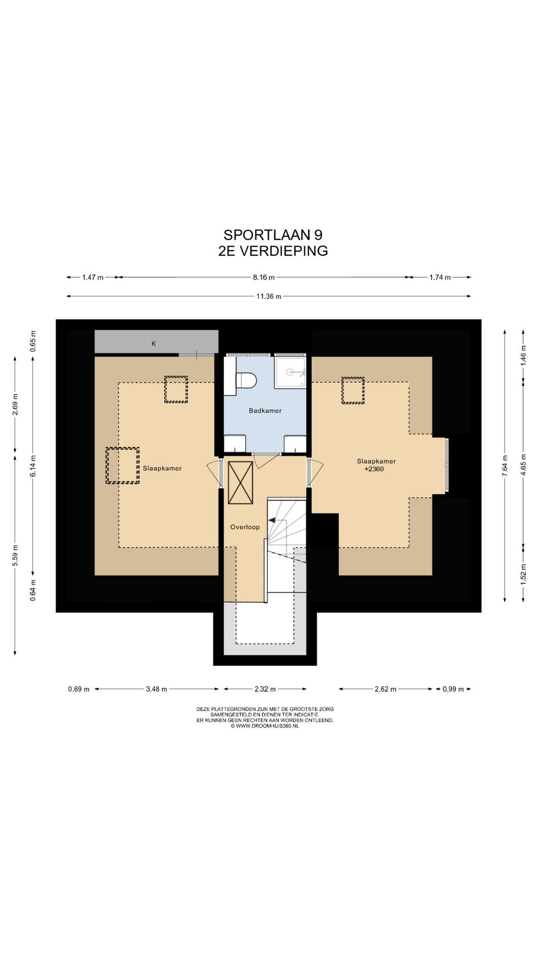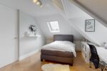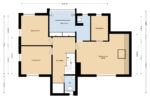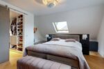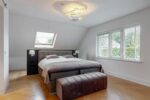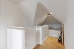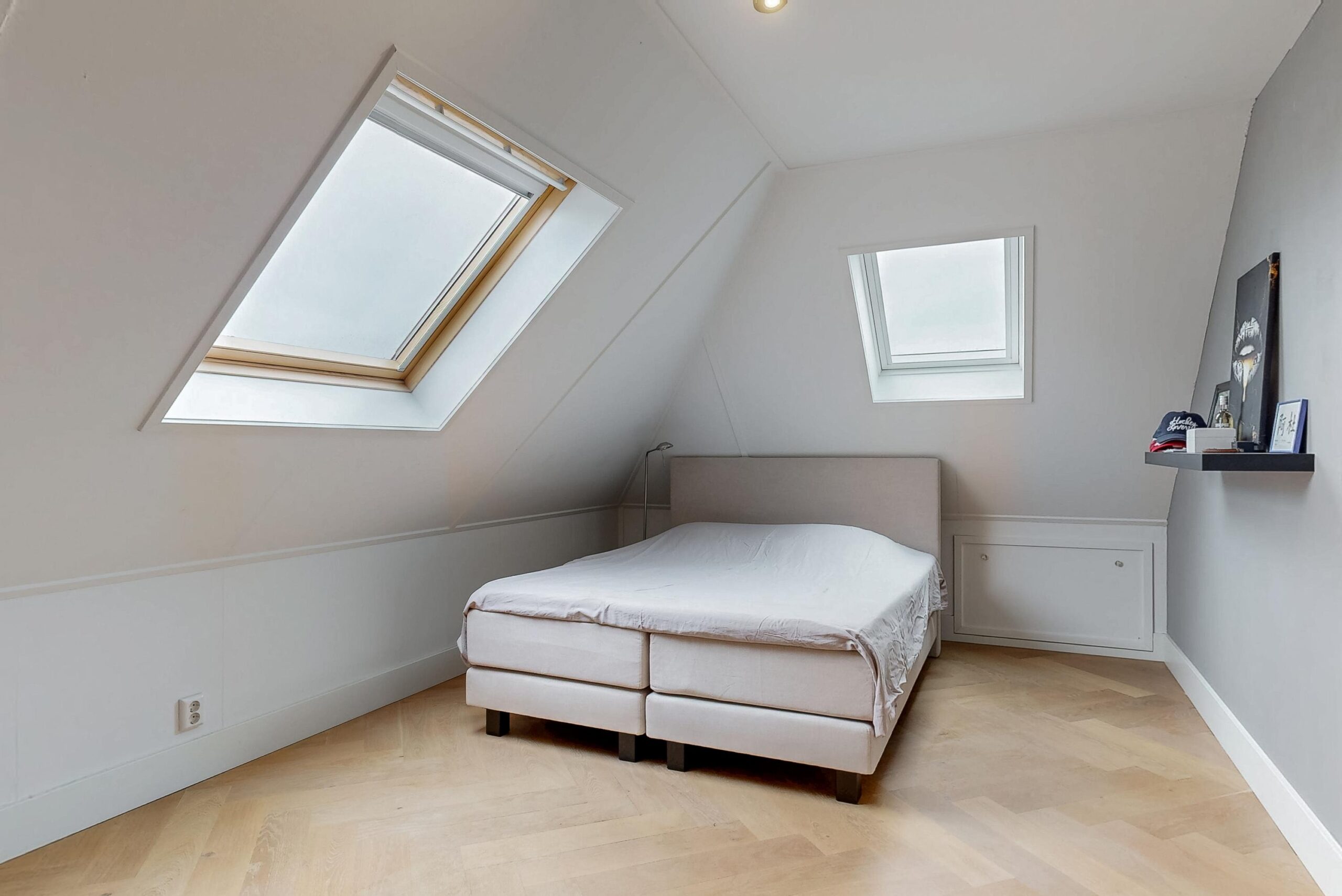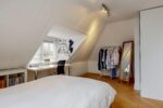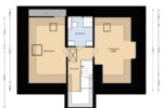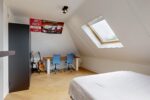 Tweede verdieping: overloop, 2e badkamer met douchecabine, 5e toilet en twee wastafelmeubels, ruime 4e slaapkamer en 5e slaapkamer met dakkapel. Beide slaapkamers zijn over de volle breedte van het huis. Via de vlizotrap is de bergvliering bereikbaar.